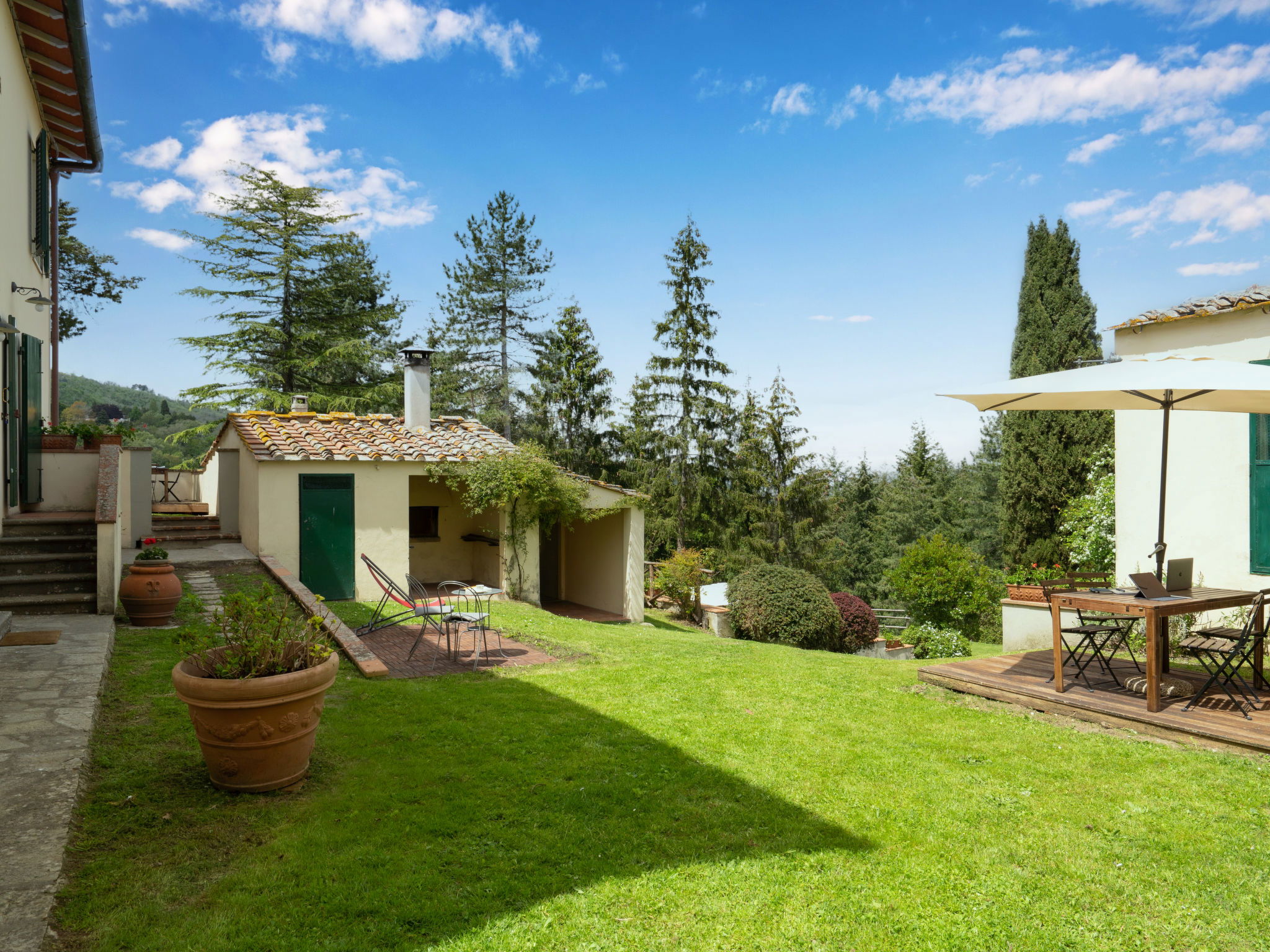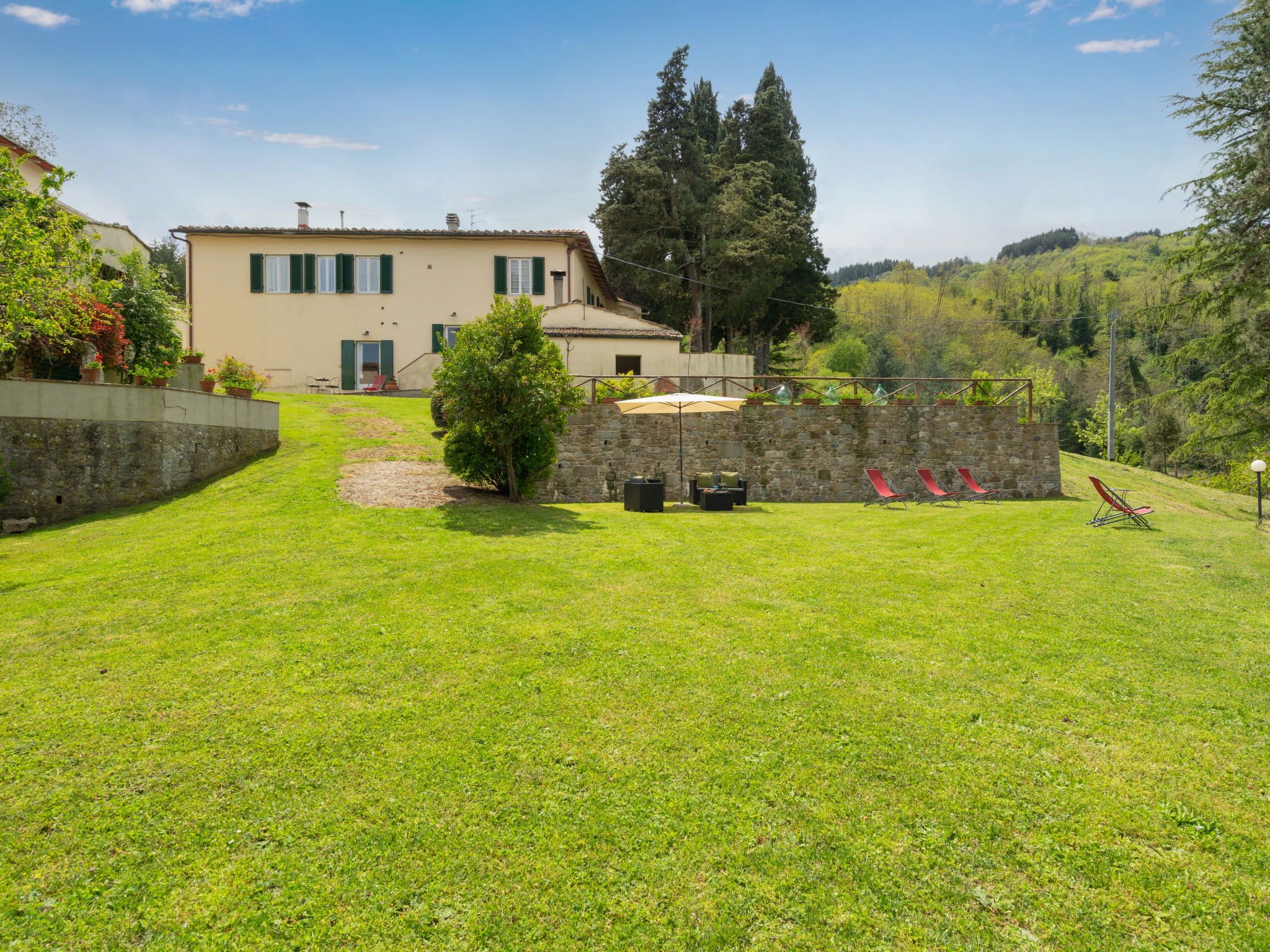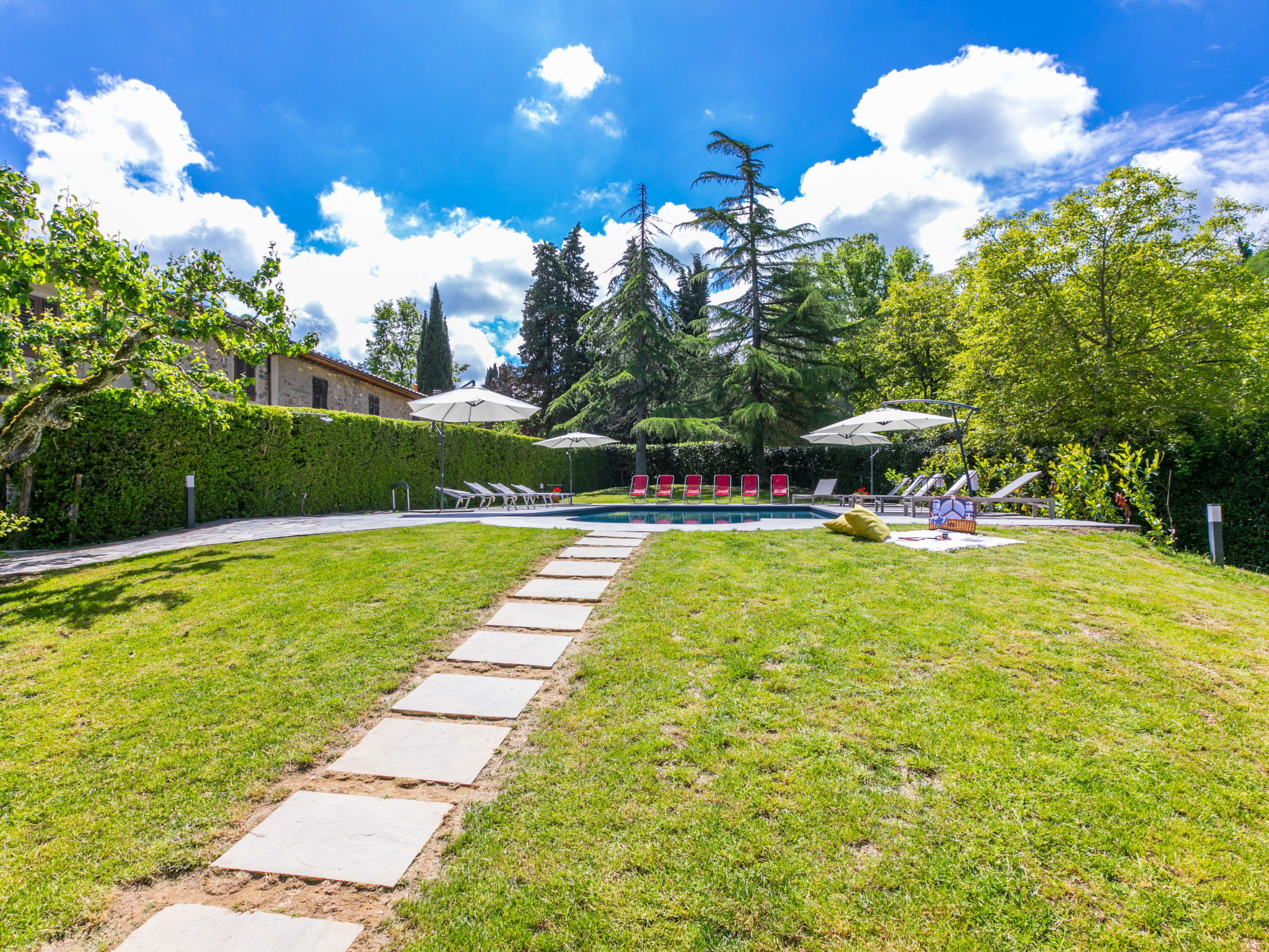 Manor house "Castagnoli", 650 m a.s.l., surrounded by fields and vineyards. 12 km from the centre of Greve in Chianti, 2 km from the centre of Lucolena, in a secluded position, in the countryside. Private: property 40 ha, park, beautiful, well-kept garden (not fenced) with flowers and trees, lawn for sunbathing, swimming pool (10 x 5 m, depth 100 - 200 cm, seasonal availability: 10.May. - 10.Oct.). Outdoor shower, terrace, barbecue, pool maintenance by the owner/gardener. 500 m long bumpy motor access (via unmade road). Parking on the premises. Shop 2 km, supermarket 10 km, bus stop 3 km, sandy beach "Marina di Cecina" 85 km. Golf course (18 hole) 20 km, walking paths from the house 50 m. Nearby attractions: Siena 30 km, Volterra 44 km, Firenze 50 km, Arezzo 75 km. Please note: car recommended. Baby equipment (included). Groups of teenagers on request only.