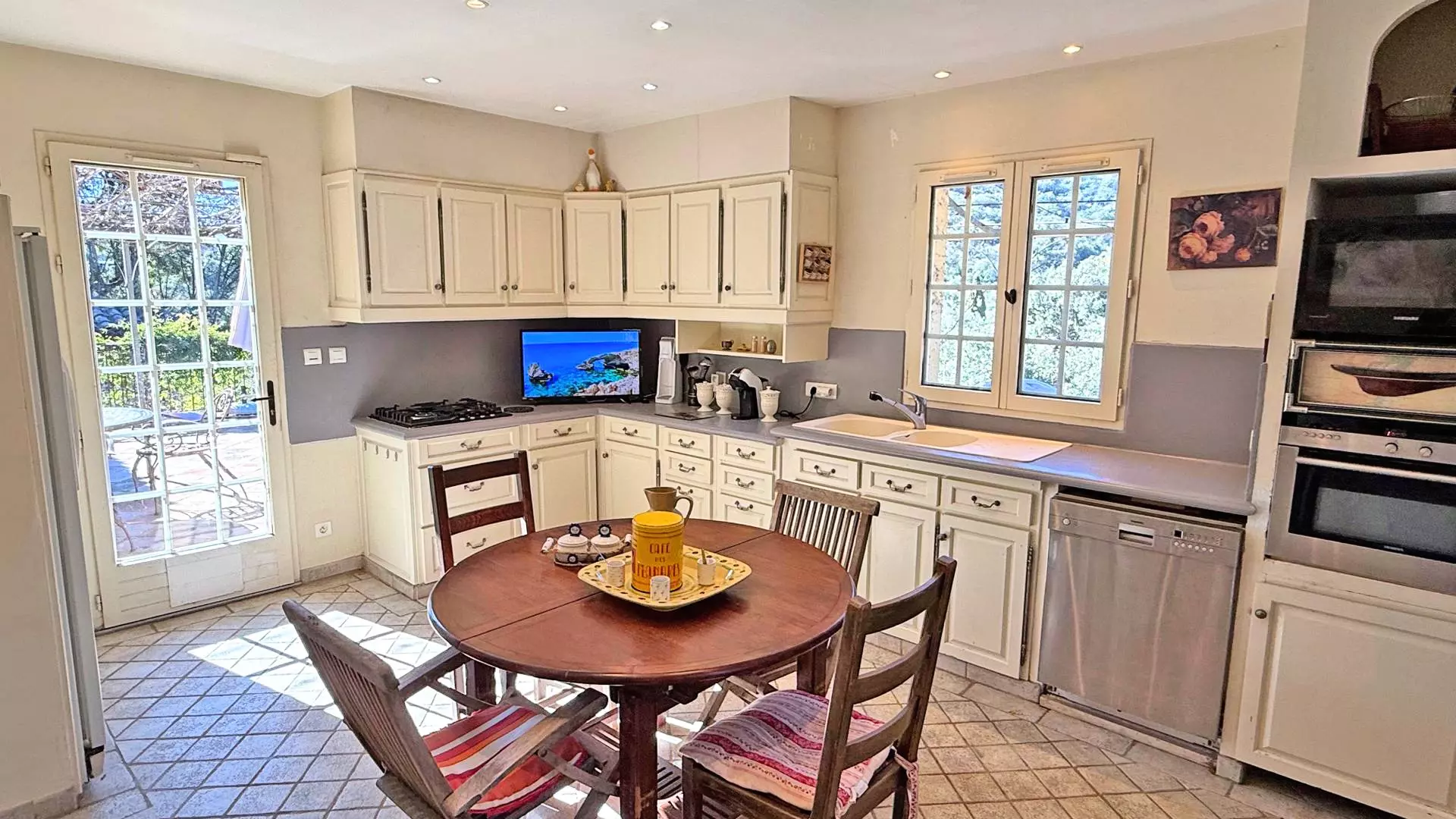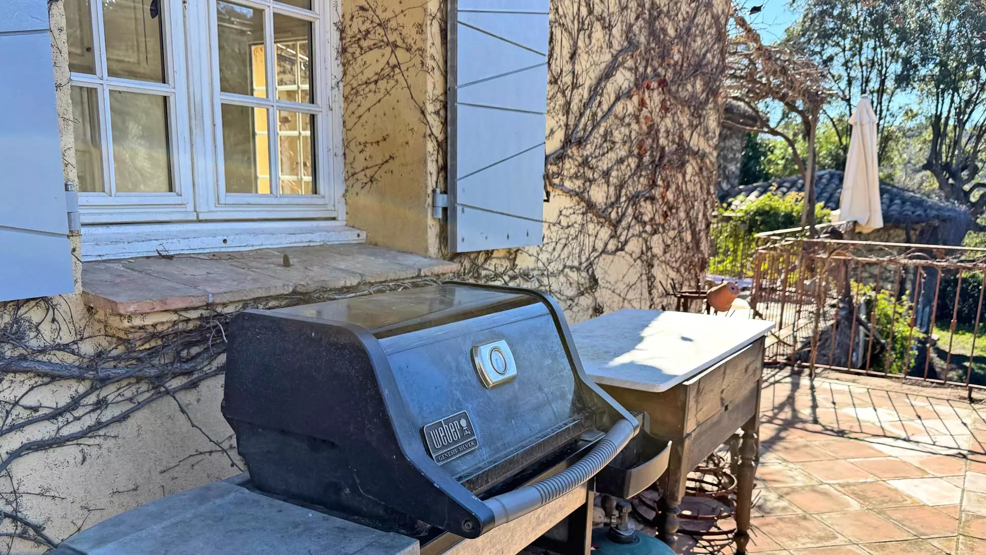 - West-facing terrace with tables, chairs, parasols and gas barbecue, access to the kitchen and dining room