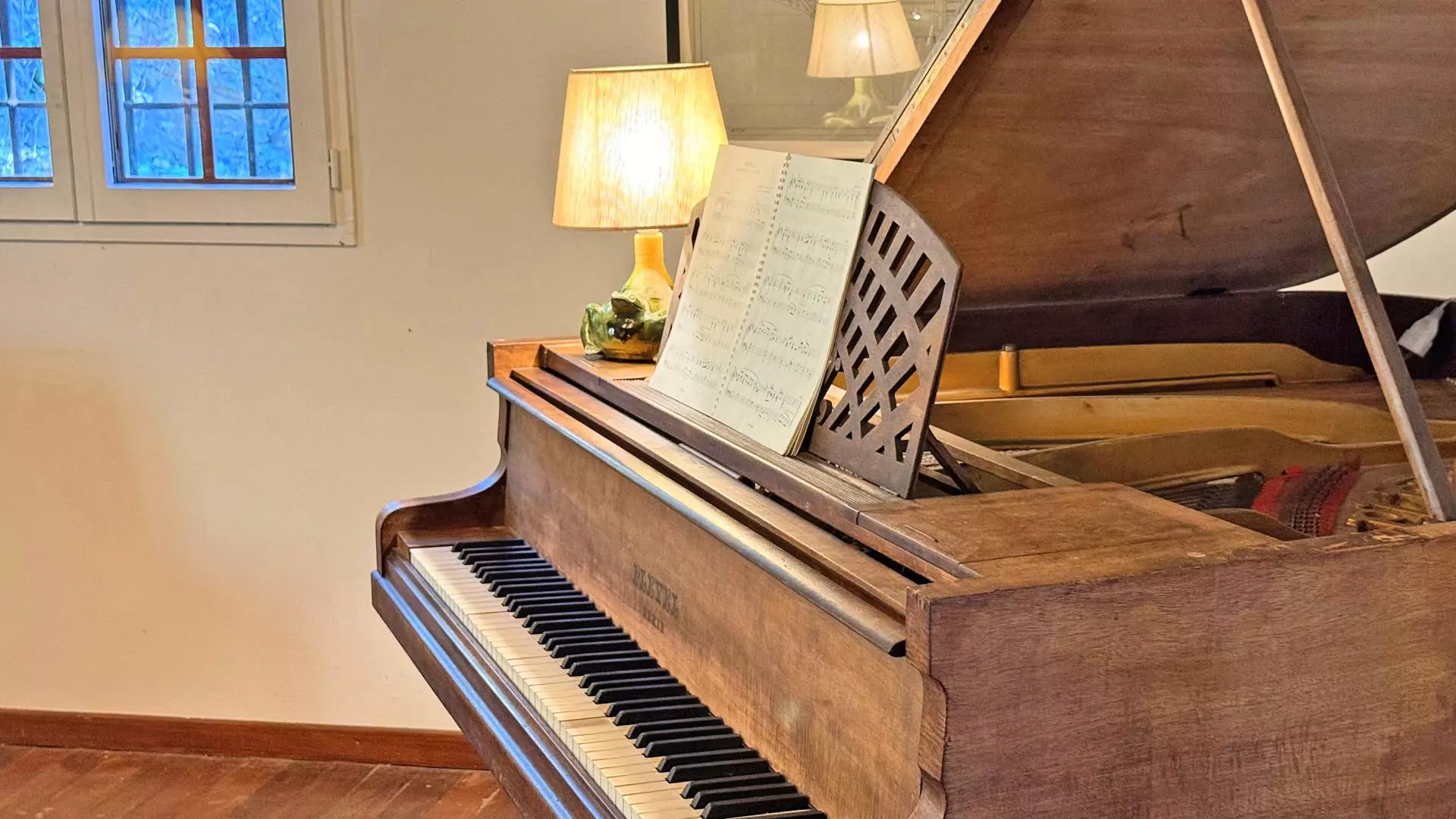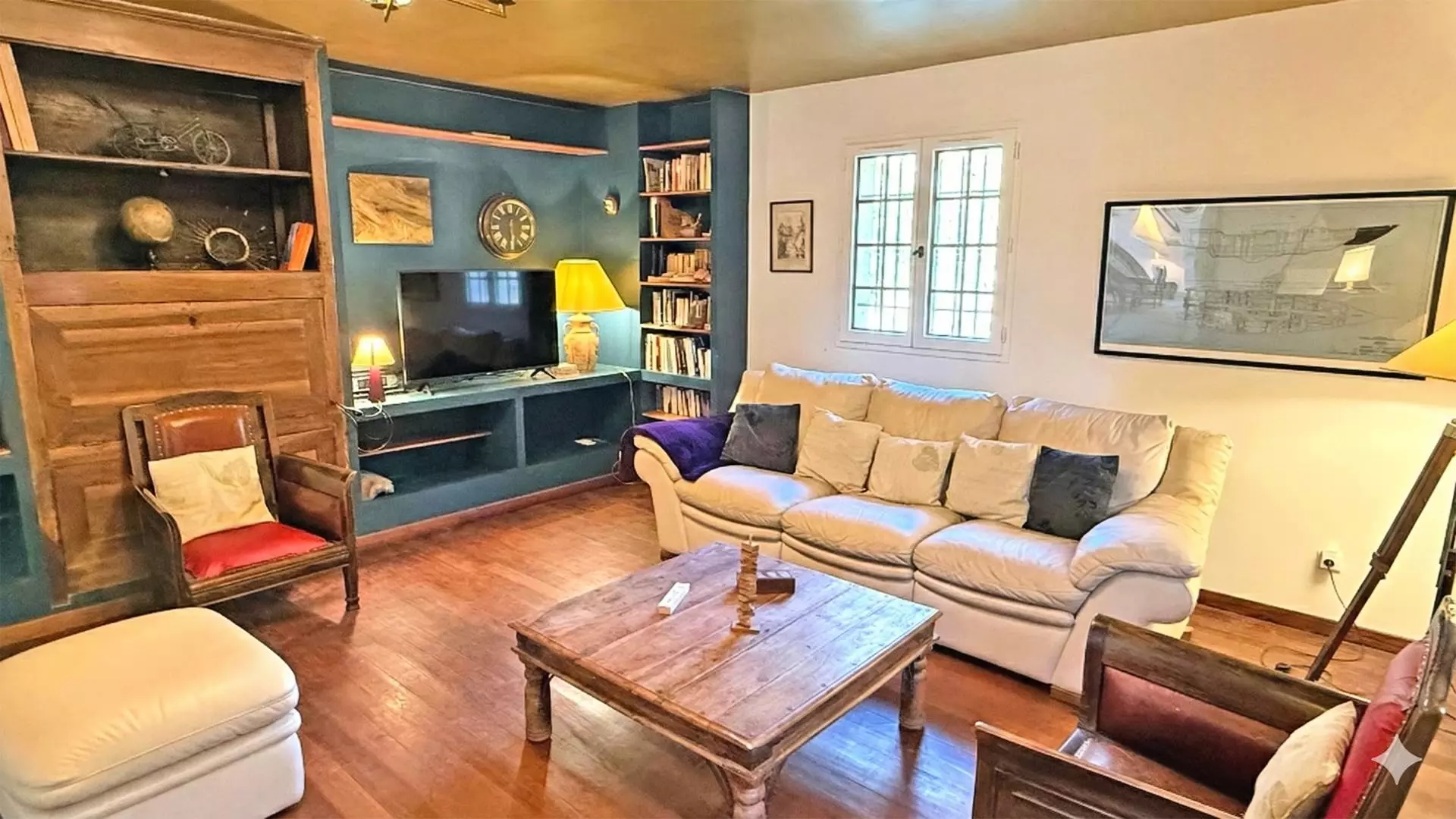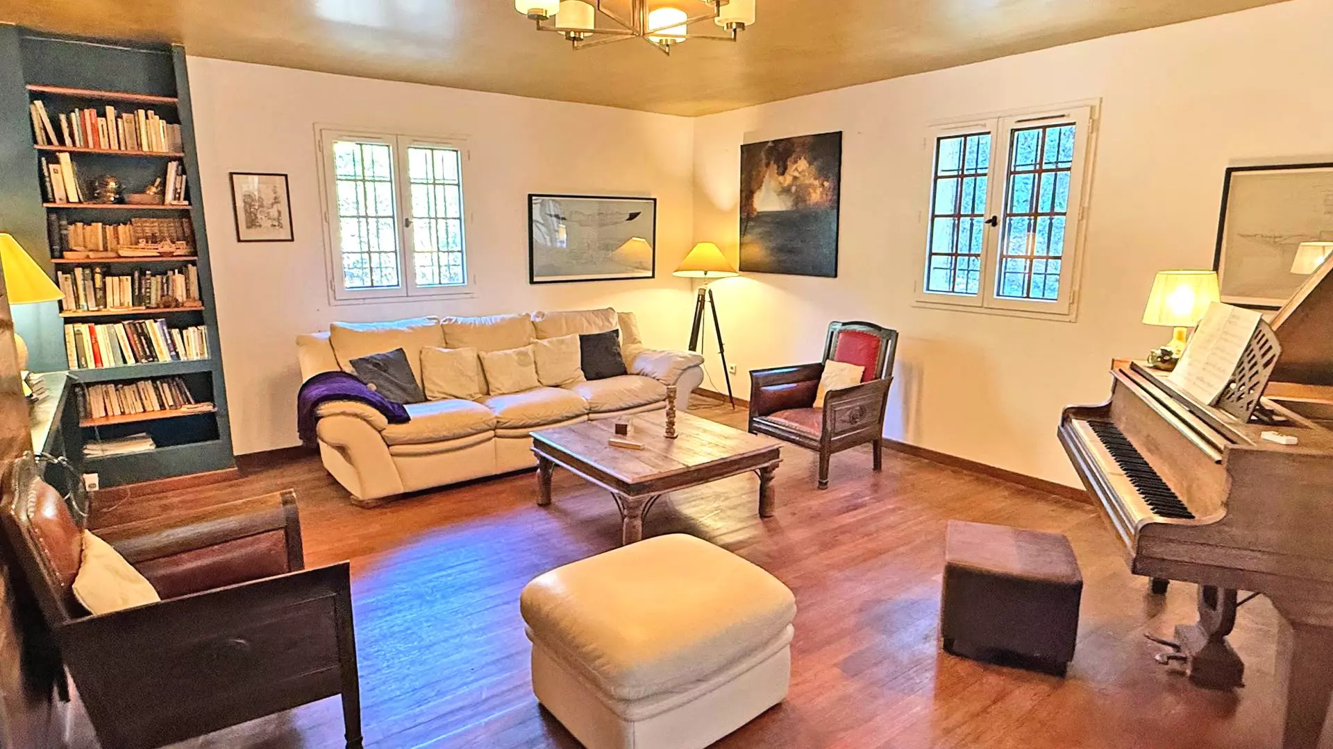 - Large reading and television room with sofa, armchairs and piano