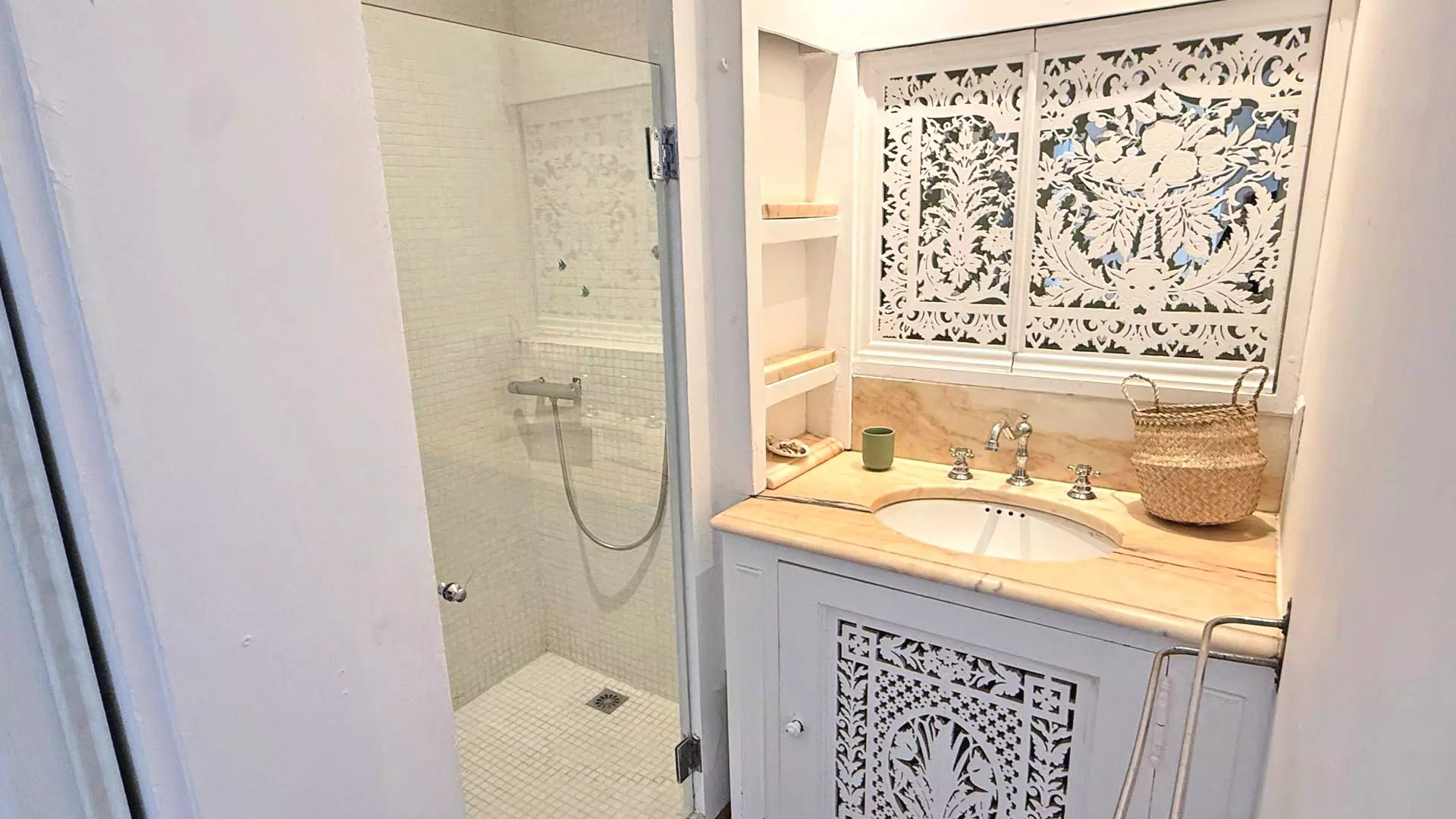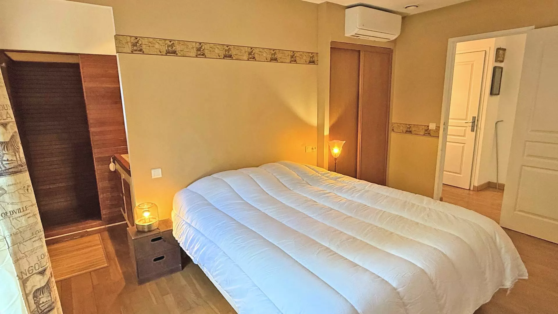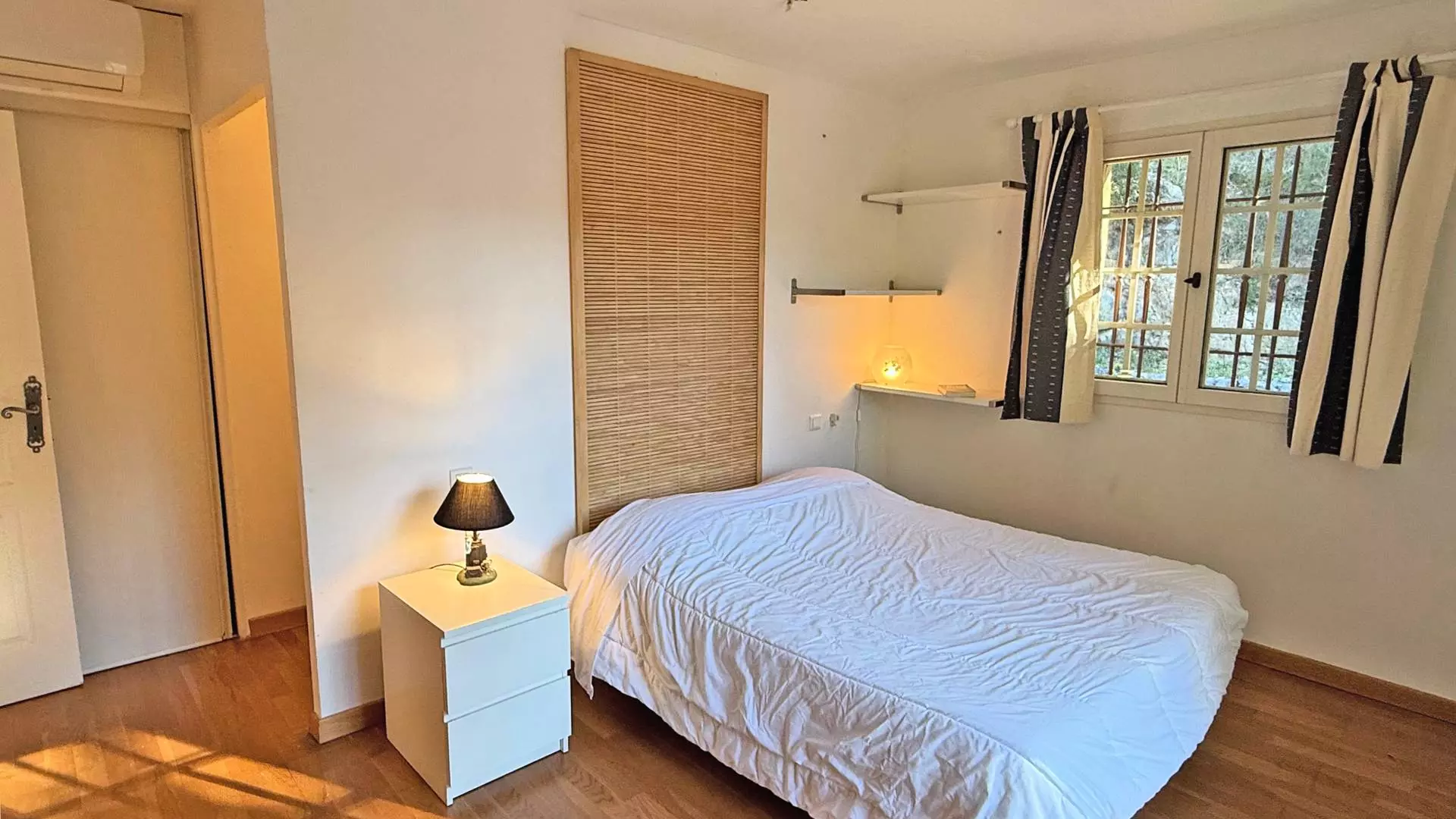 - Bedroom 2 (air-conditioned): Double bed (140cm), wardrobe, and en-suite bathroom with shower and vanity unit - External access by the pool