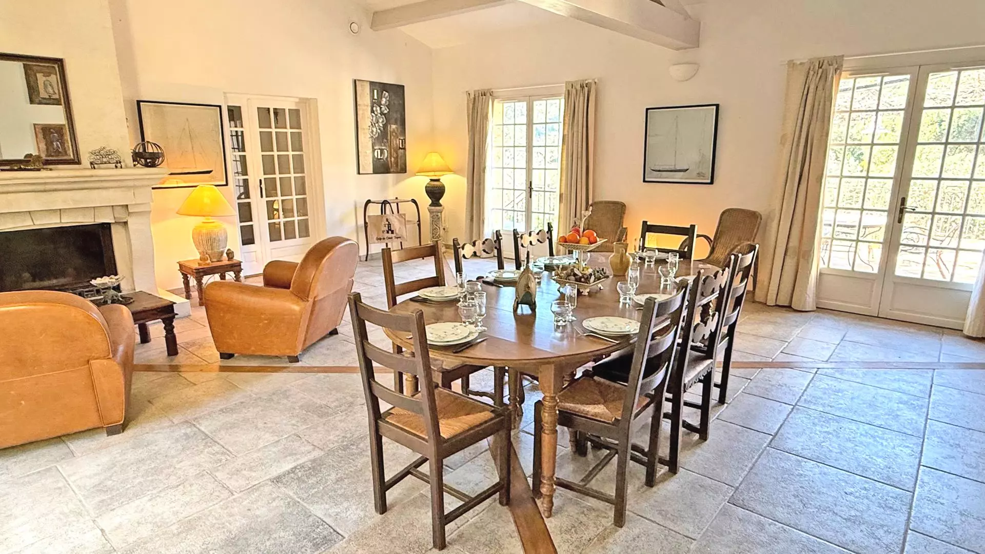 - Large dining room including a large dining table and chairs for 10/12 people, armchairs and decorative fireplace as well as access to the east and west-facing outdoor terraces