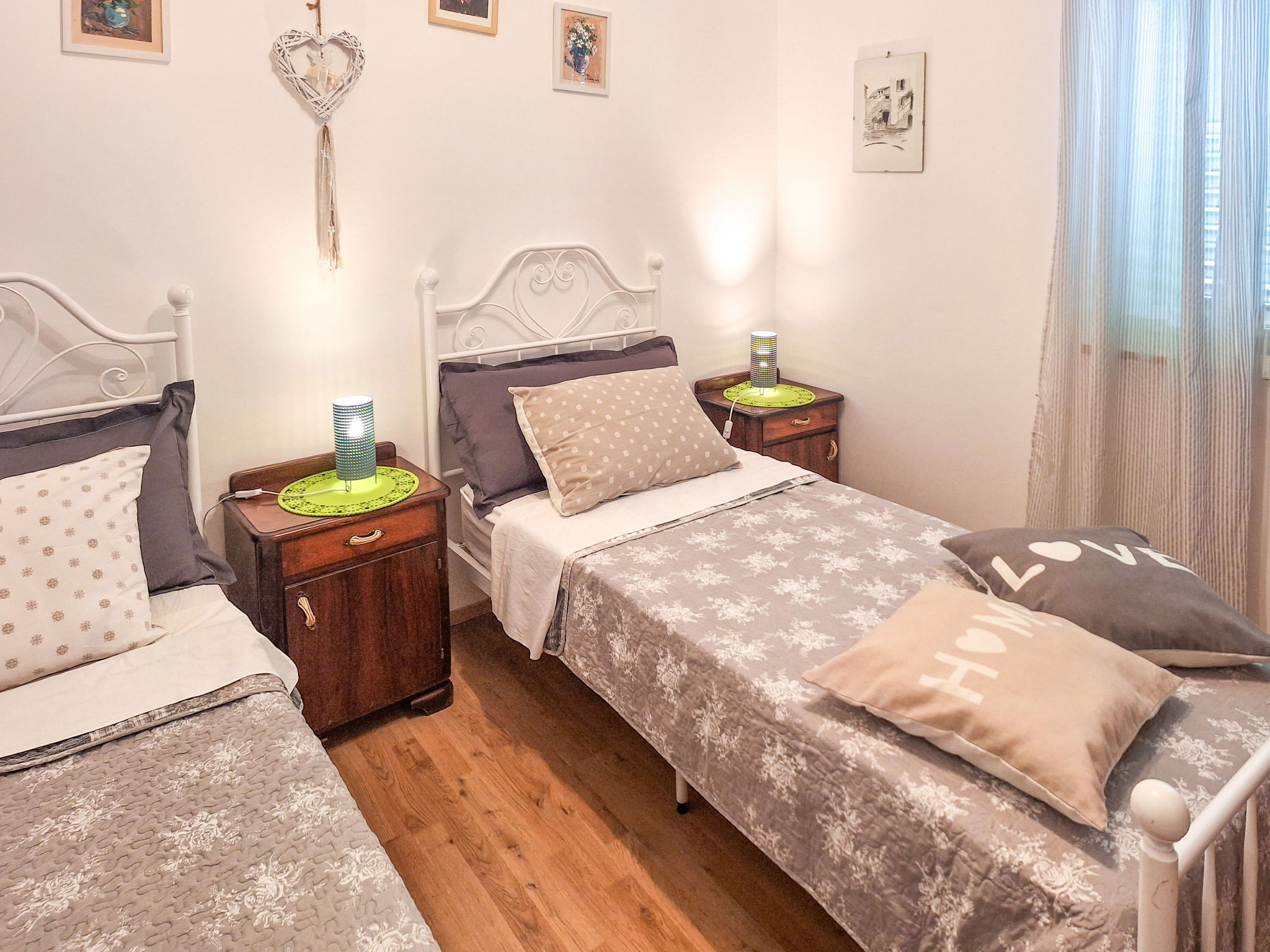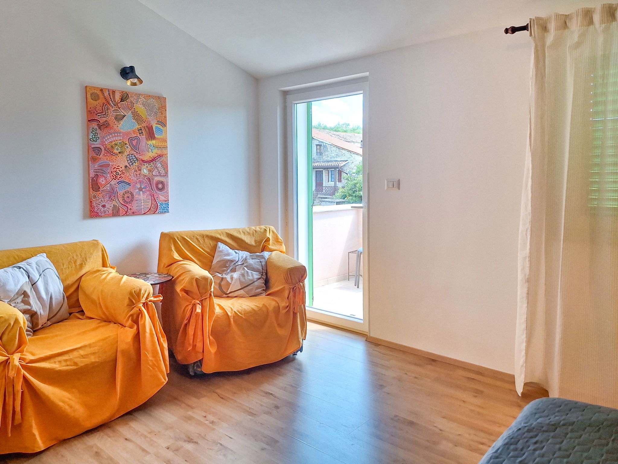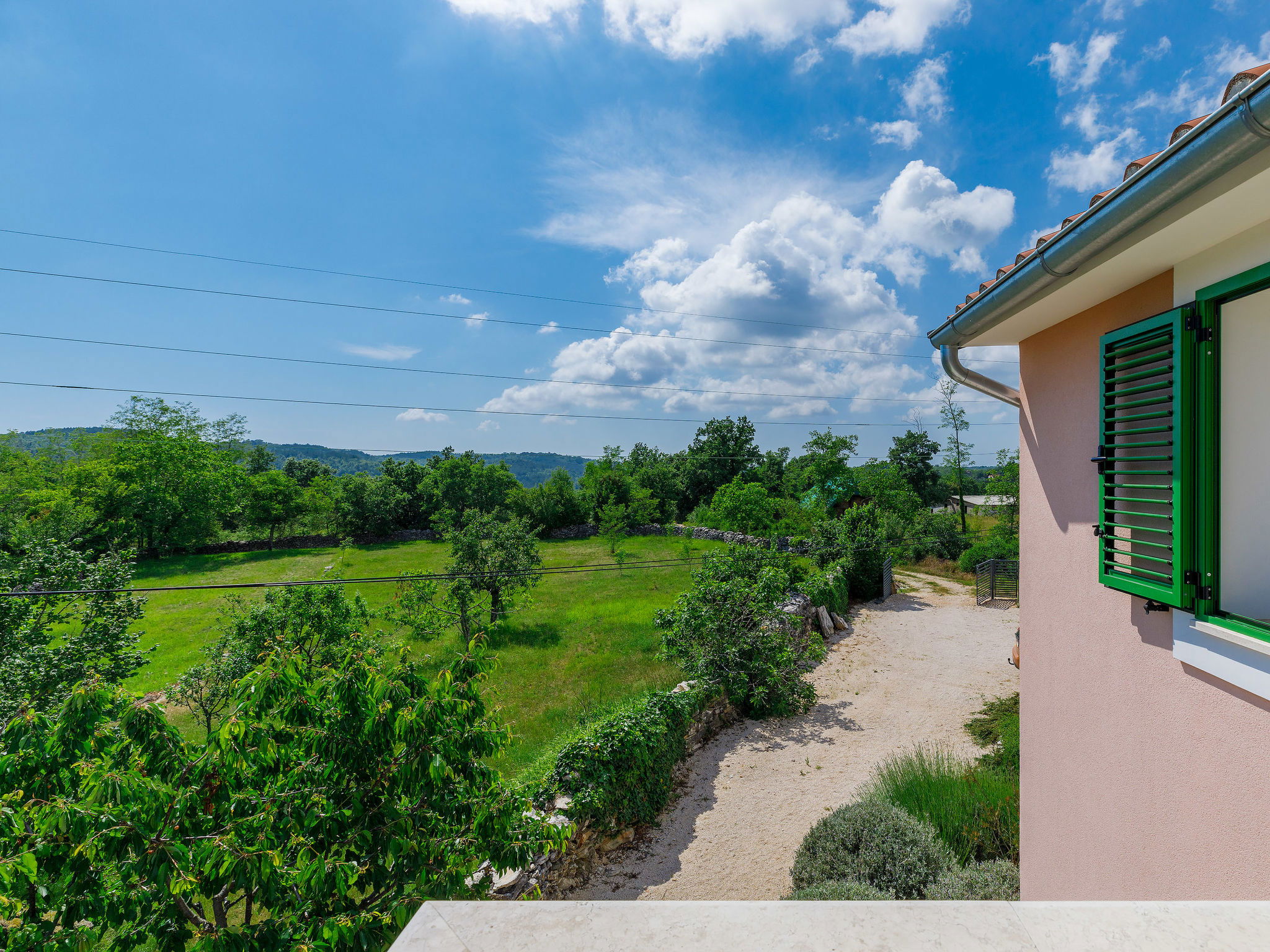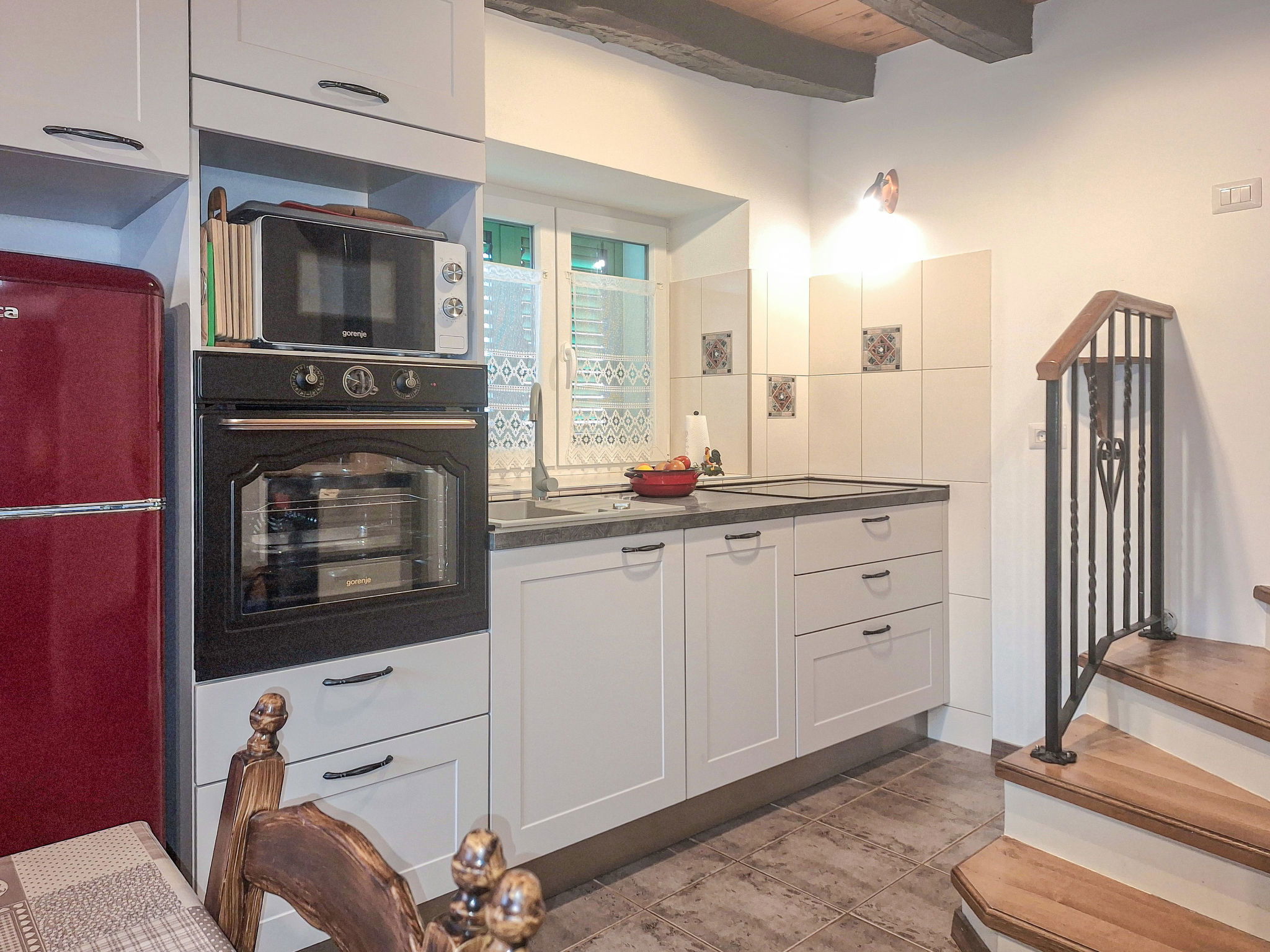 4-room house 120 m2 on 2 levels. Living/dining room with satellite TV. Living room with 1 double sofabed (140 cm, length 200 cm). Open kitchen (oven, dishwasher, 4 ceramic glass hob hotplates, microwave, electric coffee machine). Shower/WC. Upper floor: entrance hall with air conditioning. 1 room with 1 french bed (180 cm, length 200 cm). Exit to the balcony. 1 room with 2 beds (90 cm, length 200 cm). Shower/WC. Balcony 5 m2. Deck chairs. View of the garden and the countryside. Facilities: safe, baby cot (extra), hair dryer. Internet (WiFi, free). 1 small pet/ dog allowed. UP/I-335-03/18-01/94