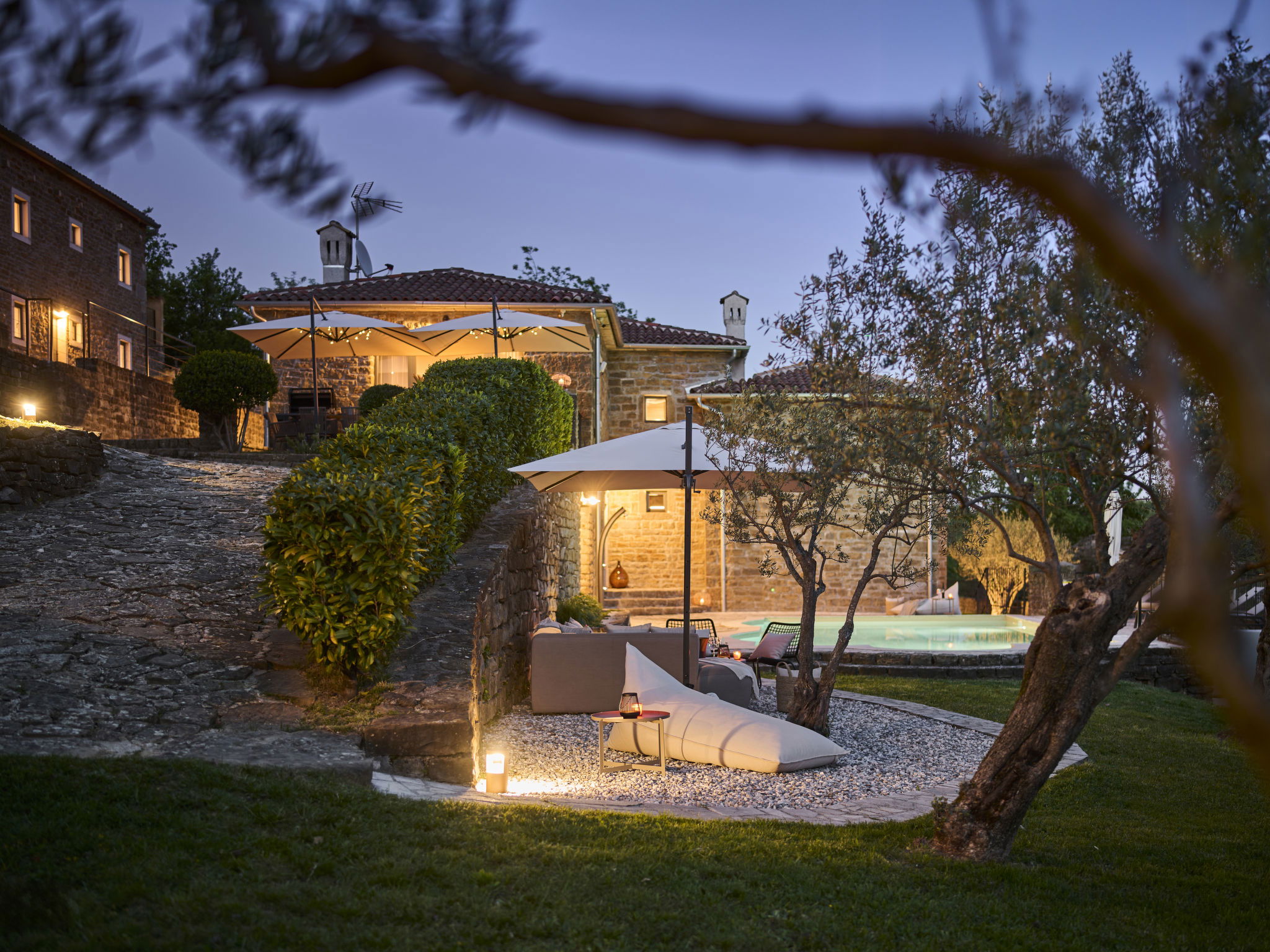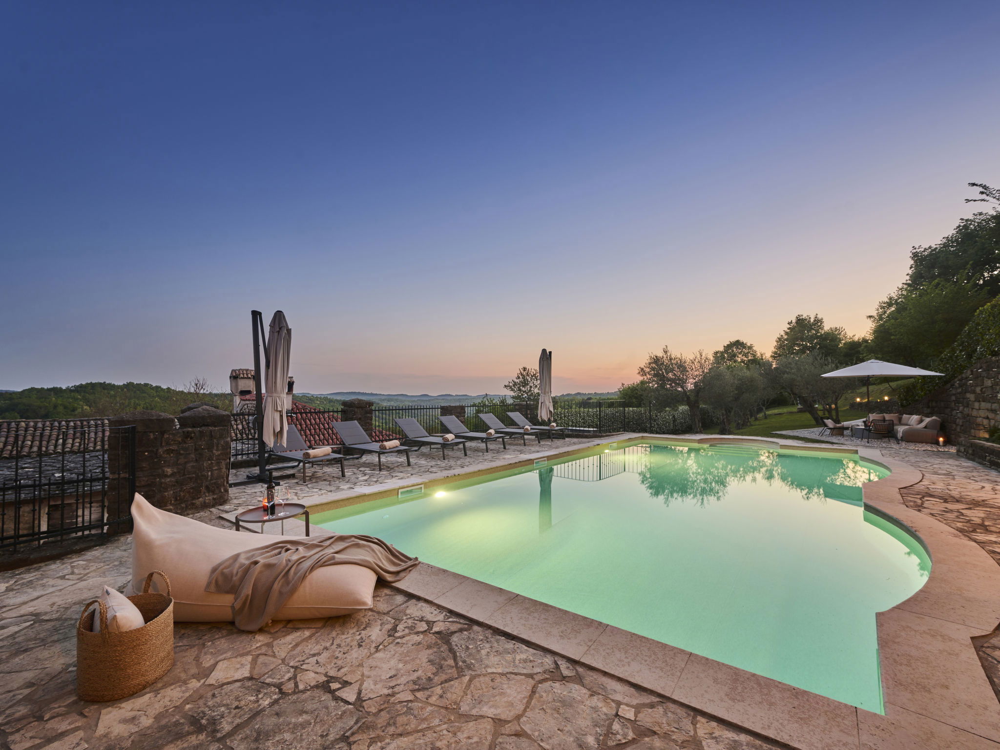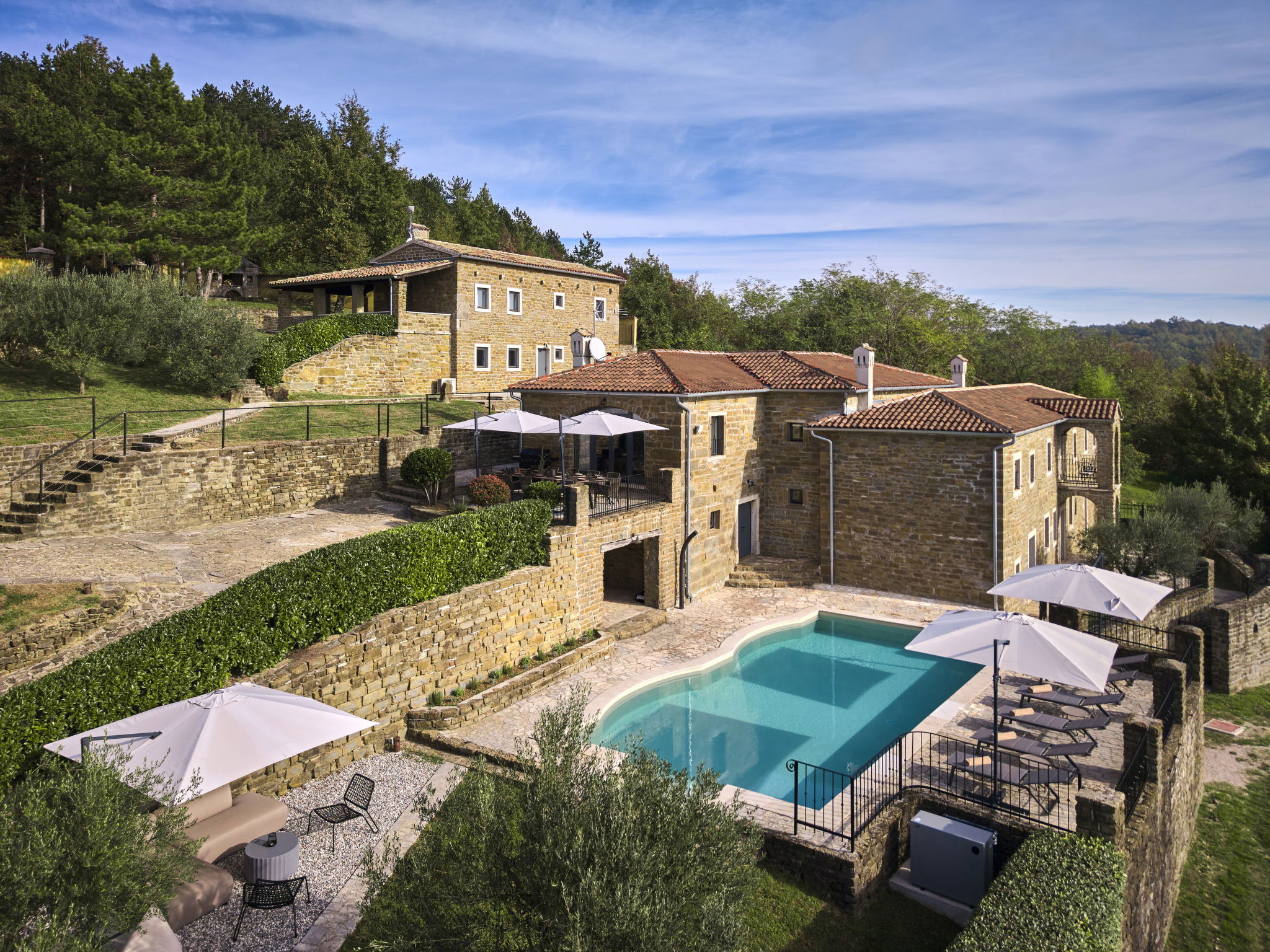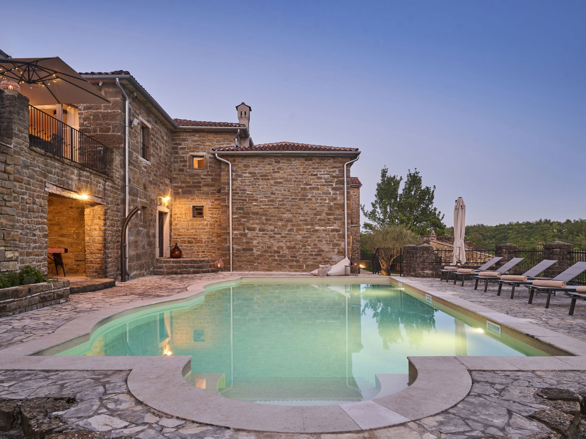 Very beautiful, rustic villa "Stanzia Butori", 4 storeys, renovated in 2025, surrounded by trees. In the hamlet Butori 12 km from the centre of Grožnjan, 20 km from the centre of Motovun, 24 km from the centre of Umag, in a quiet, sunny position, 21 km from the sea, 2.5 km from the lake, in a cul-de-sac, in the countryside. Private: property 3'000 m2 with lawn and trees, swimming pool heated (60 m2, depth 110 - 150 cm, seasonal availability: 01.May. - 01.Oct.) with internal staircase. Unconventional pool shape. Outdoor shower, table tennis, volleyball, badminton, terrace (25 m2), garden furniture, barbecue house, pool maintenance by the owner/gardener. In the house: internet access, sauna, hot tub, spa area, billiard table, table football, washing machine, tumble dryer, bicycle rental. (extra). Cook on request (extra). Parking (for 5 cars) at the house on the premises. Shop 13 km, supermarket 13 km, restaurant 6 km, bus stop 21 km, rocky beach 21 km. Walking paths from the house 50 m, cycle lane 100 m. Nearby attractions: Istrian desert 5 km, Waterfall Butori 2.5 km, Winery 12 km. Please note: airfield 86 km from the property. Swimming pool heated (extra). It is necessary to announce 7 days in advance if the pool heating is required. Video surveillance of the driveway and parking. Available: darts (included). The unit consists of 2 houses rented as one unit.