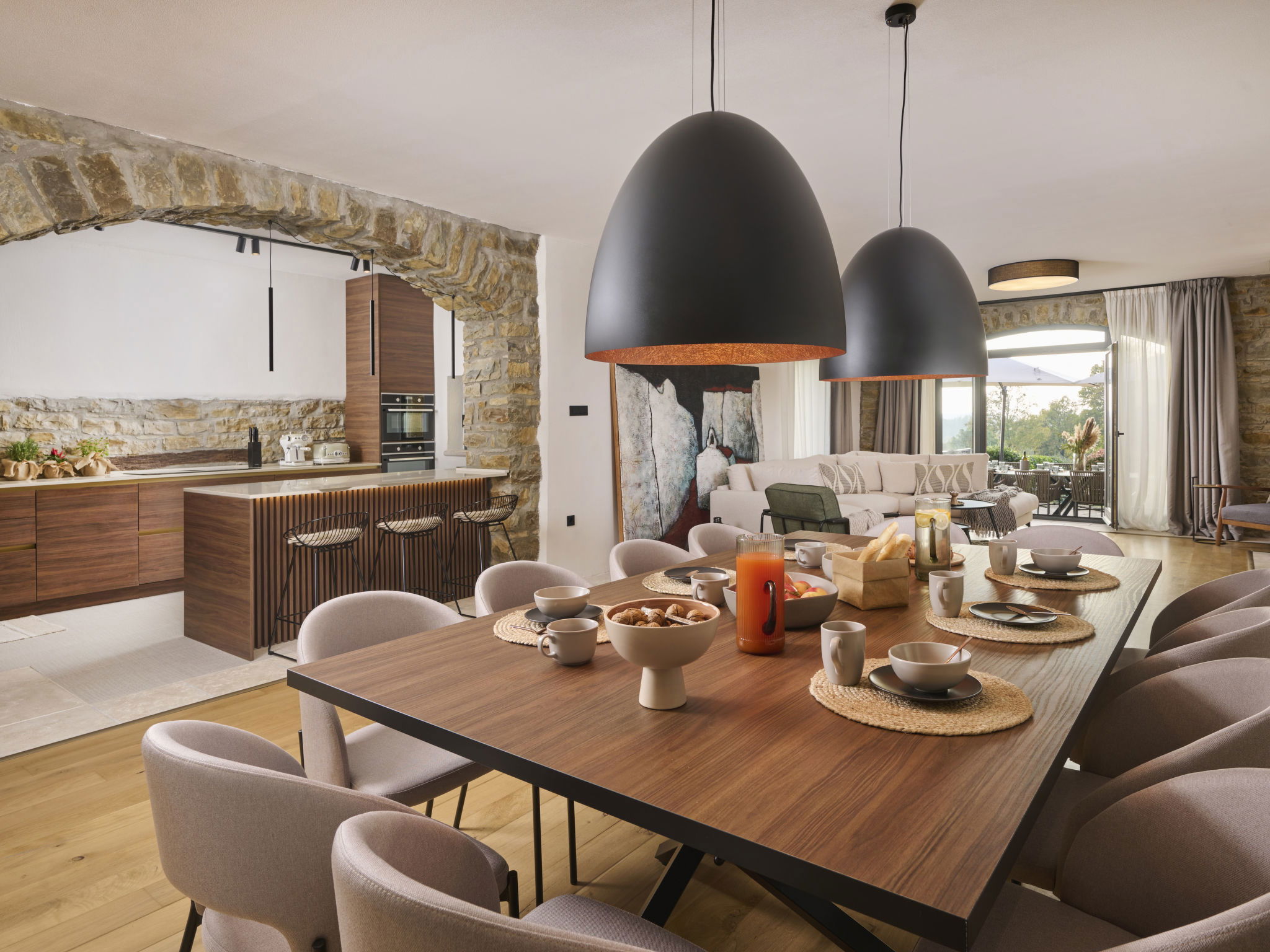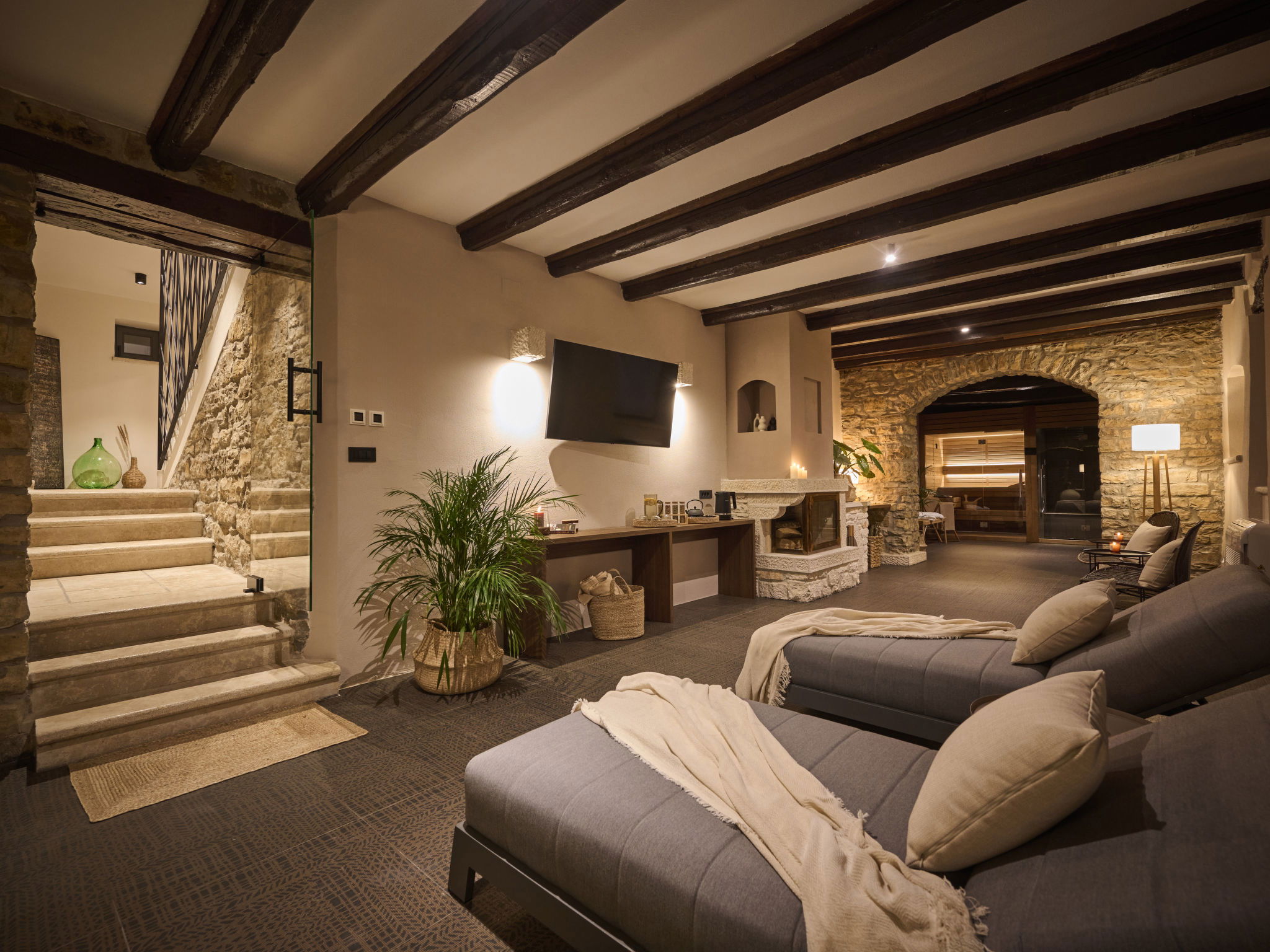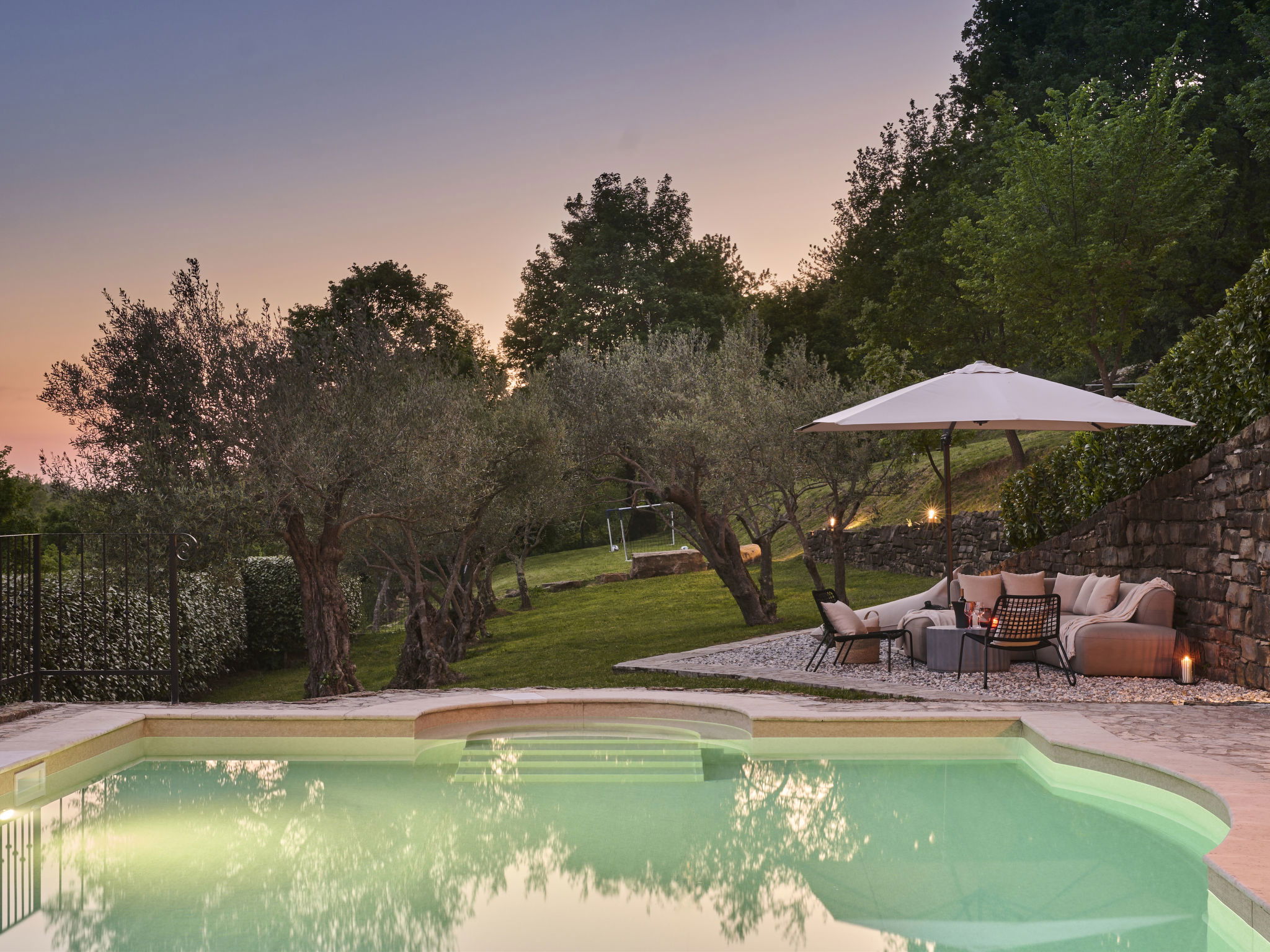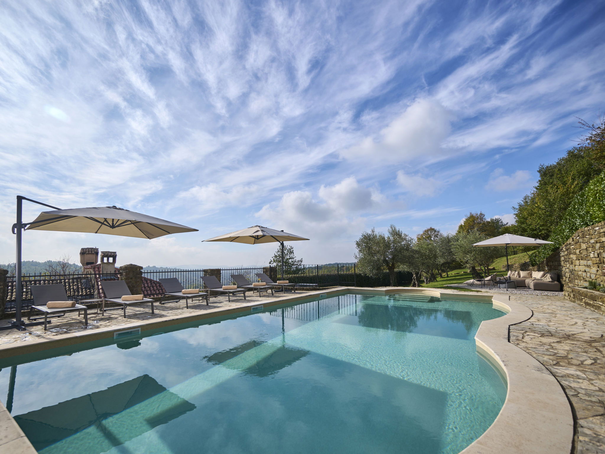 Very beautiful, rustic villa "Stanzia Butori", 4 storeys, renovated in 2025, surrounded by trees. In the hamlet Butori 12 km from the centre of Grožnjan, 20 km from the centre of Motovun, 24 km from the centre of Umag, in a quiet, sunny position, 21 km from the sea, 2.5 km from the lake, in a cul-de-sac, in the countryside. Private: property 3'000 m2 with lawn and trees, swimming pool heated (60 m2, depth 110 - 150 cm, seasonal availability: 01.May. - 01.Oct.) with internal staircase. Unconventional pool shape. Outdoor shower, table tennis, volleyball, badminton, terrace (25 m2), garden furniture, barbecue house, pool maintenance by the owner/gardener. In the house: internet access, sauna, hot tub, spa area, billiard table, table football, washing machine, tumble dryer, bicycle rental. (extra). Cook on request (extra). Parking (for 5 cars) at the house on the premises. Shop 13 km, supermarket 13 km, restaurant 6 km, bus stop 21 km, rocky beach 21 km. Walking paths from the house 50 m, cycle lane 100 m. Nearby attractions: Istrian desert 5 km, Waterfall Butori 2.5 km, Winery 12 km. Please note: airfield 86 km from the property. Swimming pool heated (extra). It is necessary to announce 7 days in advance if the pool heating is required. Video surveillance of the driveway and parking. Available: darts (included). The unit consists of 2 houses rented as one unit.
