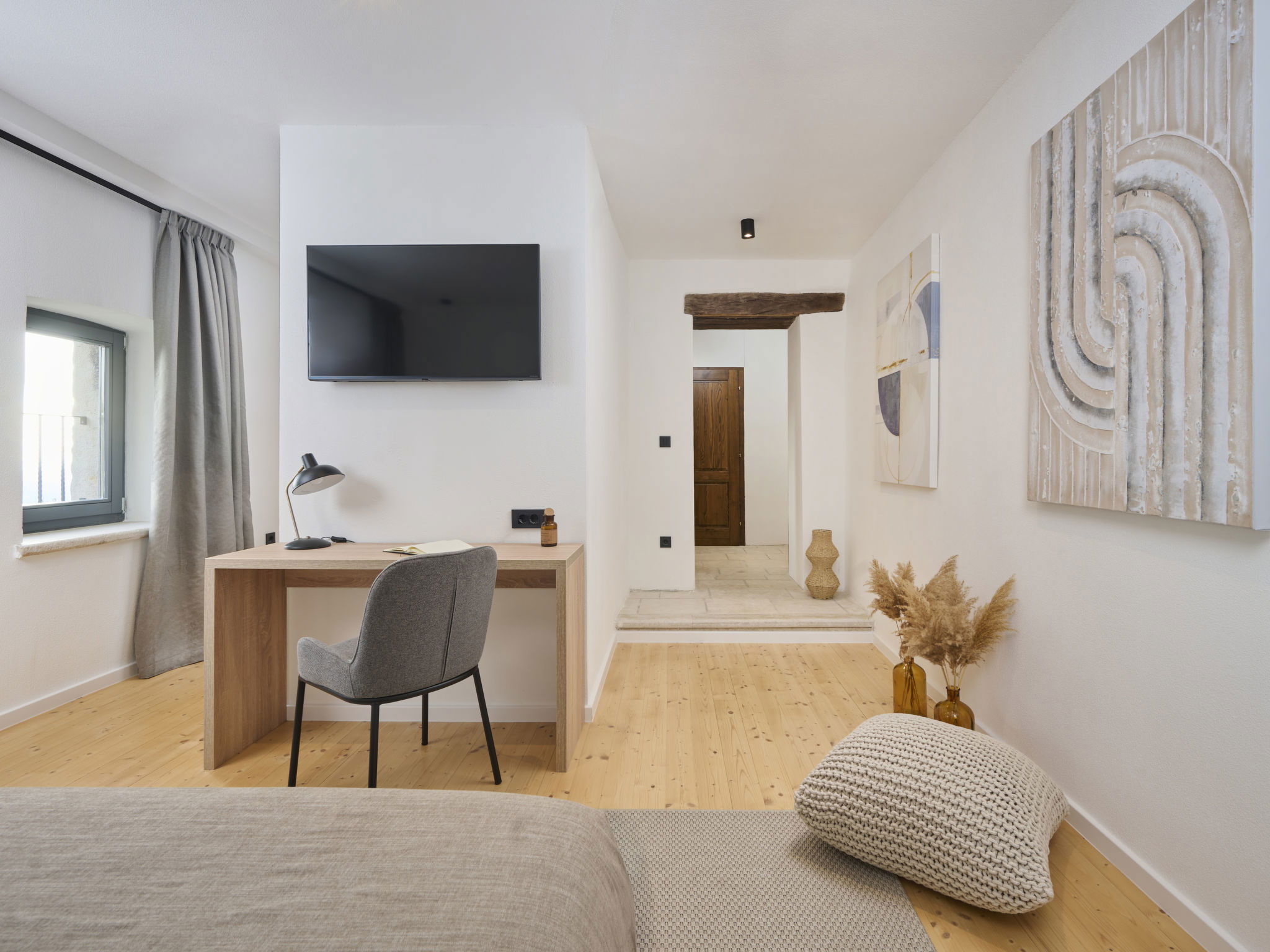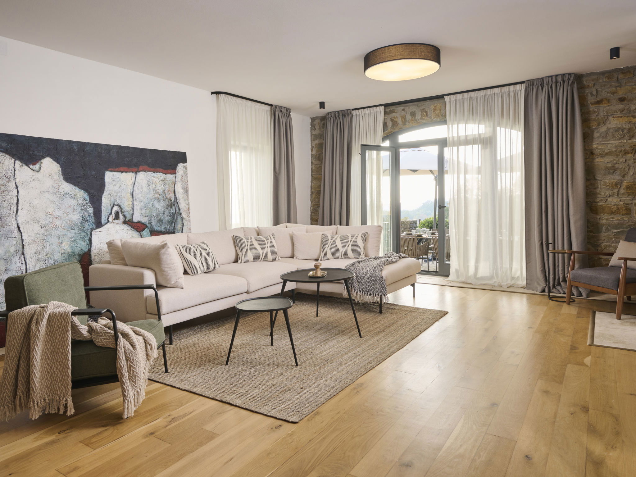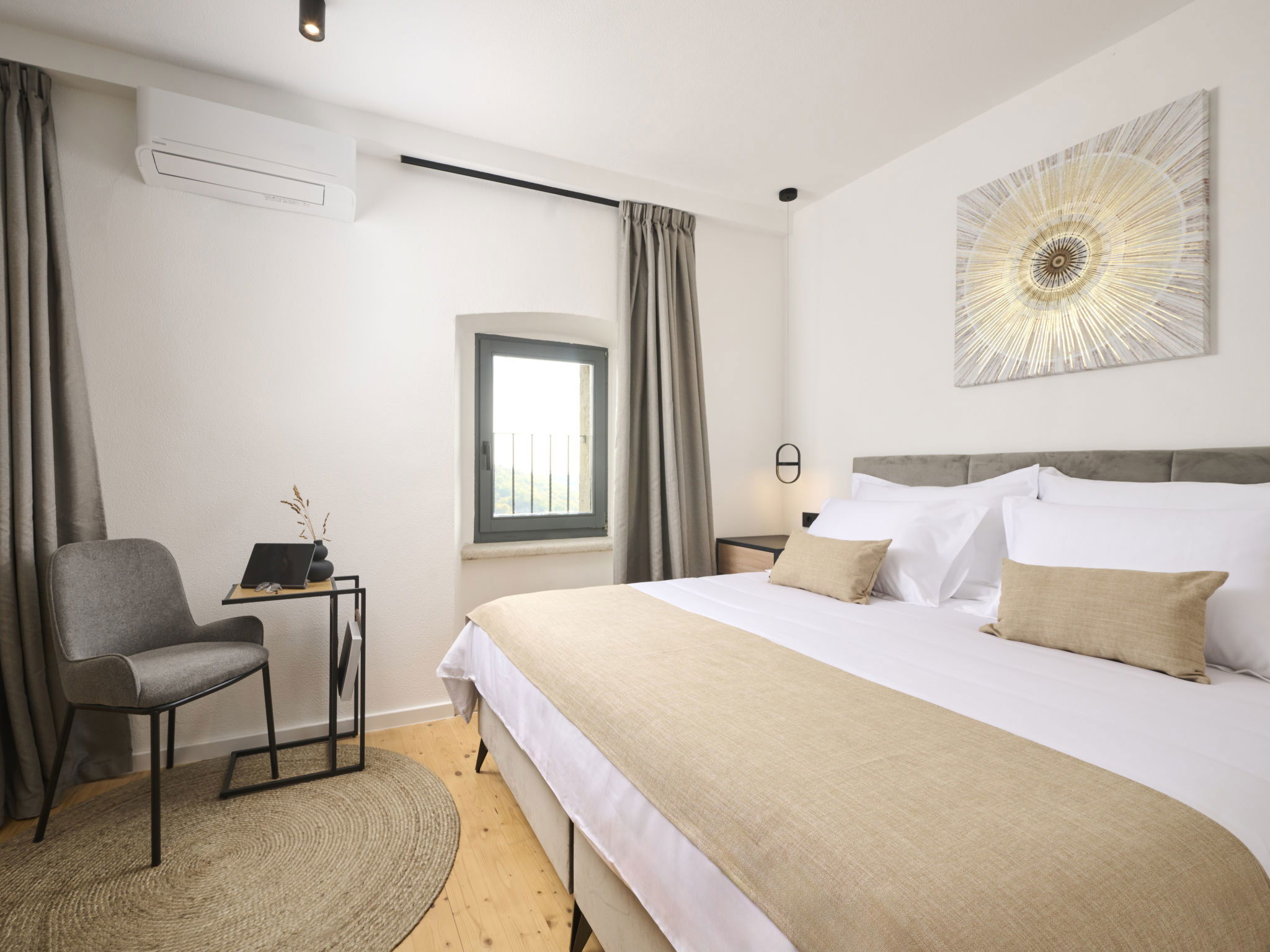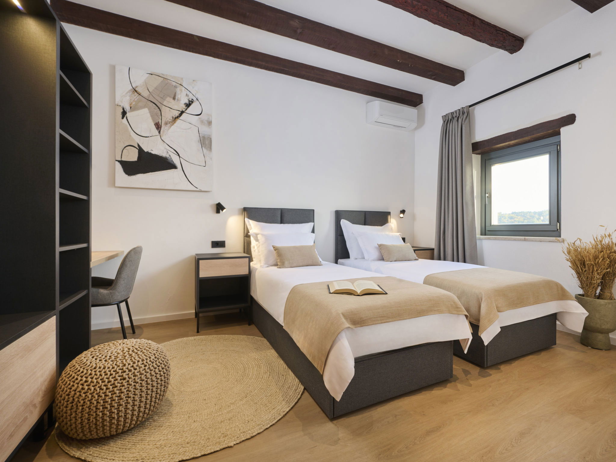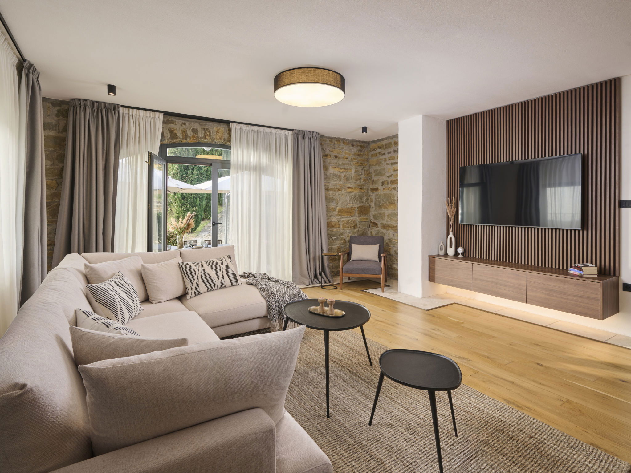 Very beautiful, rustic villa "Stanzia Butori", 4 storeys, renovated in 2025, surrounded by trees. In the hamlet Butori 12 km from the centre of Grožnjan, 20 km from the centre of Motovun, 24 km from the centre of Umag, in a quiet, sunny position, 21 km from the sea, 2.5 km from the lake, in a cul-de-sac, in the countryside. Private: property 3'000 m2 with lawn and trees, swimming pool heated (60 m2, depth 110 - 150 cm, seasonal availability: 01.May. - 01.Oct.) with internal staircase. Unconventional pool shape. Outdoor shower, table tennis, volleyball, badminton, terrace (25 m2), garden furniture, barbecue house, pool maintenance by the owner/gardener. In the house: internet access, sauna, hot tub, spa area, billiard table, table football, washing machine, tumble dryer, bicycle rental. (extra). Cook on request (extra). Parking (for 5 cars) at the house on the premises. Shop 13 km, supermarket 13 km, restaurant 6 km, bus stop 21 km, rocky beach 21 km. Walking paths from the house 50 m, cycle lane 100 m. Nearby attractions: Istrian desert 5 km, Waterfall Butori 2.5 km, Winery 12 km. Please note: airfield 86 km from the property. Swimming pool heated (extra). It is necessary to announce 7 days in advance if the pool heating is required. Video surveillance of the driveway and parking. Available: darts (included). The unit consists of 2 houses rented as one unit.