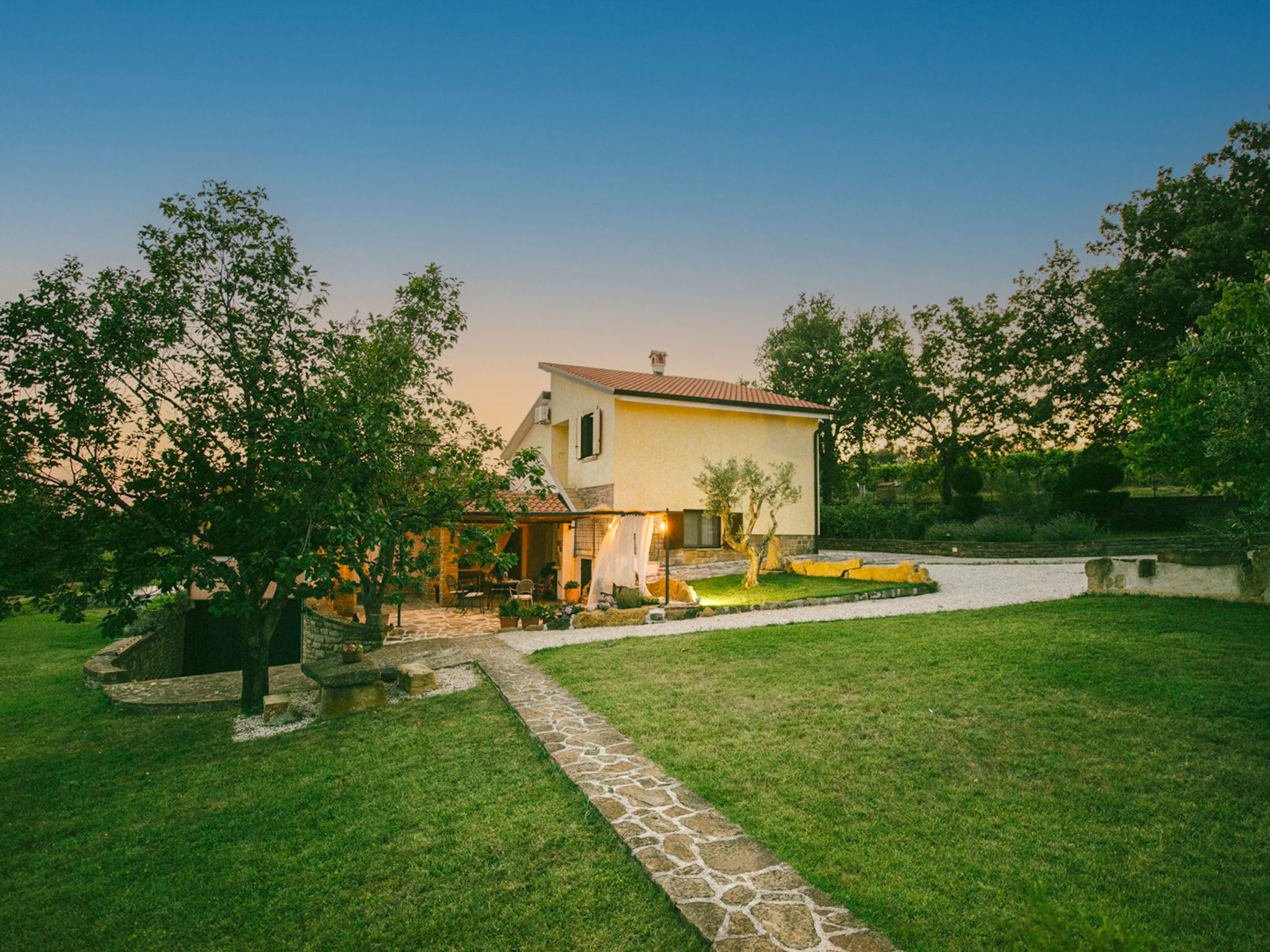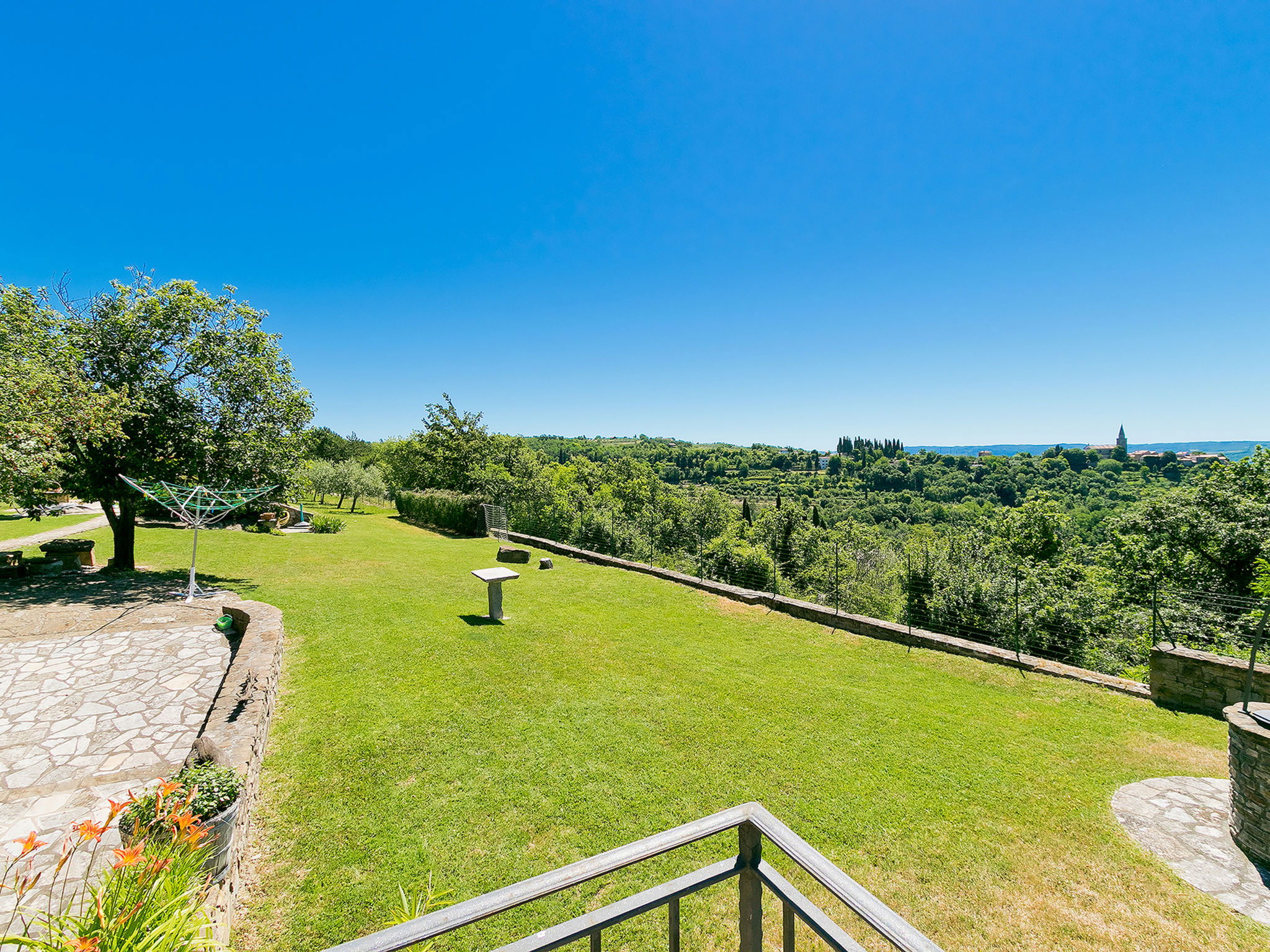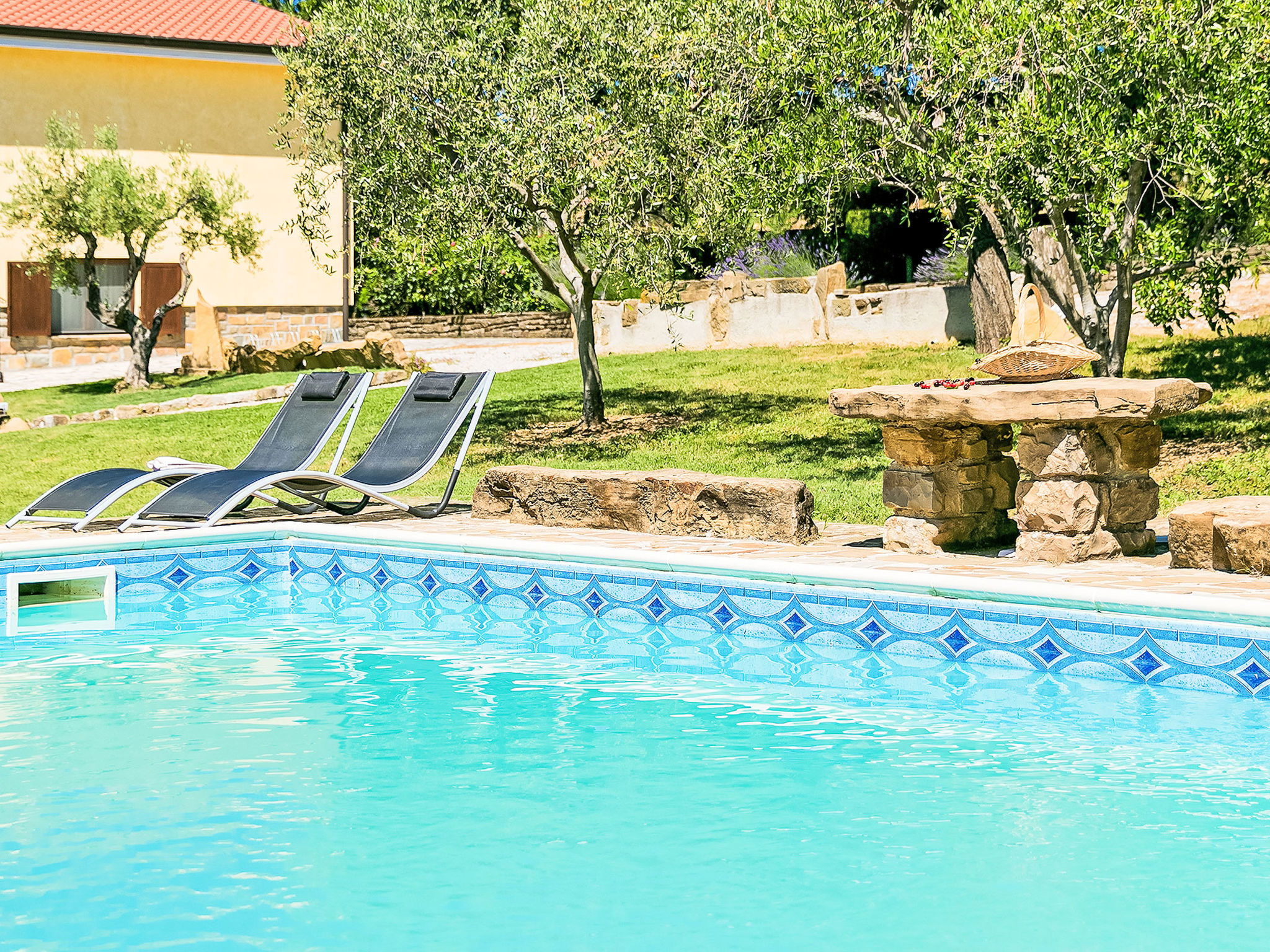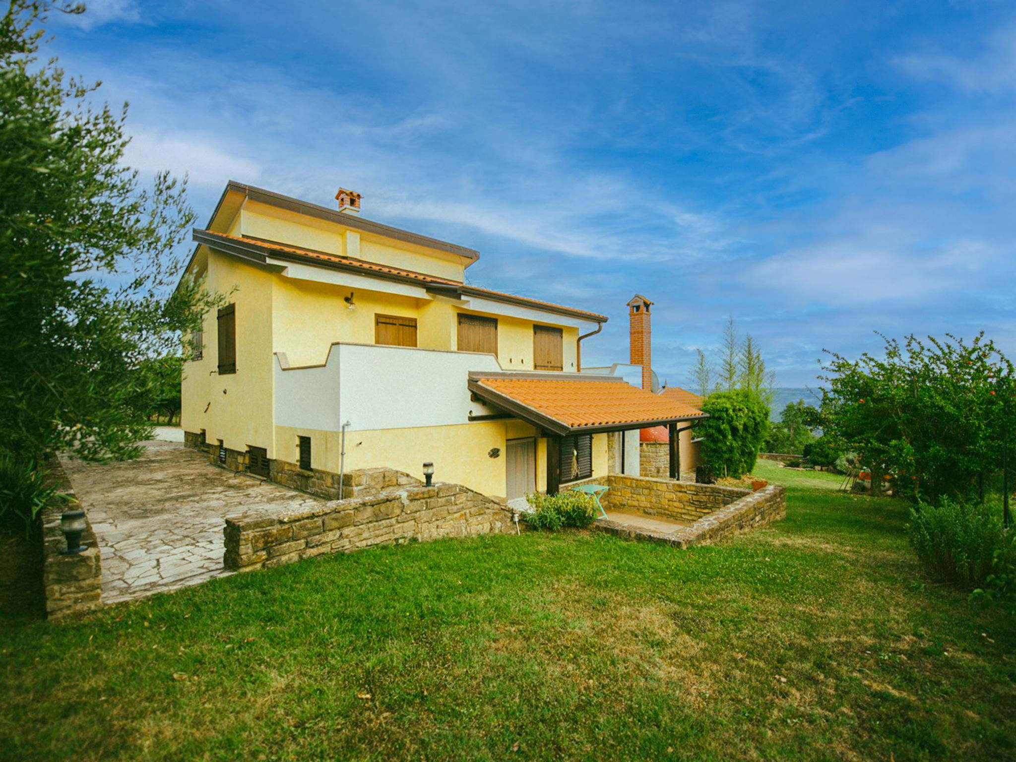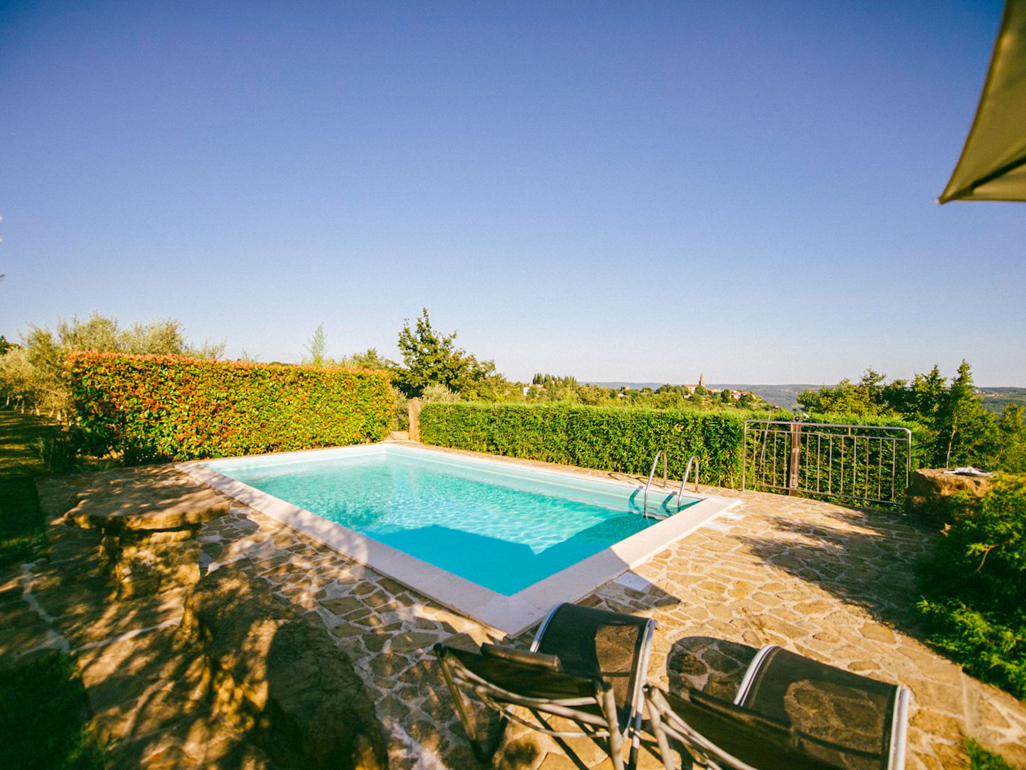 Beautiful 3-family house "Margherita", 2 storeys. In the hamlet Peroj 1 km from the centre of Grožnjan, in a quiet, sunny, elevated position, 20 km from the sea. Private: property 3'000 m2 (fenced), beautiful garden with lawn and wildlife garden, swimming pool angular (8 x 4 m, depth 140 cm, seasonal availability: 01.May. - 29.Sep.). Outdoor shower, barbecue. In the house: internet access, washing machine. Parking at the house on the premises. Shop 1 km, supermarket 8 km, restaurant 1 km, bus stop 8 km, railway station 35 km, pebble beach 20 km. Walking paths from the house 100 m, cycle lane 150 m.