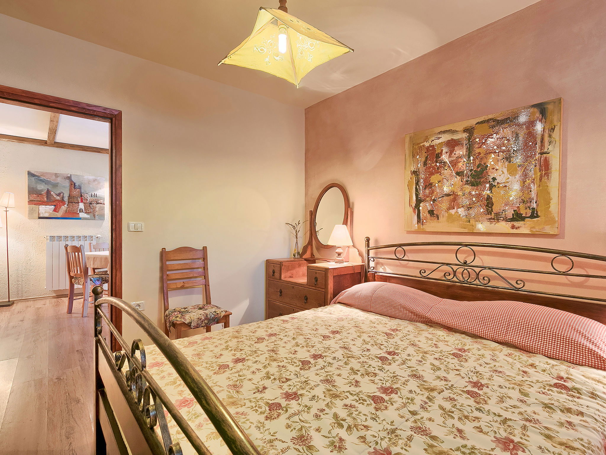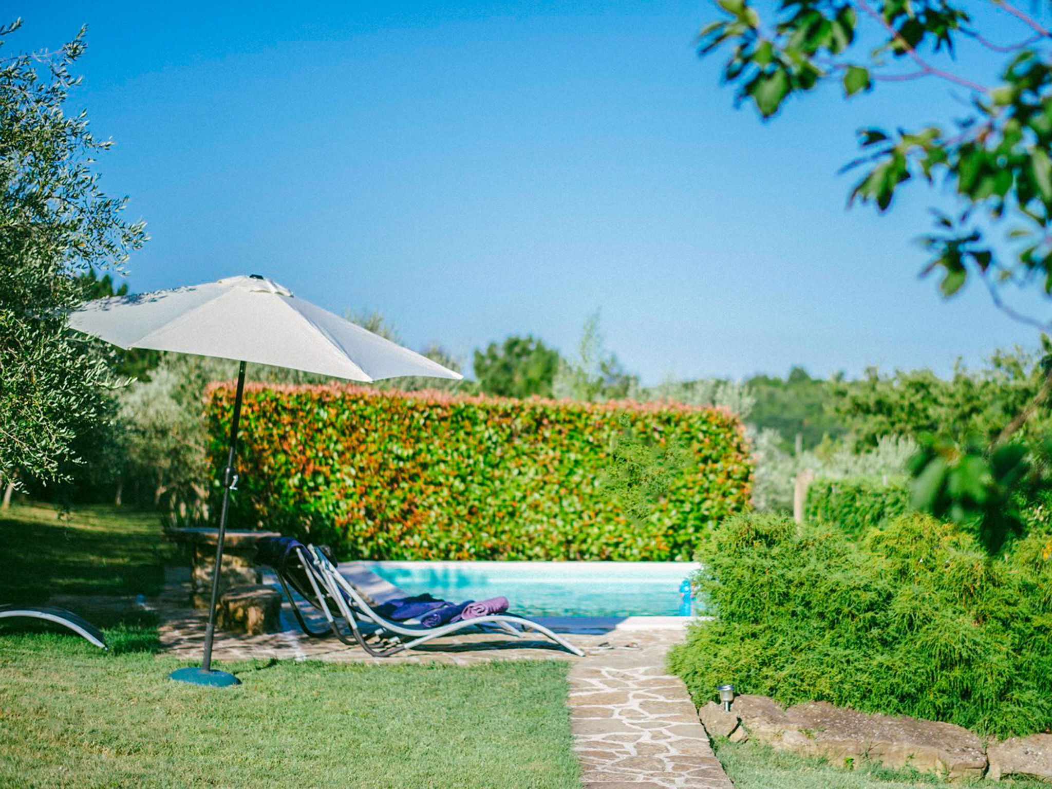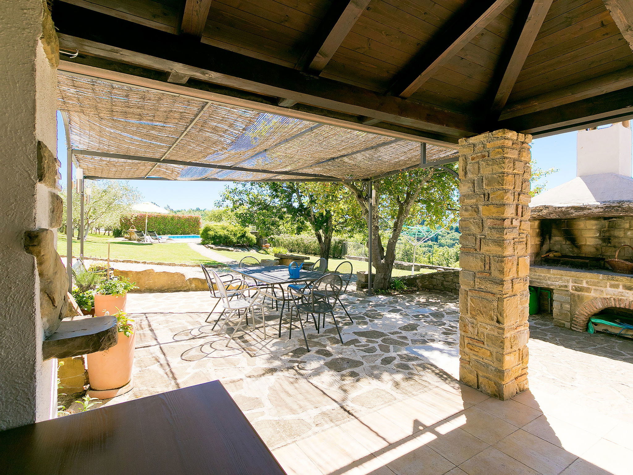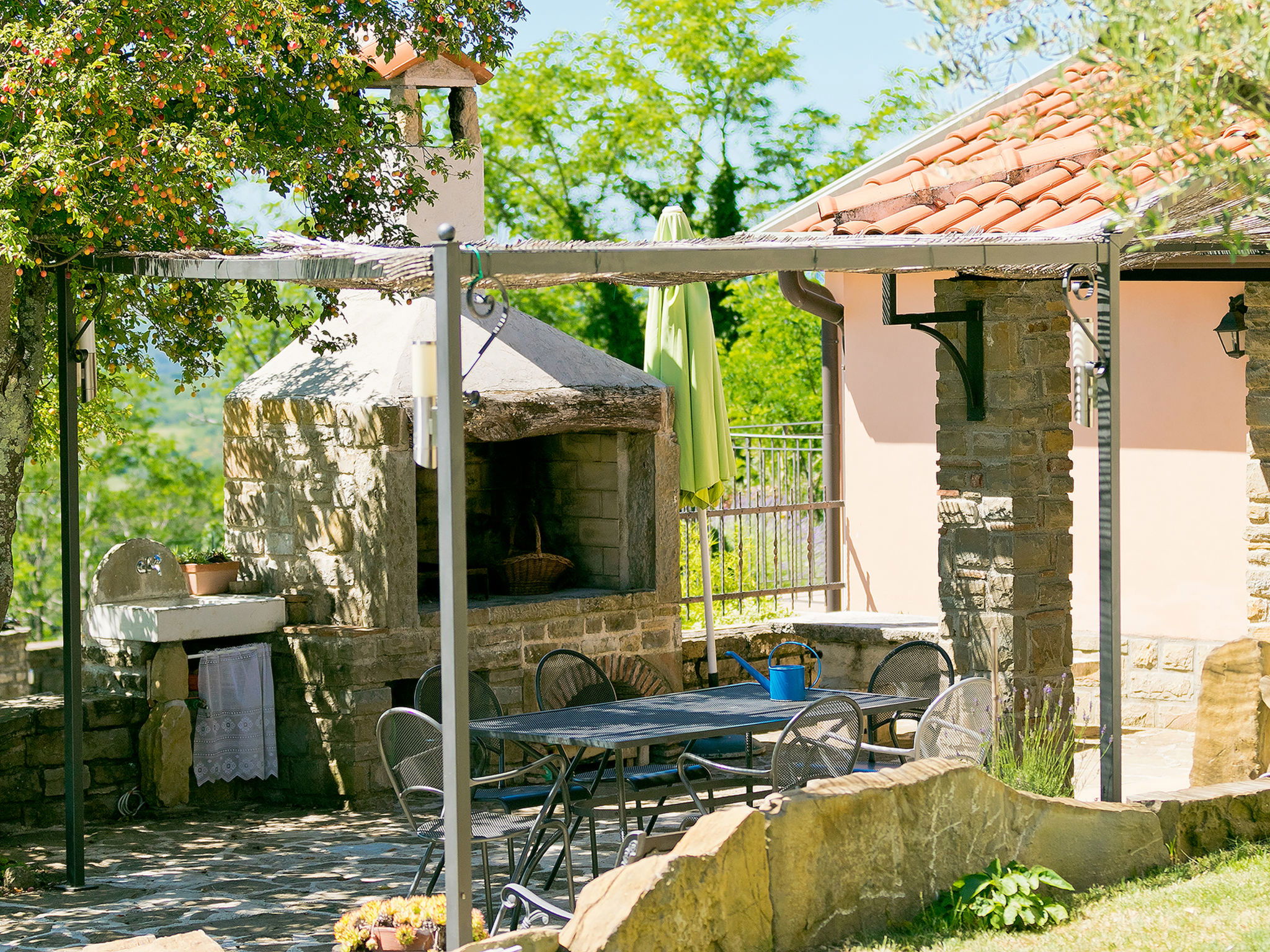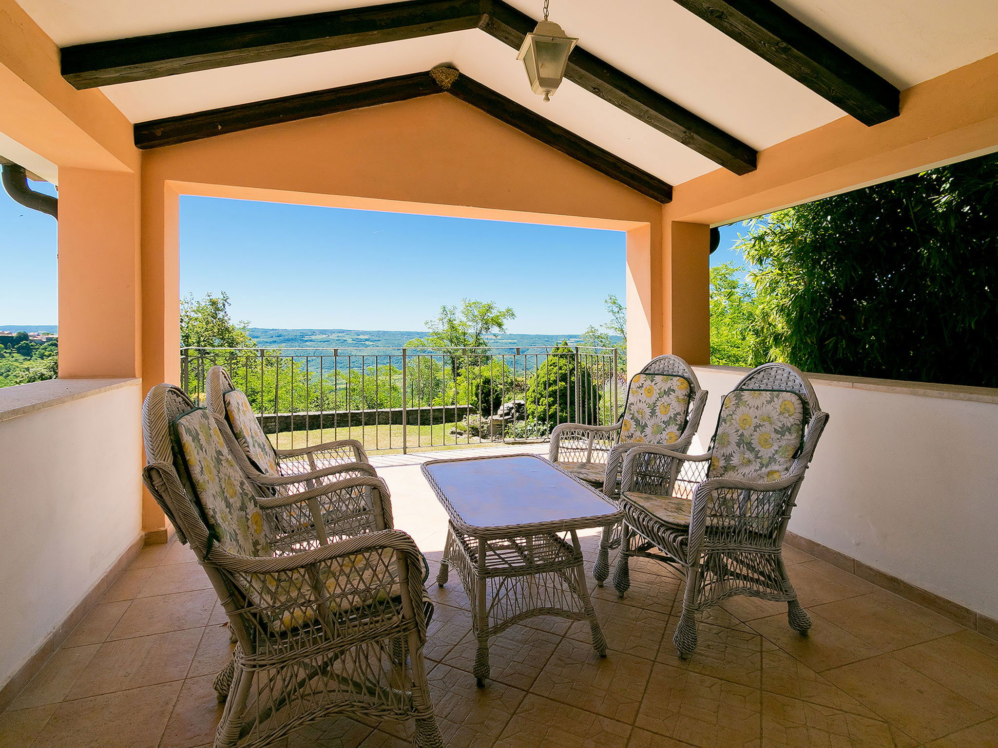 Beautiful 3-family house "Margherita", 2 storeys. In the hamlet Peroj 1 km from the centre of Grožnjan, in a quiet, sunny, elevated position, 20 km from the sea. Private: property 3'000 m2 (fenced), beautiful garden with lawn and wildlife garden, swimming pool angular (8 x 4 m, depth 140 cm, seasonal availability: 01.May. - 29.Sep.). Outdoor shower, barbecue. In the house: internet access, washing machine. Parking at the house on the premises. Shop 1 km, supermarket 8 km, restaurant 1 km, bus stop 8 km, railway station 35 km, pebble beach 20 km. Walking paths from the house 100 m, cycle lane 150 m.