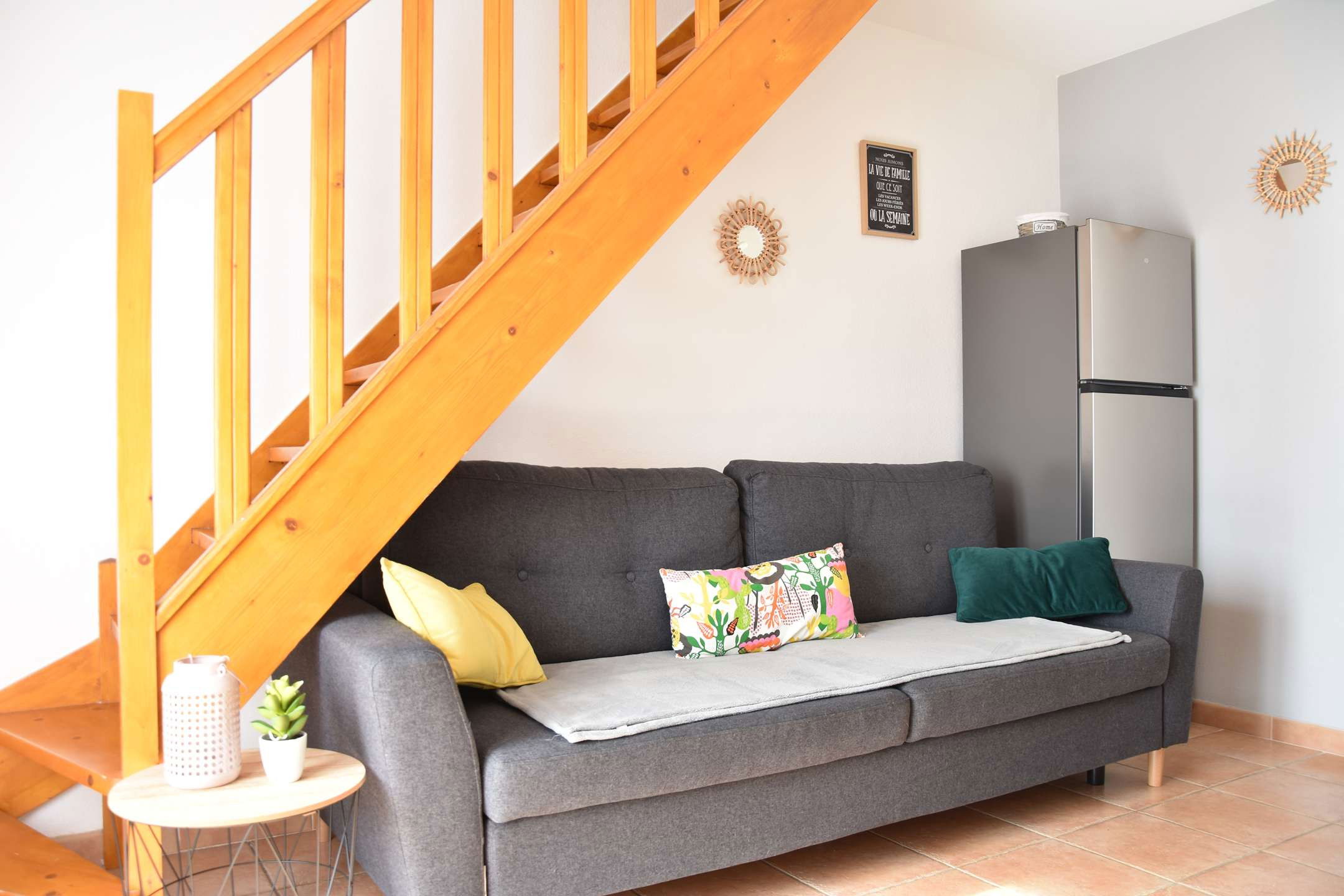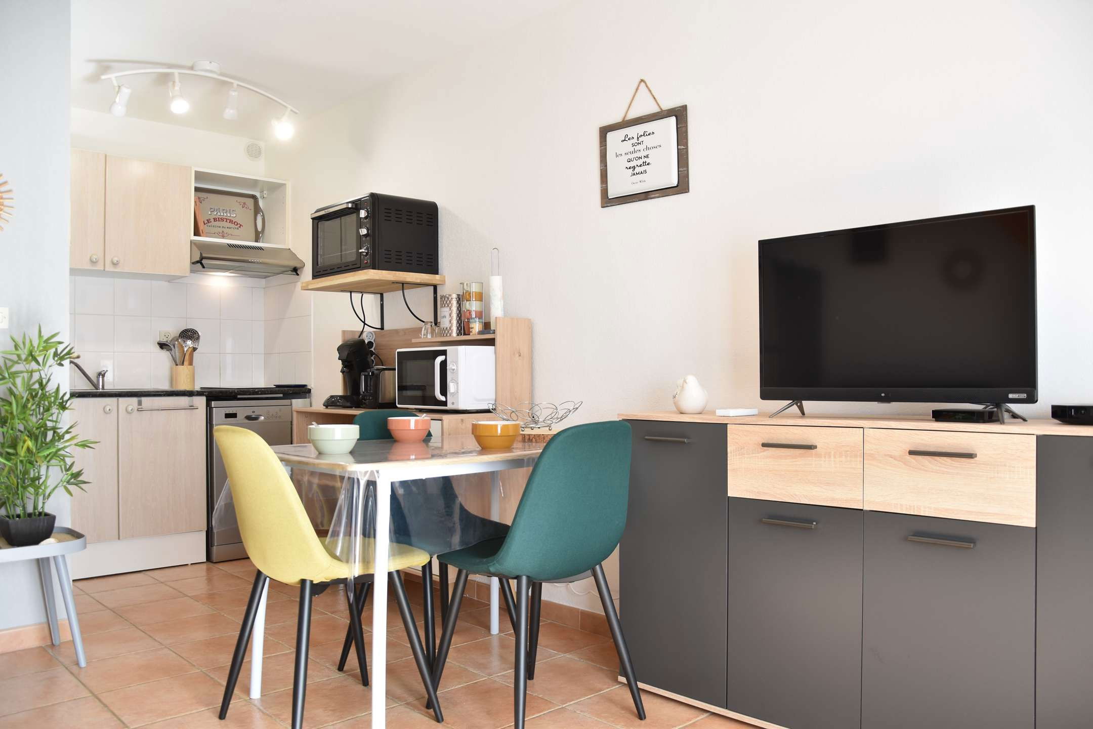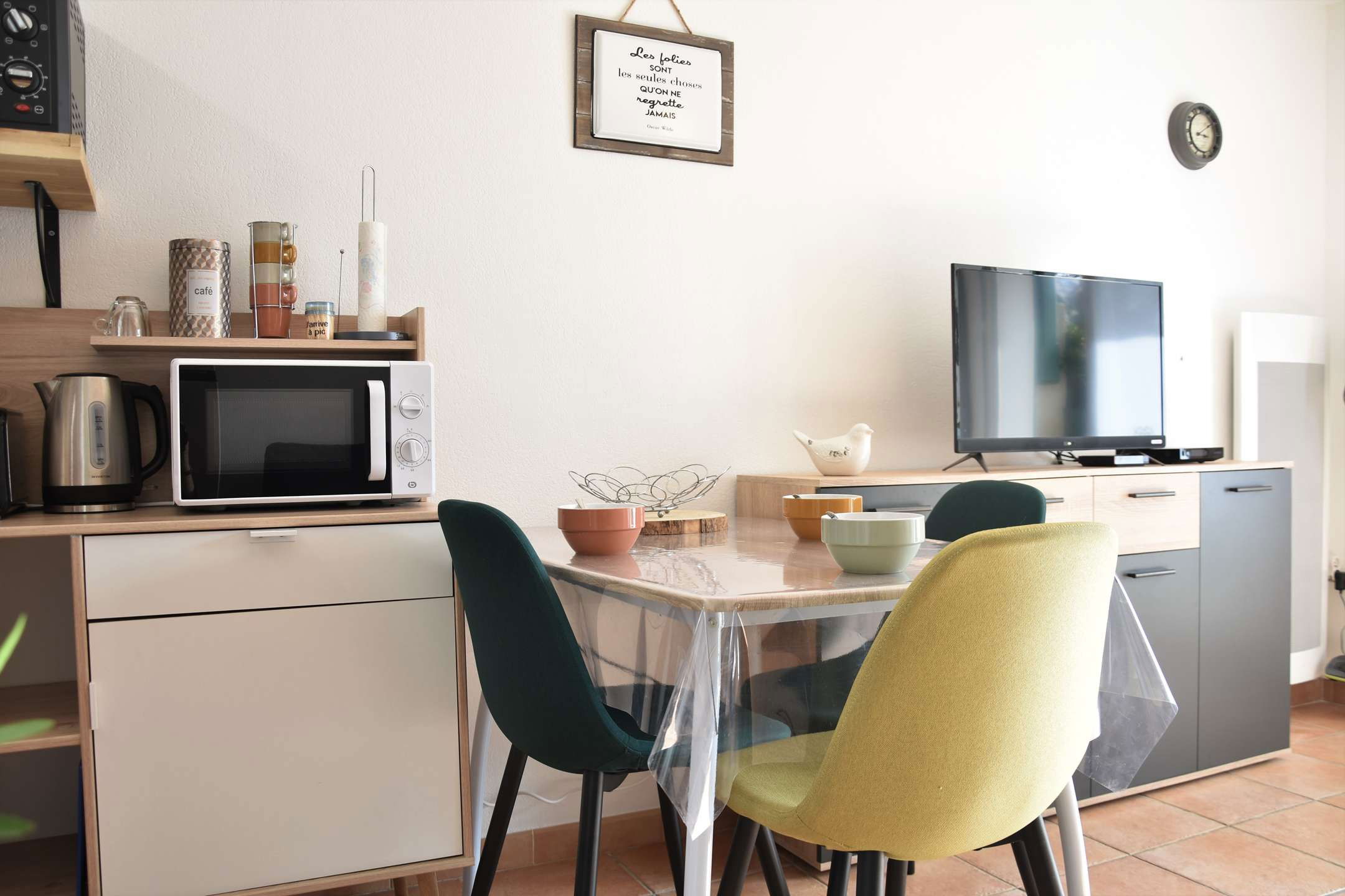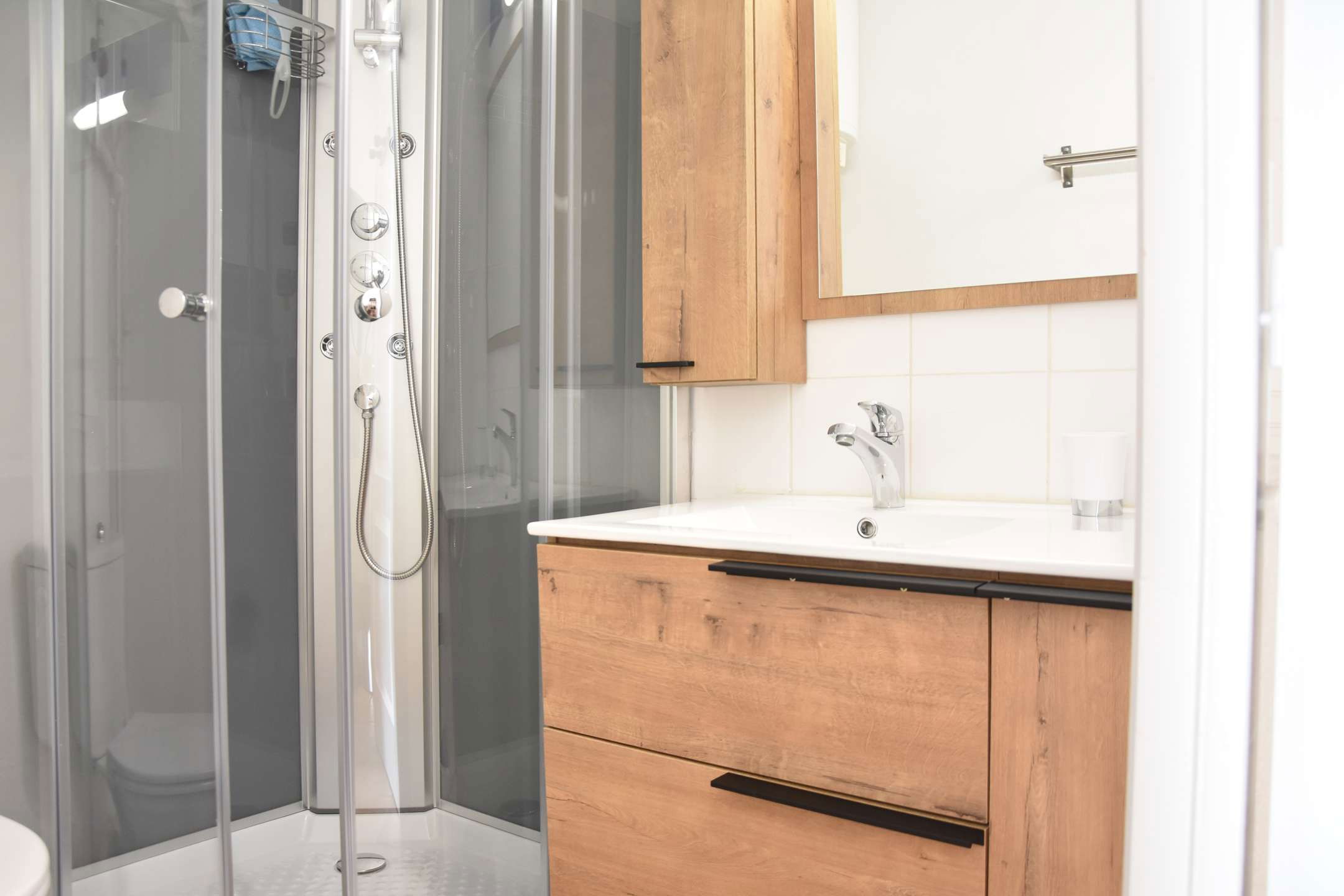 This newly renovated seaside rental is composed on the ground floor of a living room with sofa, air conditioning and television, a fully equipped kitchen area (induction hob, Senseo coffee maker, dishwasher, fridge-freezer, mini-oven, microwave, etc.). Shower room with shower and toilet.