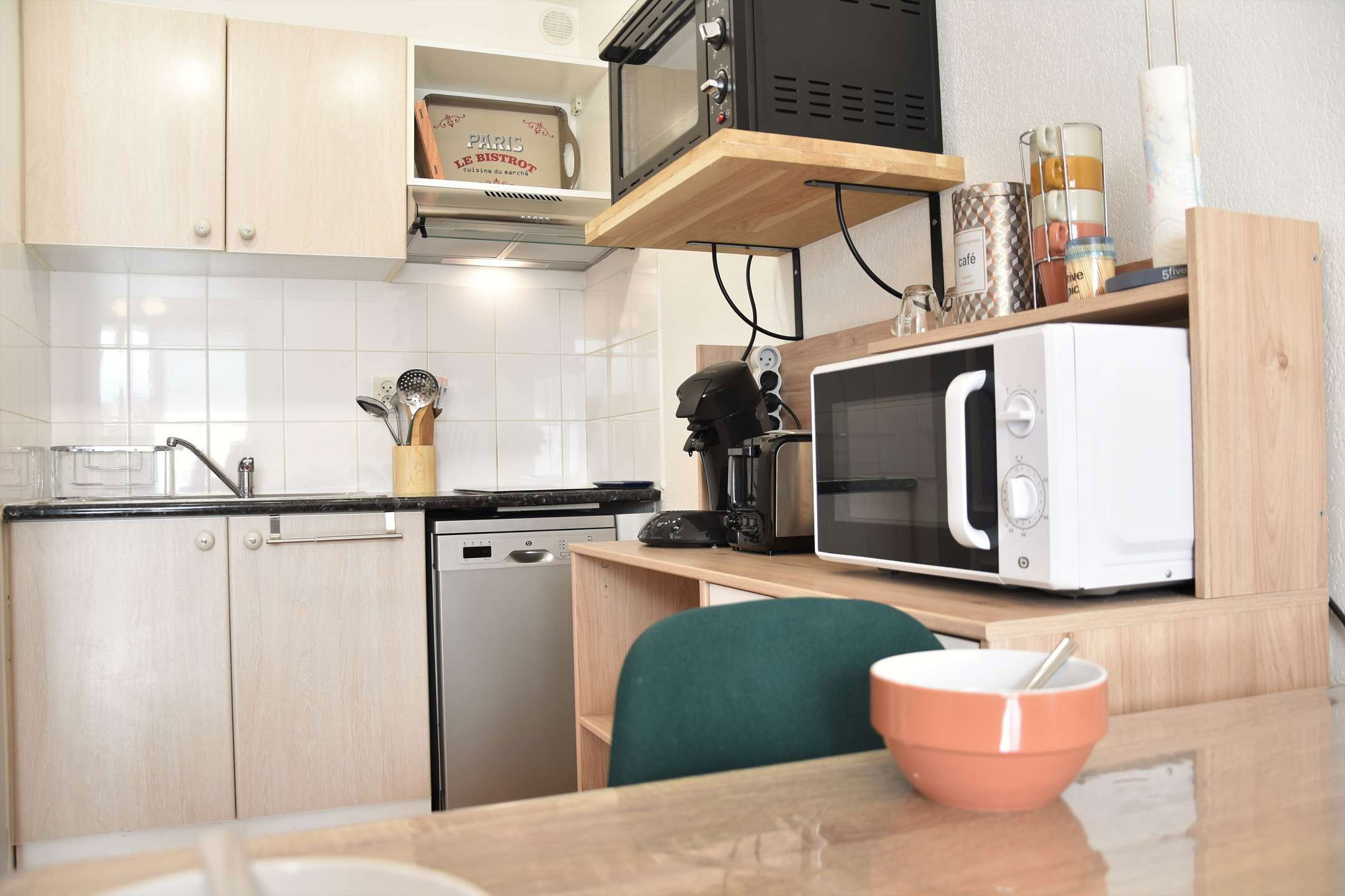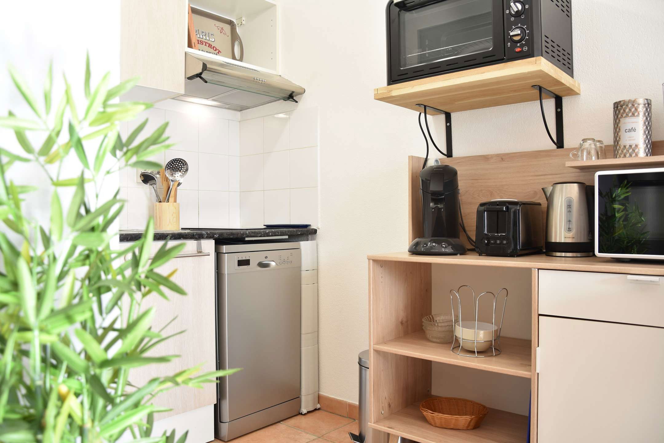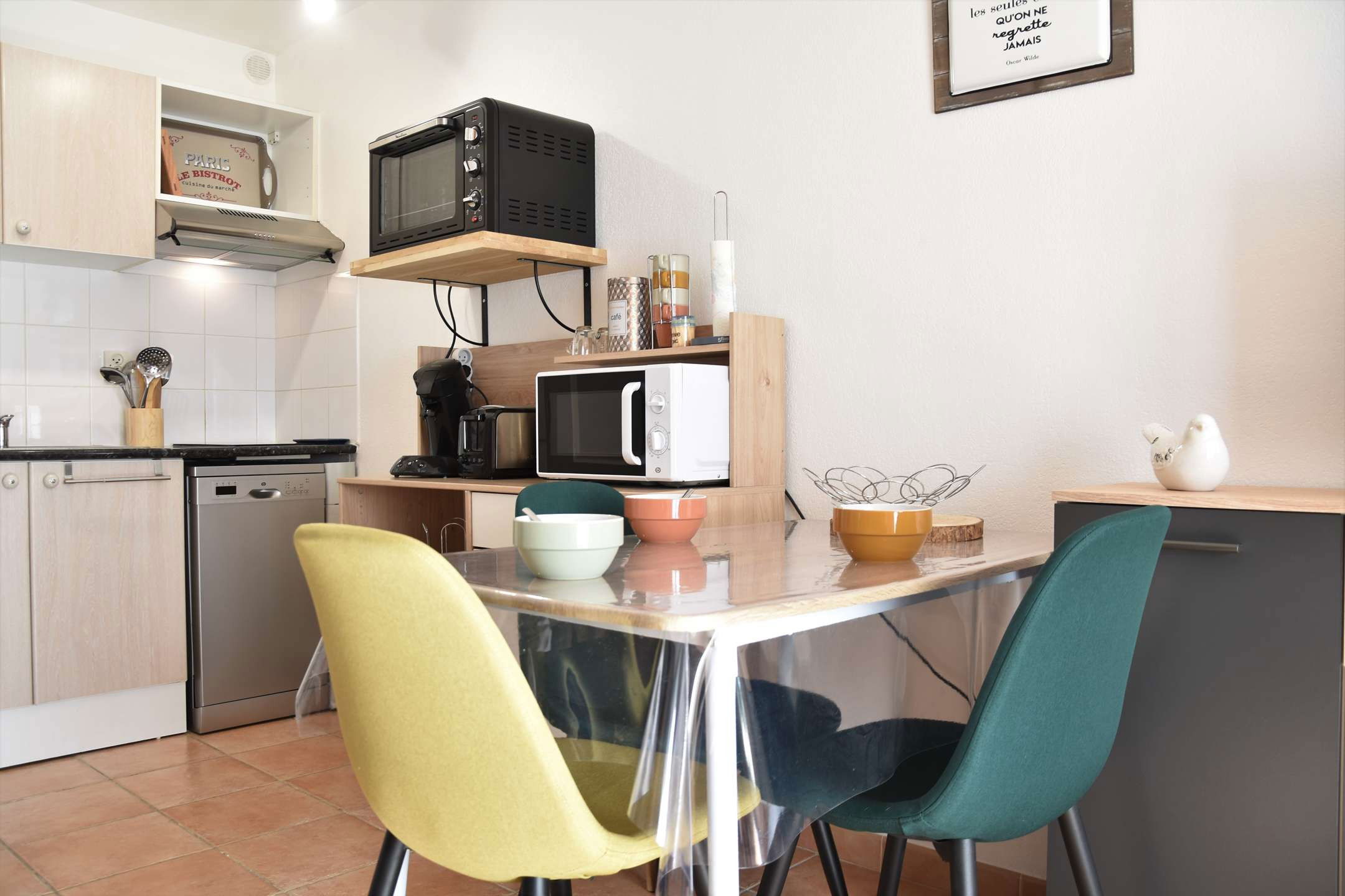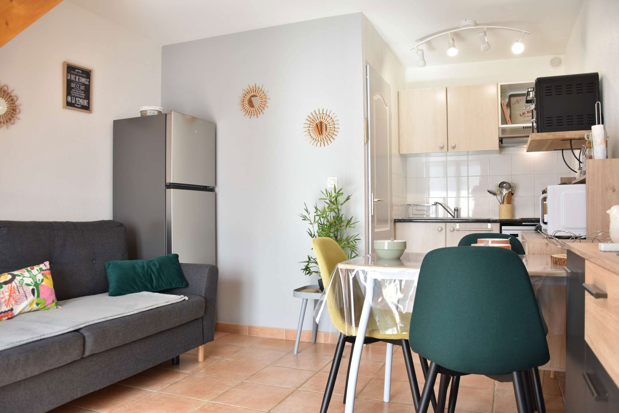 This newly renovated seaside rental is composed on the ground floor of a living room with sofa, air conditioning and television, a fully equipped kitchen area (induction hob, Senseo coffee maker, dishwasher, fridge-freezer, mini-oven, microwave, etc.). Shower room with shower and toilet.