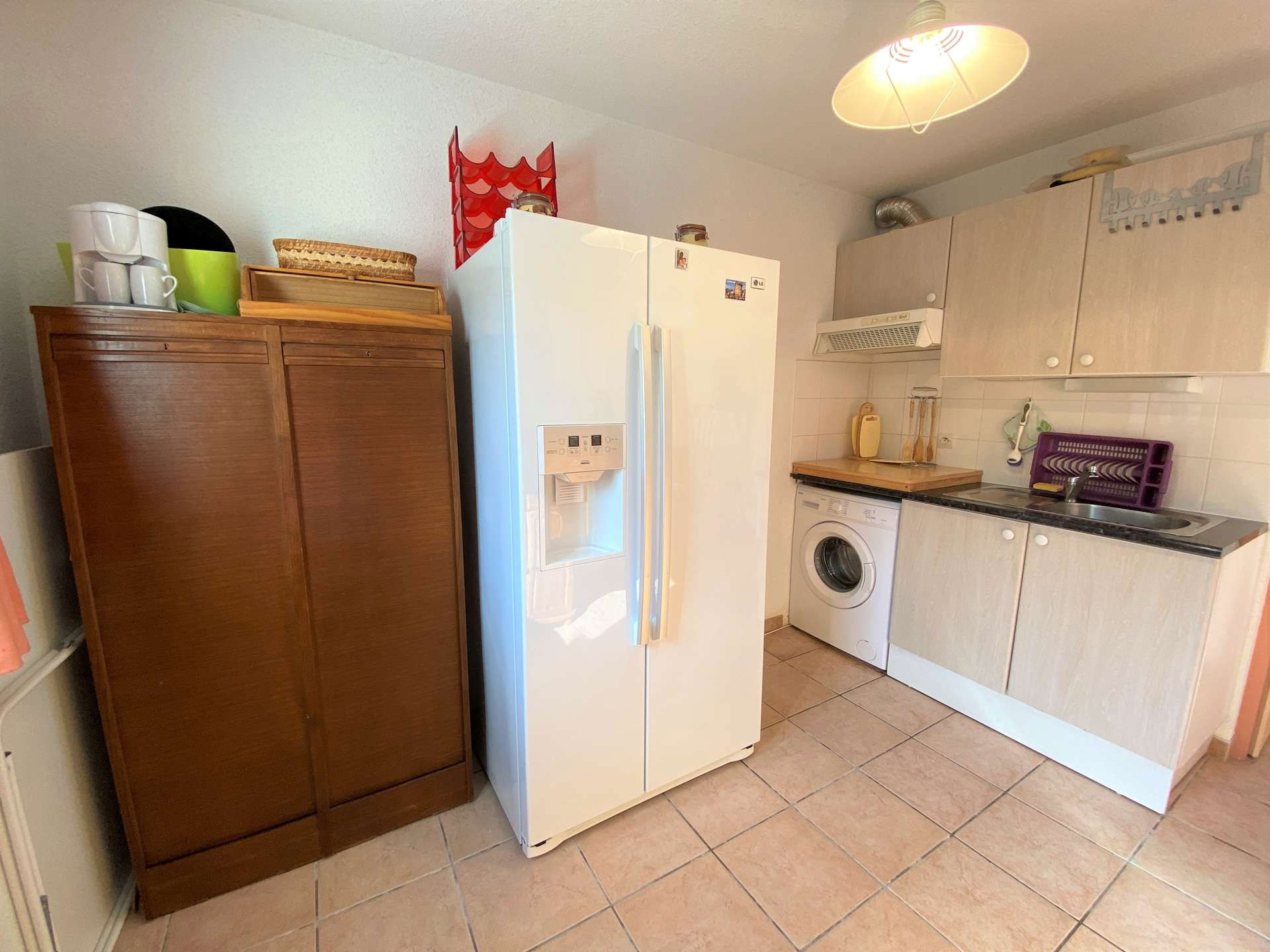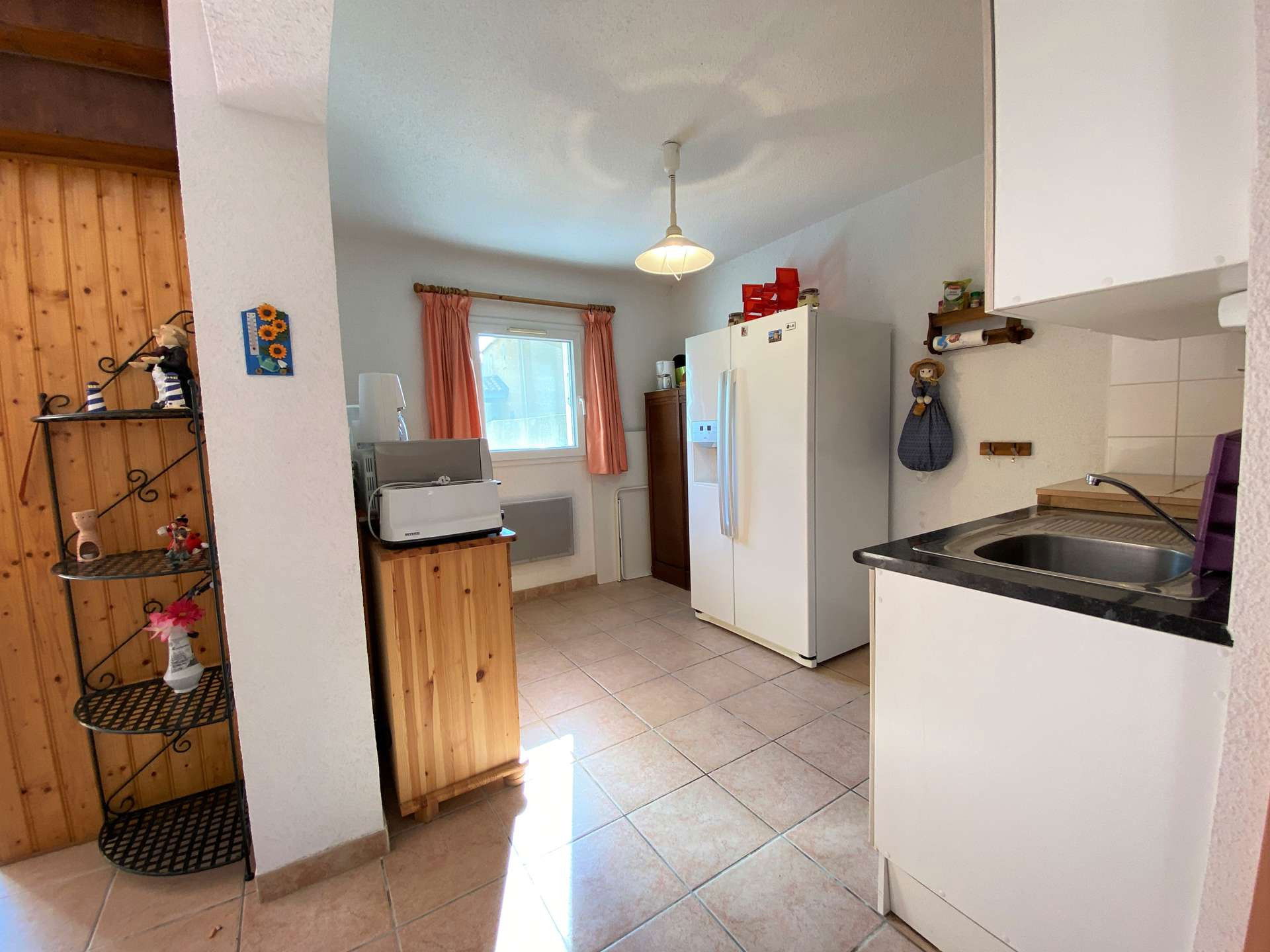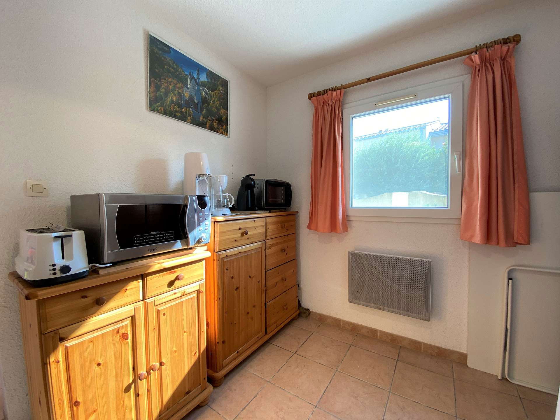 This very pleasant holiday home rental is composed on the ground floor of an equipped kitchen (American fridge, Dolce Gusto coffee machine, mini oven, washing machine) and dining area, a living room with sofa, TV. Separate WC.