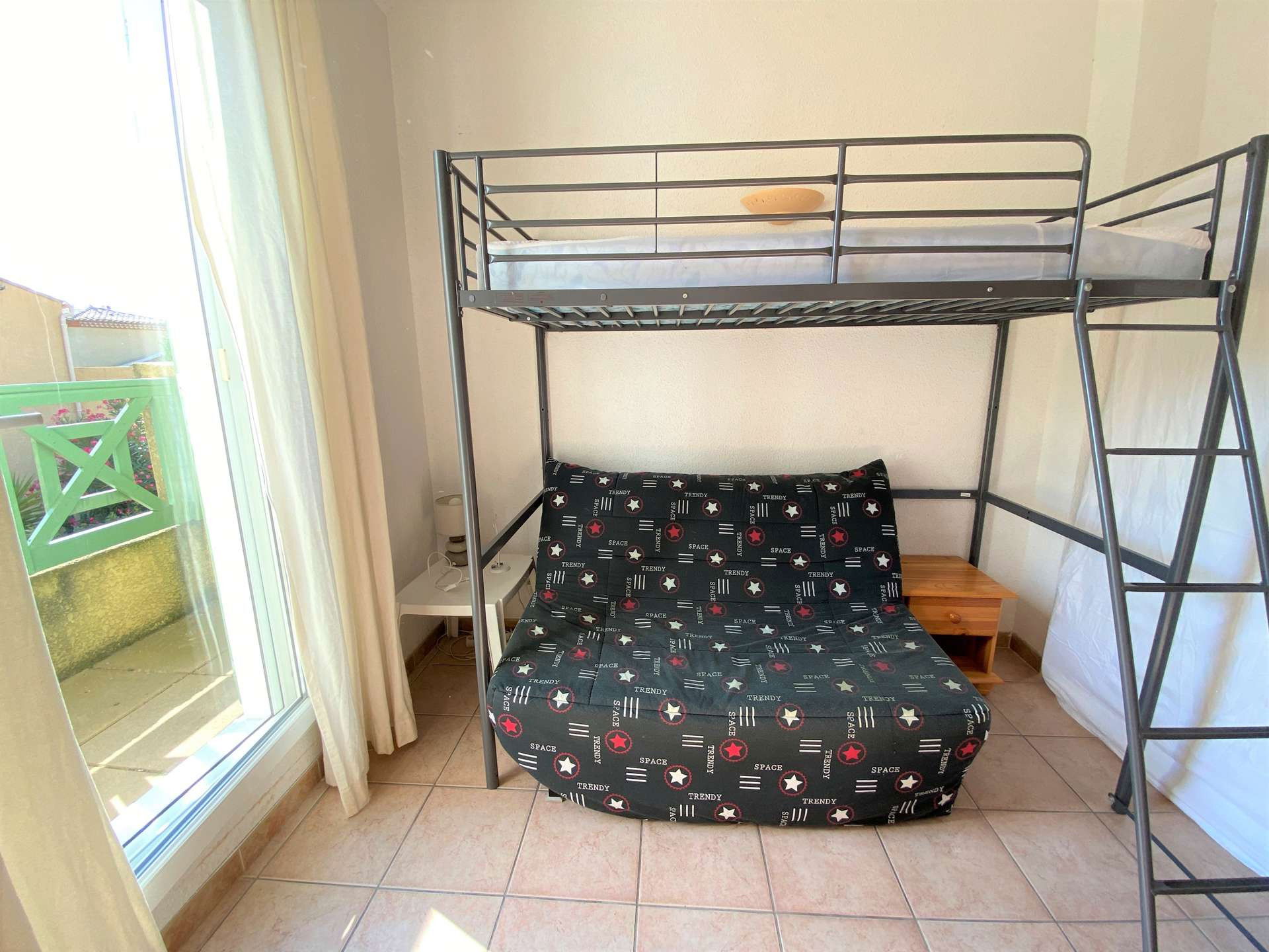 Upstairs 1 bedroom with 1 mezzanine bed 90 and convertible sofa 140 and small balcony and a second bedroom with bed/140, bathroom with WC.