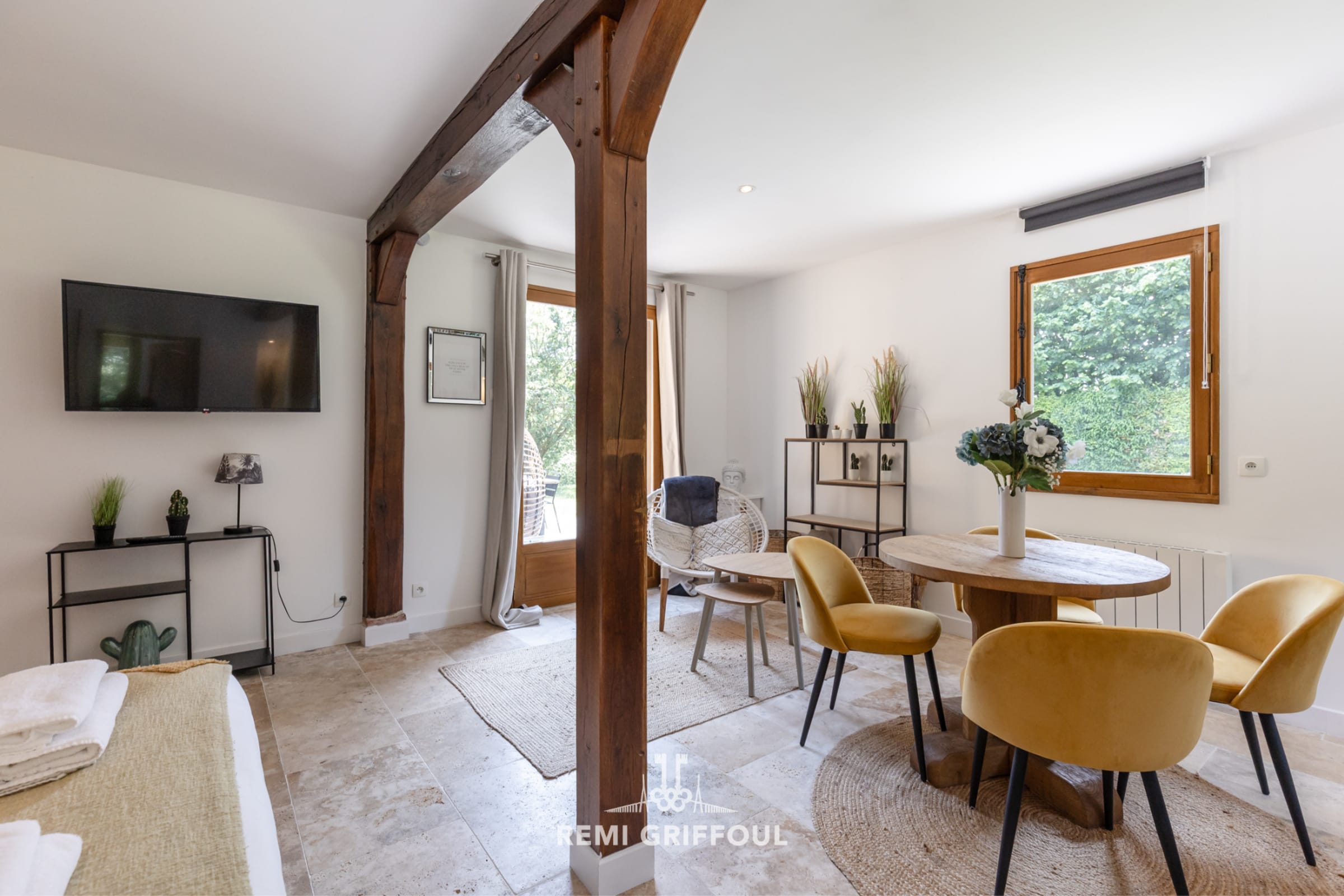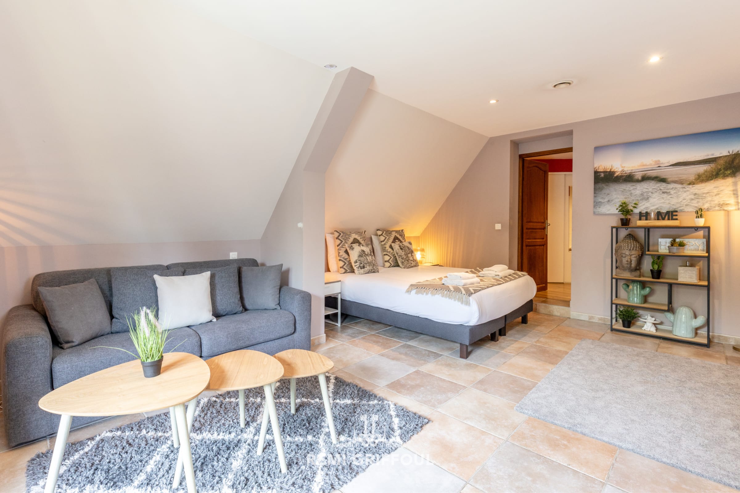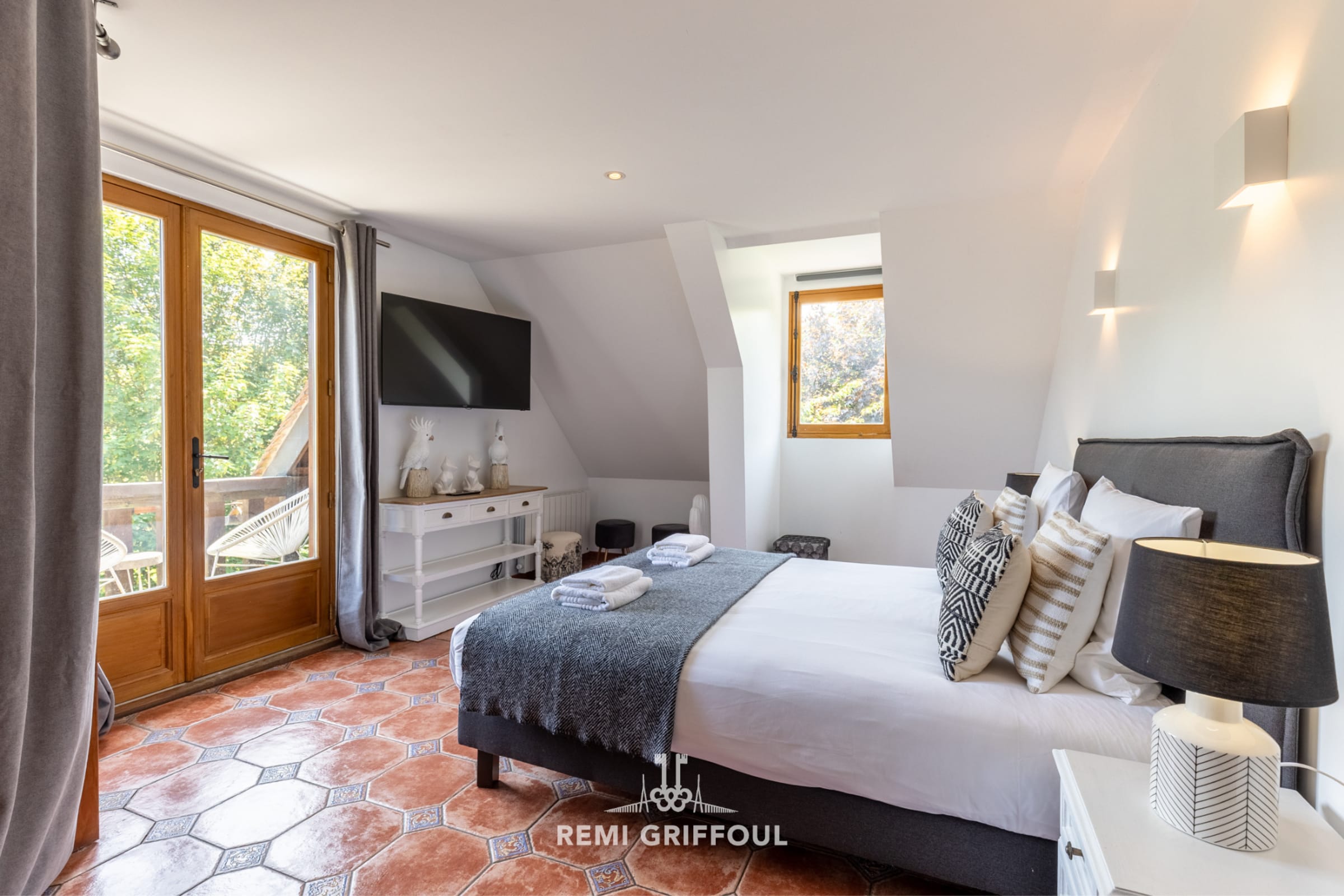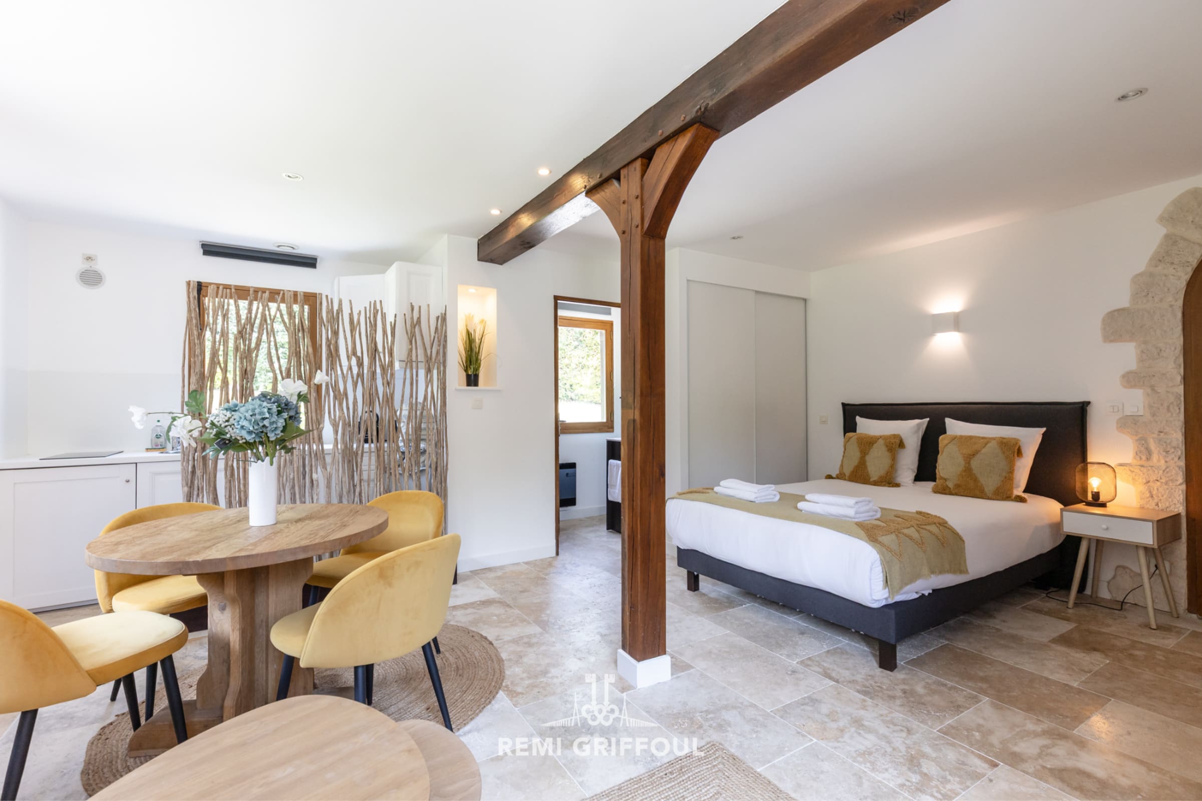 - A large, completely independent bedroom equipped with a TV, a small kitchen area, a dressing room, a private bathroom and a toilet. This room has direct access to the garden.