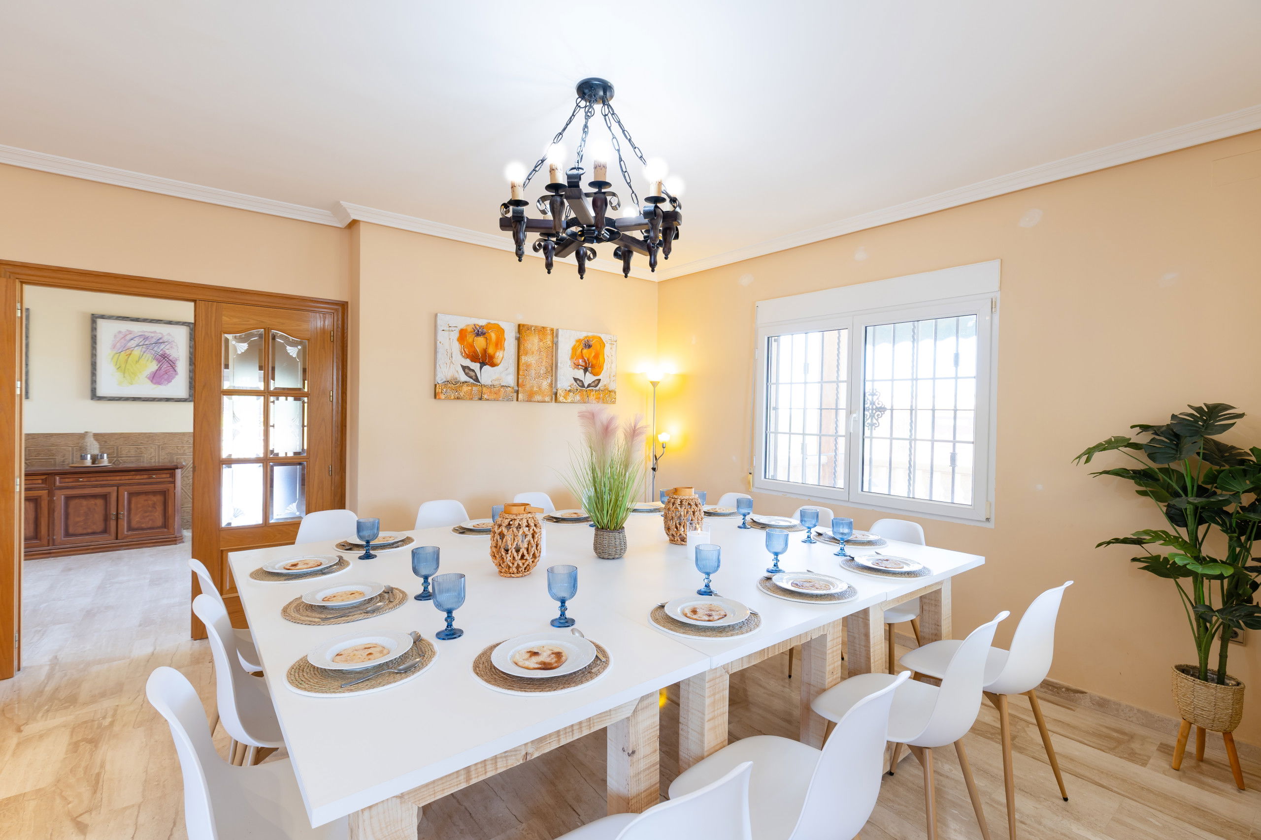 The house has 6 bedrooms and 3 bathrooms, all equipped with air conditioning to guarantee your comfort in any season of the year. The kitchen and living room, which include a cosy fireplace, create a warm and perfect atmosphere for sharing moments with family or friends.