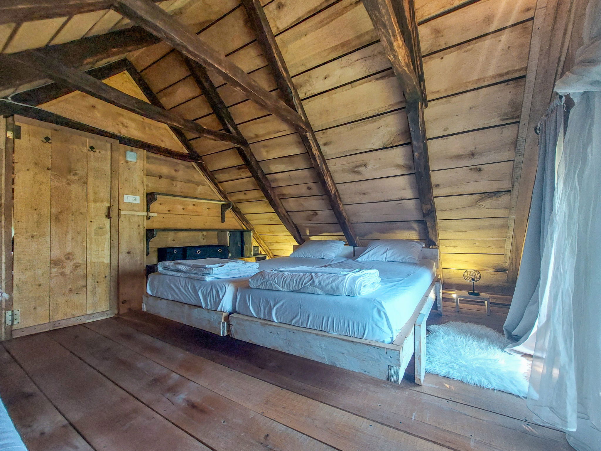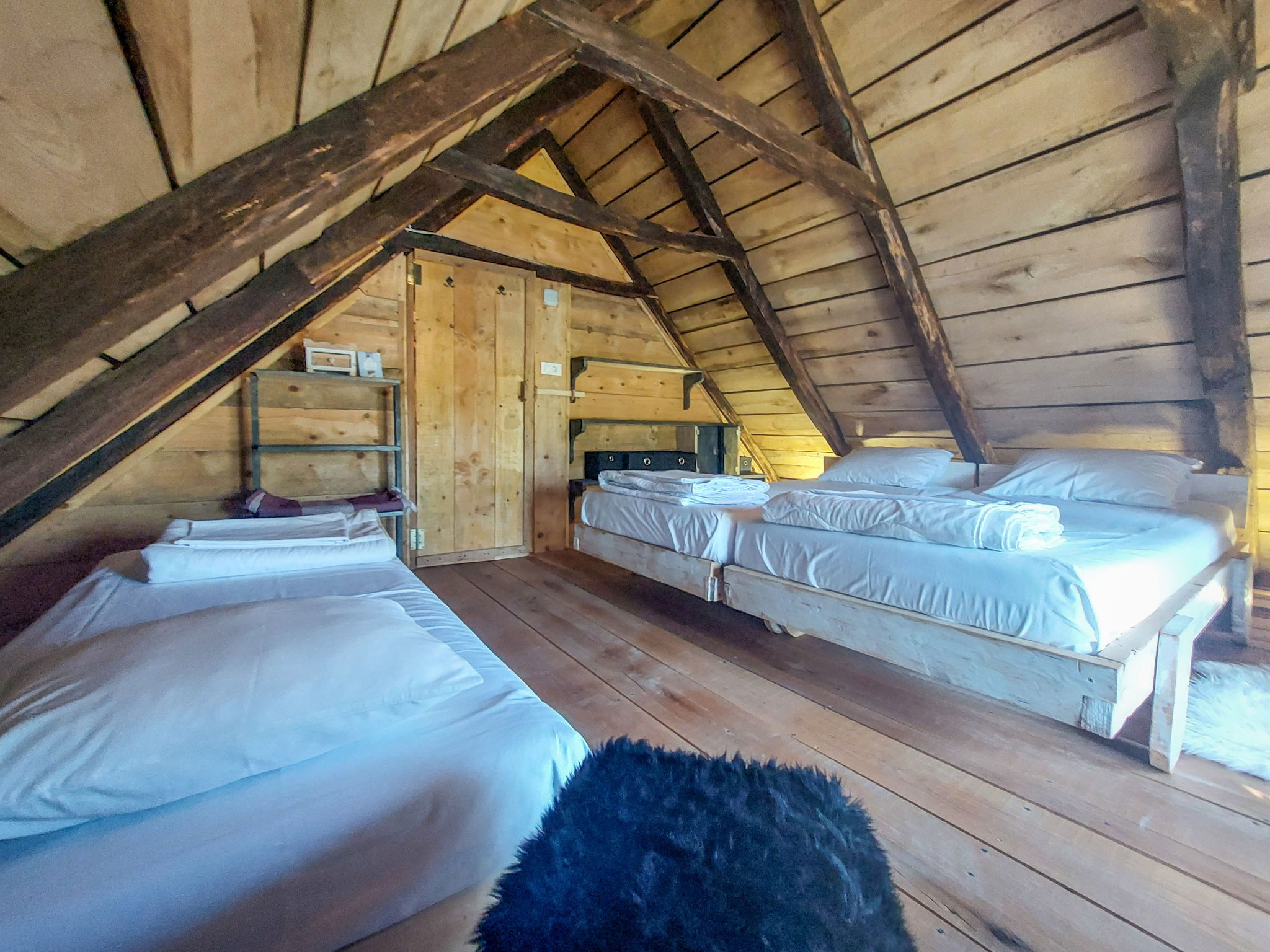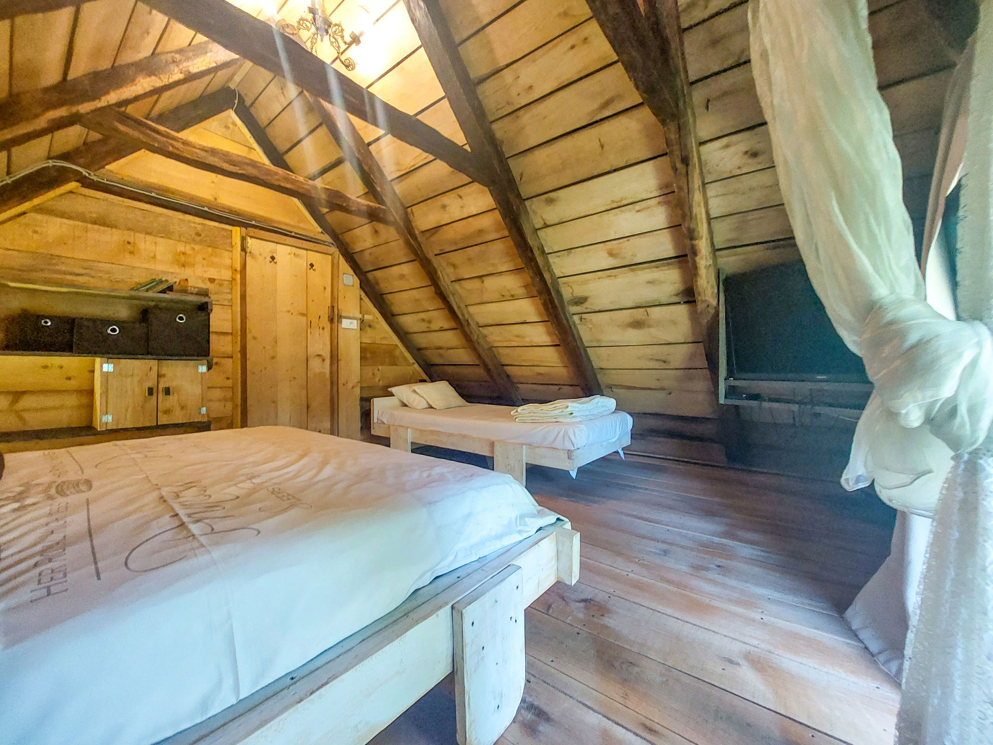 3-room house 130 m2 on 2nd floor. Wooden furniture furnishings: living/dining room with Scandinavian wood stove and satellite TV. Exit to the terrace. Open kitchen (oven, dishwasher, 4 ceramic glass hob hotplates, toaster, kettle, freezer, electric coffee machine) with dining table. Bath/shower. Electric heating, wood heating. Heating available only from 15.09. to 15.05. Upper floor: (steep stair) walk-through room, ceiling height 50 - 190 cm with 2 beds (90 cm, length 200 cm), air conditioning. 1 room with sloping ceilings, ceiling height 50 - 190 cm with 3 beds (90 cm, length 200 cm). 1 room with sloping ceilings, ceiling height 50 - 190 cm with 1 bed (90 cm, length 200 cm), 1 french bed (180 cm, length 200 cm), TV. Comfortable furnishings in the country house style. Terrace 20 m2, roofed. Terrace furniture. Facilities: Internet (WiFi). Please note: non-smoking house. Maximum 2 pets/ dogs allowed. Fire extinguisher.