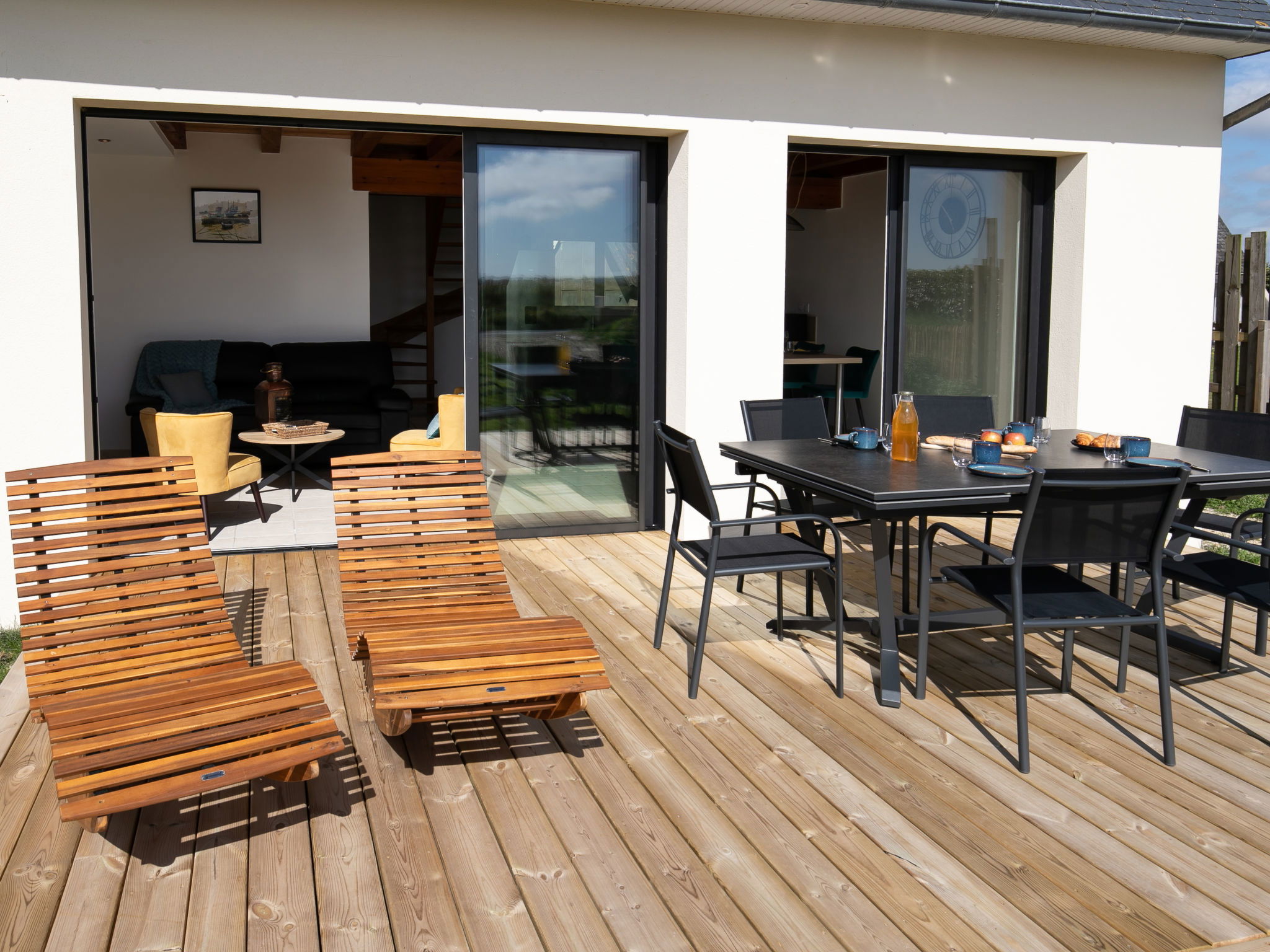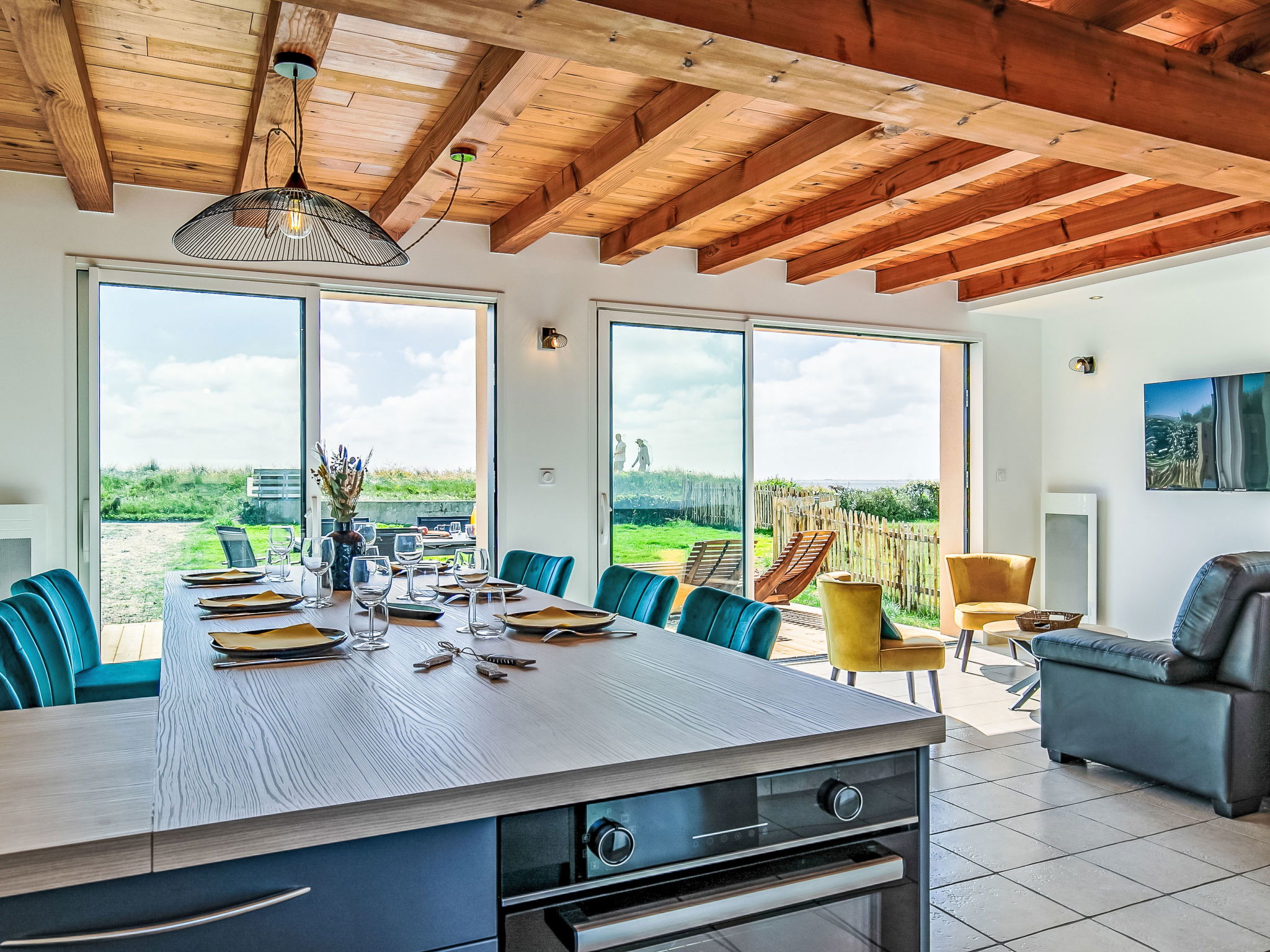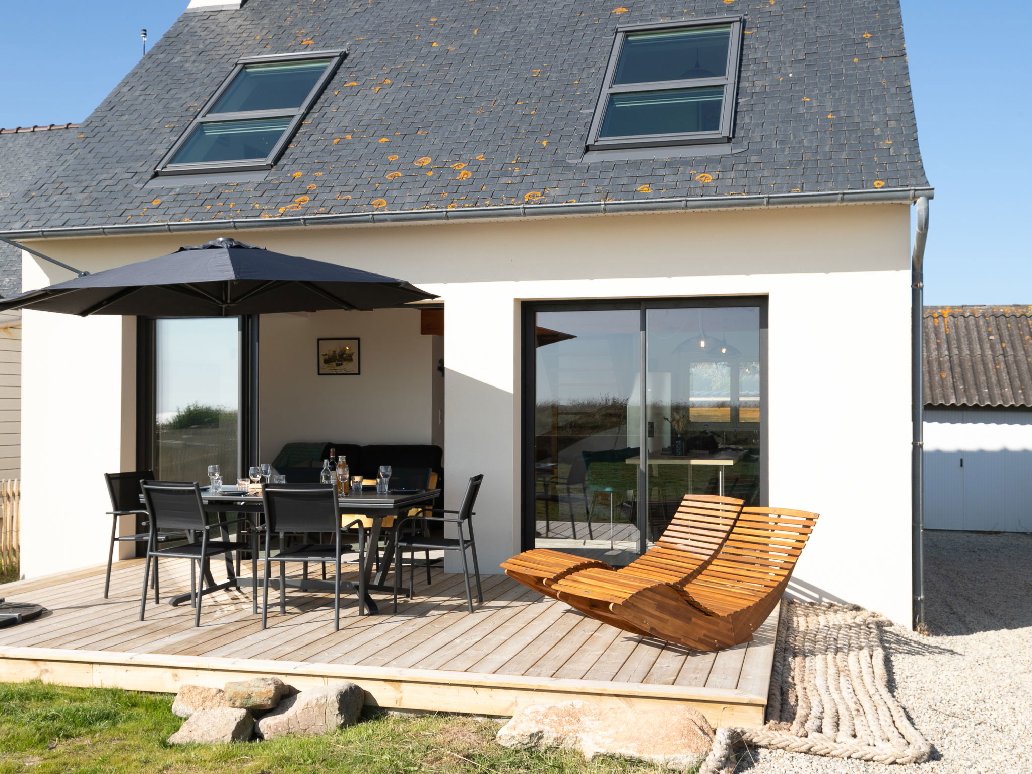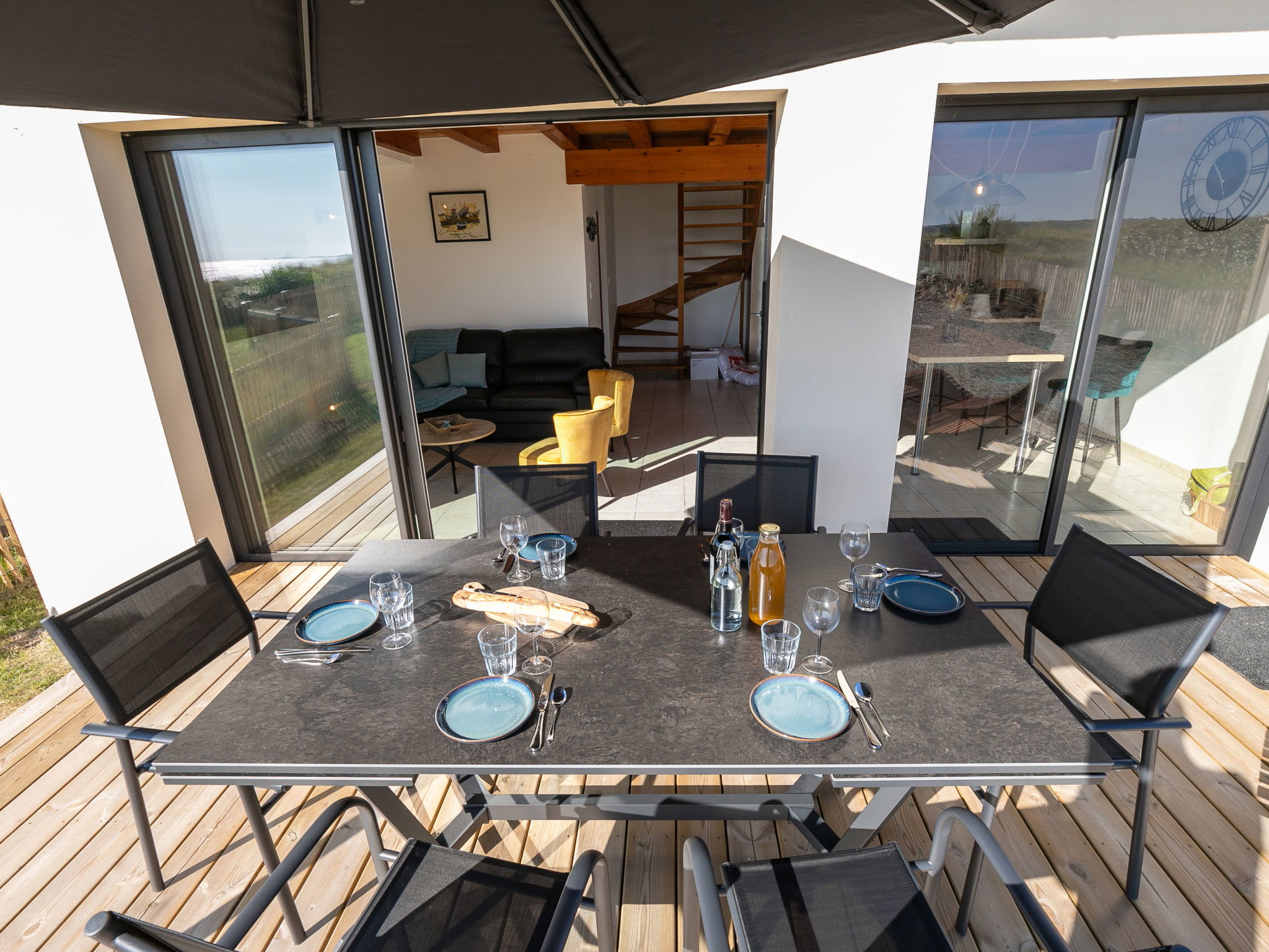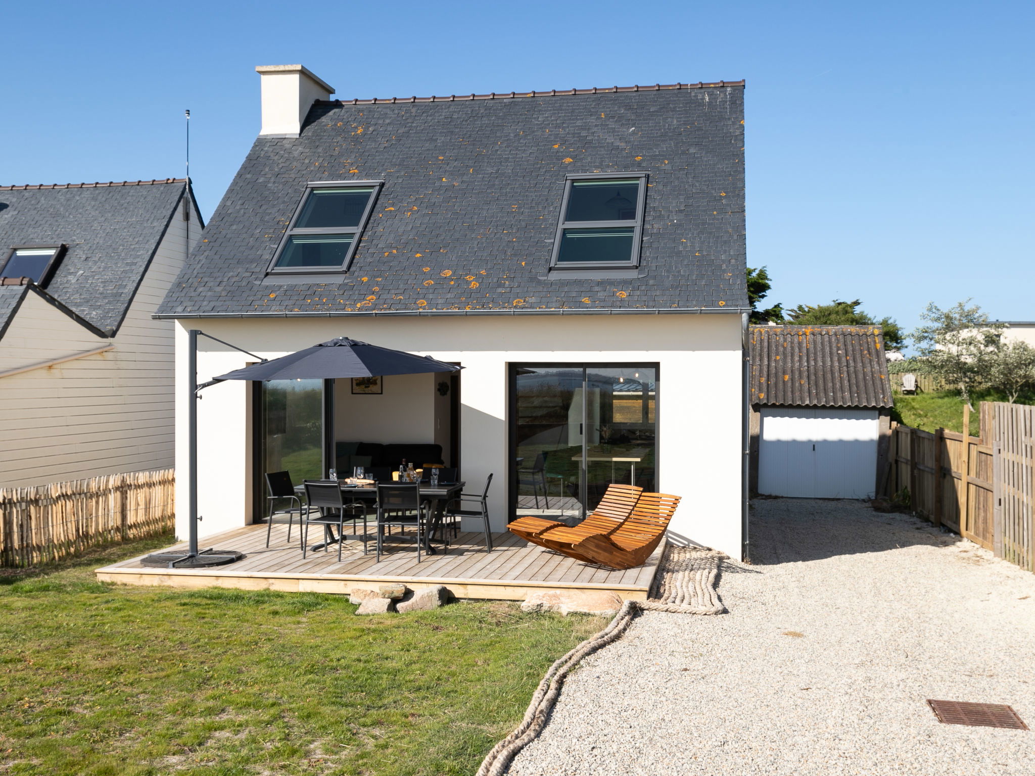 "Les reflets bleus", 4-room house 80 m2 on 2 levels. Bright, fully renovated in 2025, comfortable and tasteful furnishings: open living room 45 m2 with TV and flat screen. Exit to the terrace. Open kitchen (oven, dishwasher, 3 induction hot plates, toaster, kettle, microwave, freezer, electric coffee machine, Capsules for coffee machine (Senseo) extra) with dining table. Shower/WC. Upper floor: 1 room with 1 french bed (160 cm, length 200 cm). 1 room with 1 french bed (140 cm, length 190 cm). 1 room with 1 pull-out bed (2 x 90 cm, length 190 cm). Shower/WC. Electric heating. Terrace 20 m2, south-west facing position. Terrace furniture, deck chairs (2). Beautiful view of the sea. Facilities: washing machine, dryer, baby cot for up to 2 year olds, hair dryer. Internet (WiFi, free). Please note: non-smoking house. Maximum 1 pet/ dog allowed. Smoke alarm. Offer by a private individual according to Art. 155, IV of CGI.