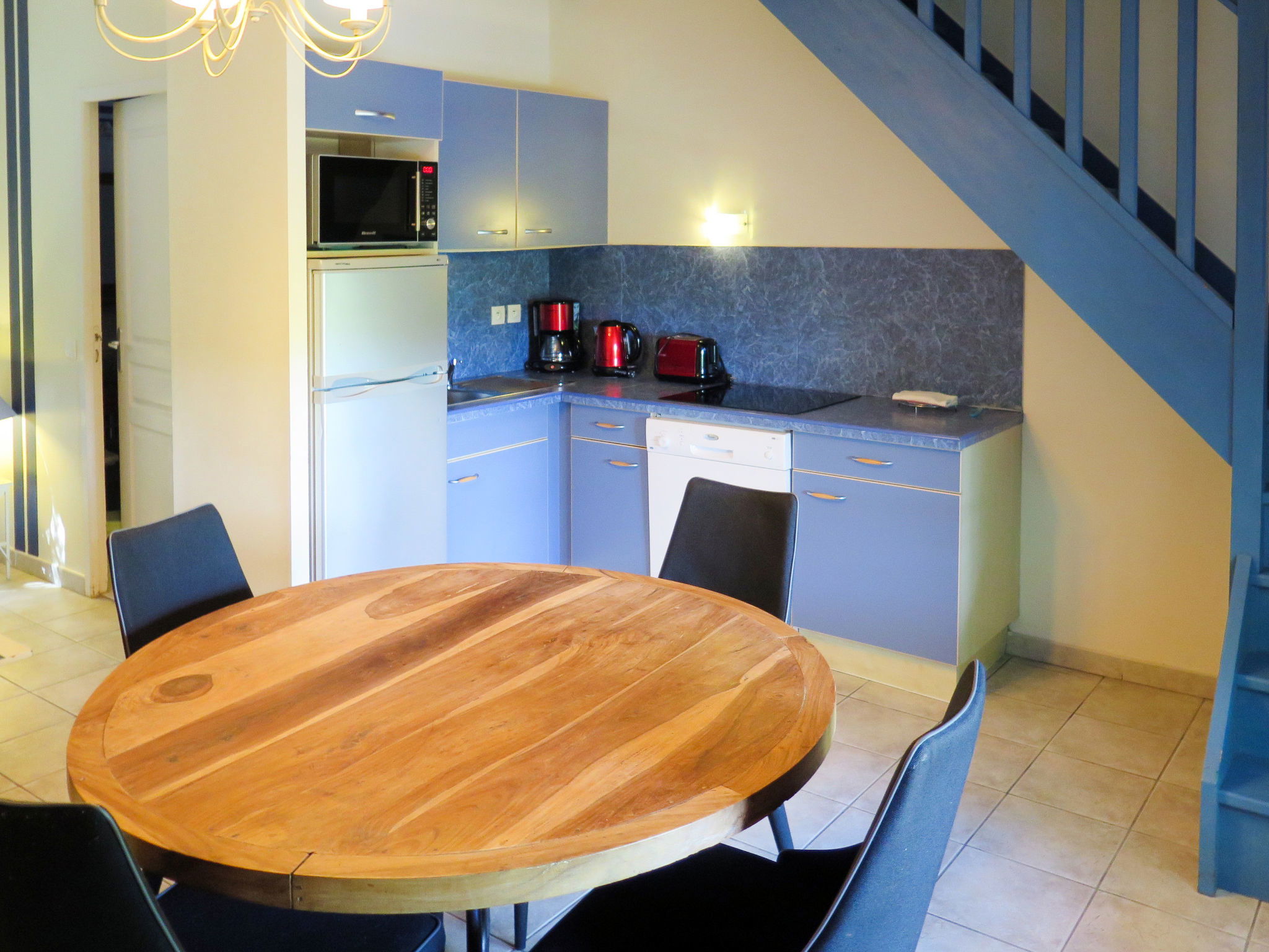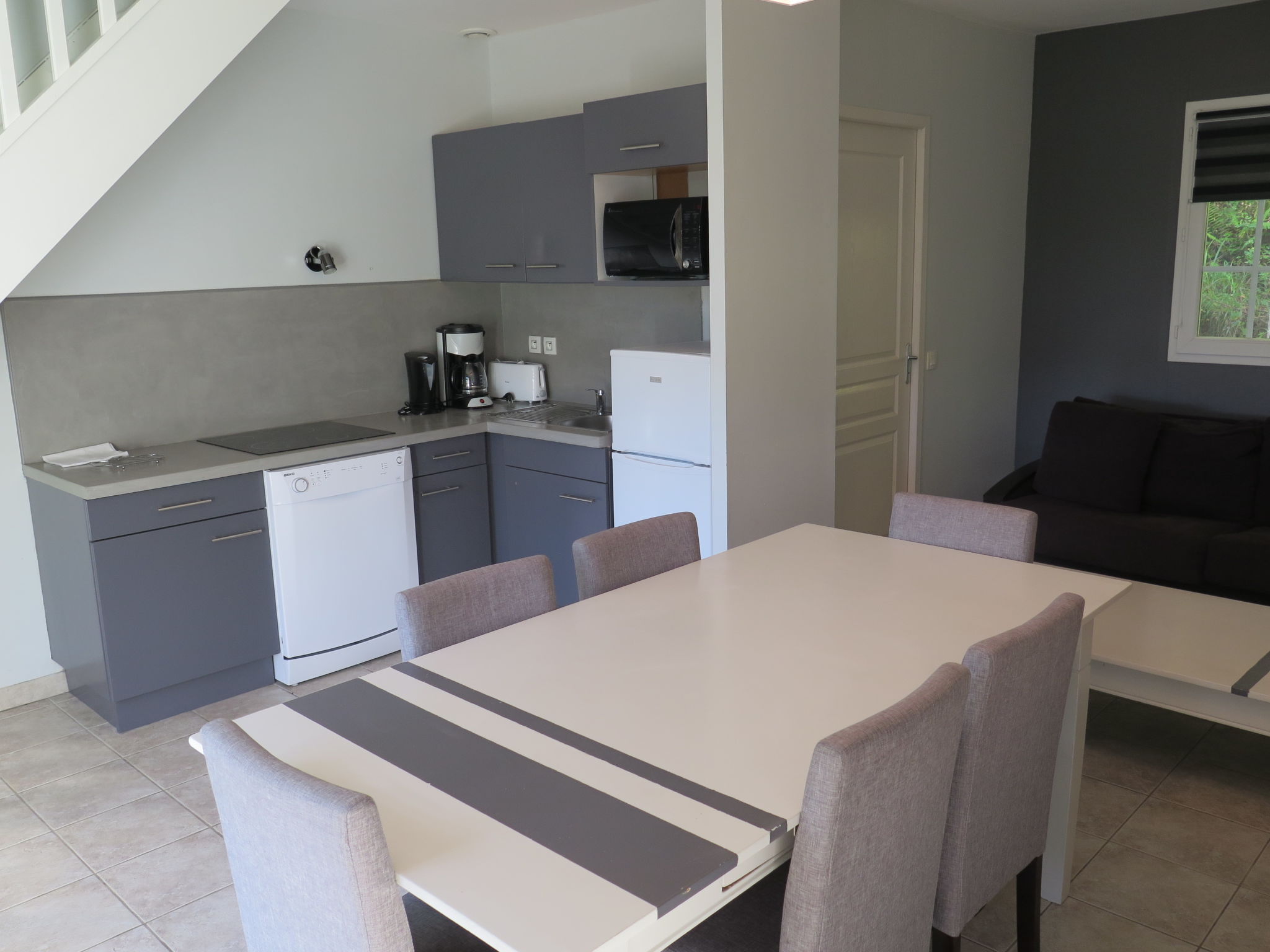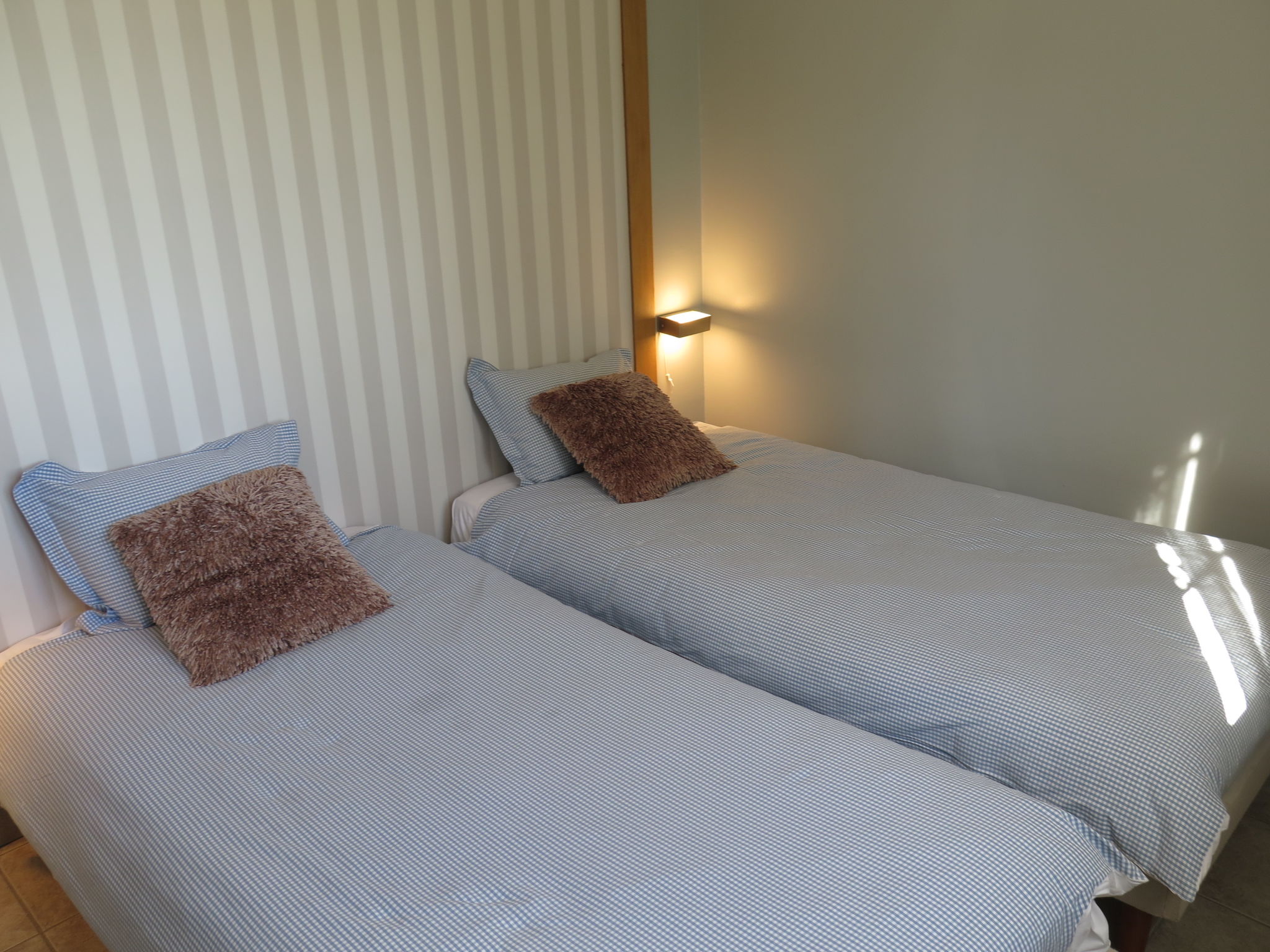 "Collines Iduki", 3-room terraced house 45 m2 on 2 levels. Beautiful and cosy furnishings: living/sleeping room with 1 double sofabed (160 cm, length 200 cm), dining table and satellite TV. Exit to the terrace. Kitchenette (dishwasher, 4 ceramic glass hob hotplates, toaster, kettle, freezer, electric coffee machine, Capsules for coffee machine (Nespresso) extra, combination microwave). Shower/WC. Upper floor: 1 room with 1 french bed (160 cm, length 200 cm). 1 room with 2 beds (80 cm, length 190 cm). Bath/WC. Electric heating. Terrace. Terrace furniture. Facilities: children's high chair, baby cot. Internet (WiFi, free). Please note: non-smokers only. Maximum 1 pet/ dog allowed. Smoke alarm.