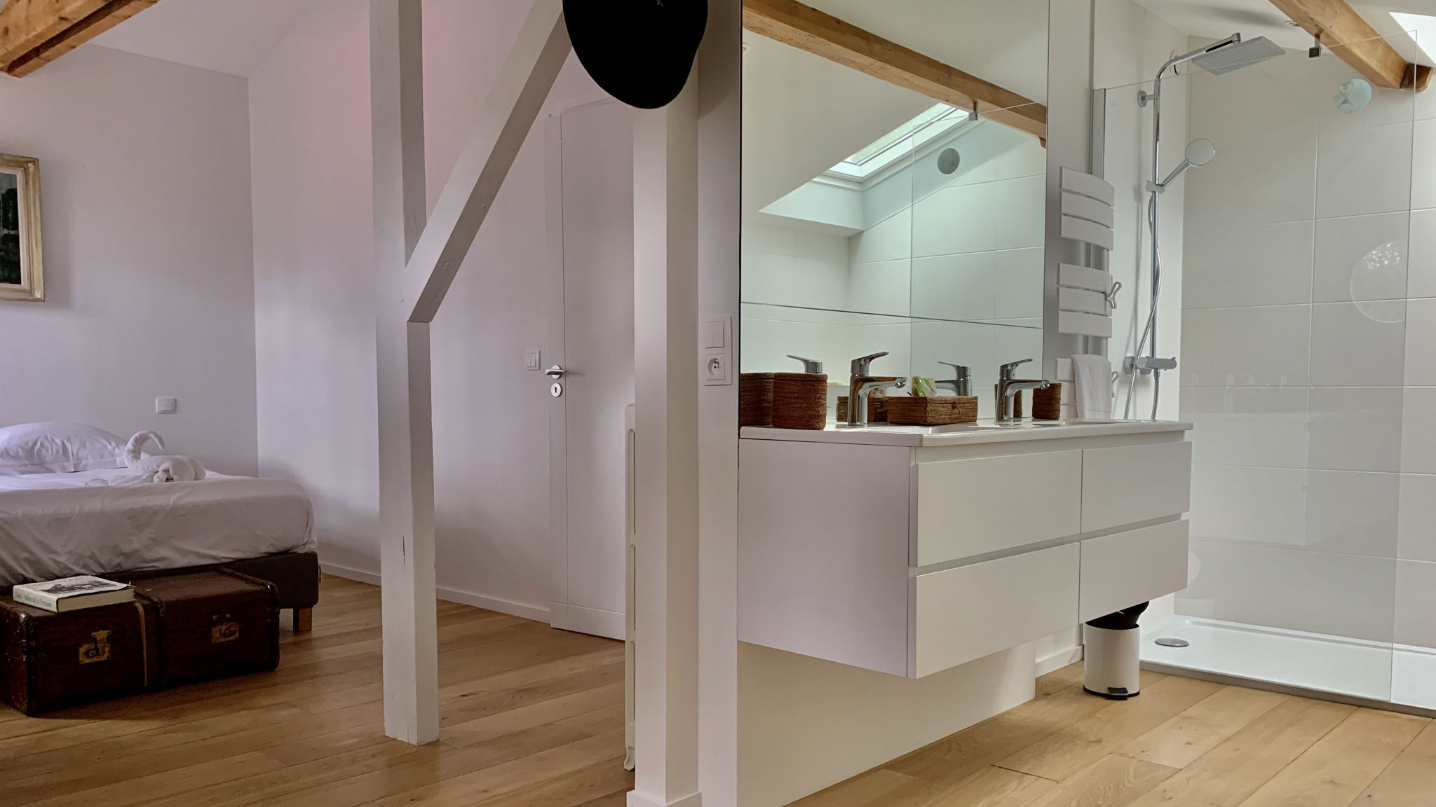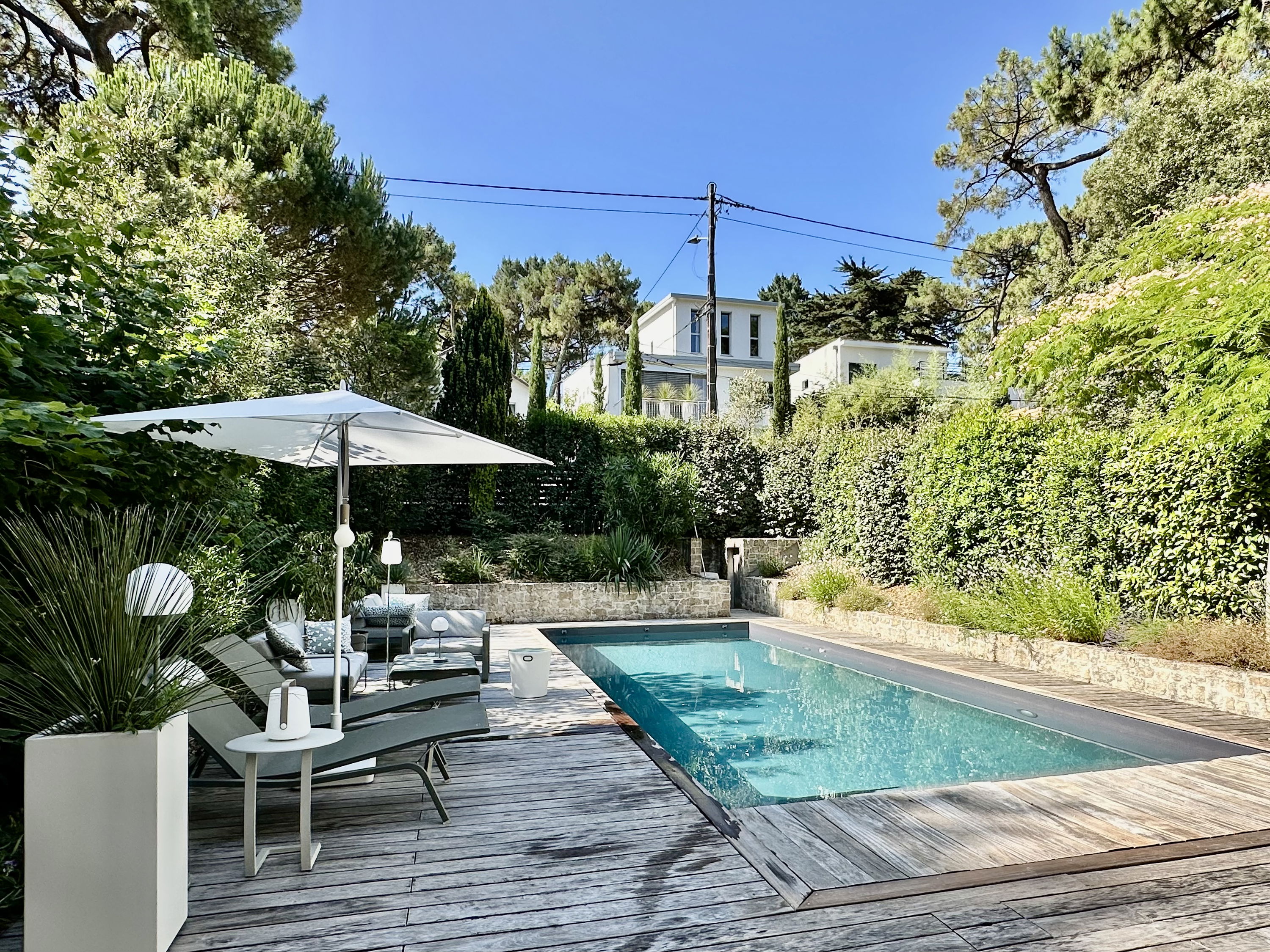 Superb fully renovated villa, close to the Tennis Garden in La Baule. In a quiet and residential area, this villa offers a view of its 9 mx 3 m heated swimming pool: Main villa: Entrance / hallway - Separate suspended WC with washbasin - Parquet floored living room with fireplace opening onto a south-facing terrace - Open kitchen overlooking terrace and garden with microwave, 5-burner piano + 2 ovens and bain-marie, cooker hood, fridge/freezer, dishwasher, wine cellar - 1st floor: Landing serving Bedroom n°1 with 180/200 bed and dressing room + adjoining bathroom and WC - Lingerie with washing machine and dryer - TV lounge. 2nd floor: Bedroom n°2 (dormitory) with 6 90/200 beds and cupboard + adjoining bathroom with cupboard - Independent suspended WC with washbasin - Bedroom n°3 with 160/200 bed and cupboard + adjoining shower room Annex house: Bedroom n°4 with 160/200 bed + wardrobe - shower room - Independent suspended WC - Additional kitchen (fridge, 2 induction rings, multifunction oven - Bedroom n°5 with 160/200 bed + wardrobe - bathroom Garage / boiler room with fridge and freezer - Enclosed garden Registration number at the town hall: 4405500150251