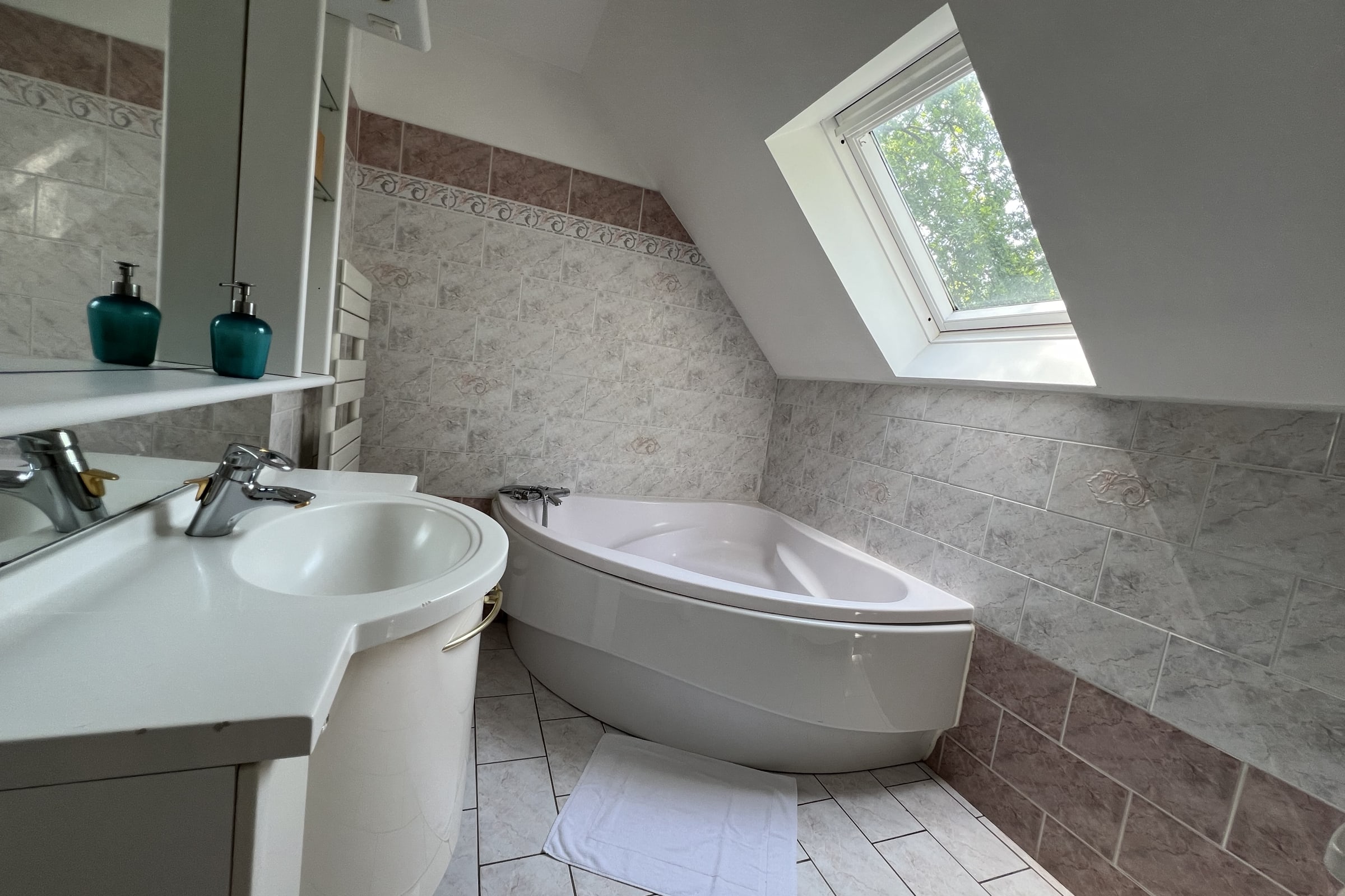 The second bathroom is located upstairs and is equipped with a vanity unit and a large bathtub.
