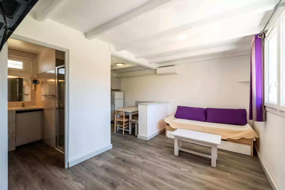 This welcoming space includes a cozy bedroom with a 160cm double bed and an additional single bed, comfortably accommodating up to three people. The living room also features an additional single bed, making it ideal for families or groups of friends.