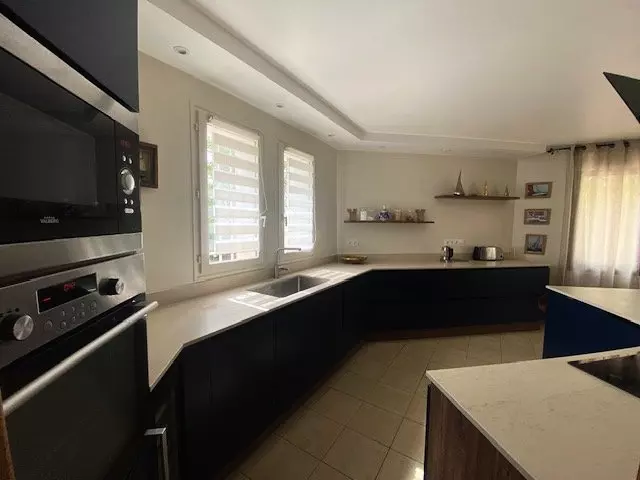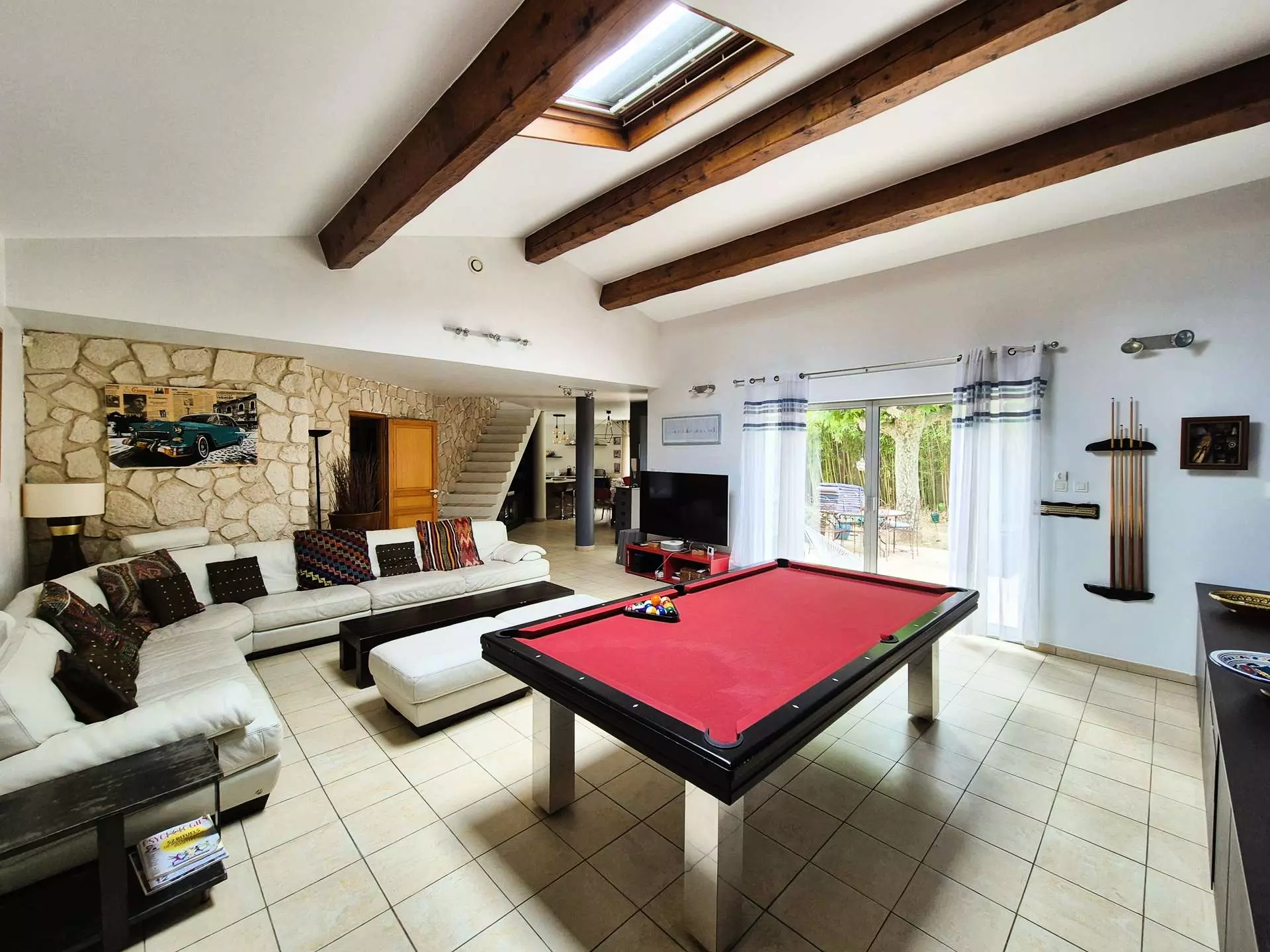 Large open fitted kitchen + utility room, beautiful bright living room of 50 m² (non-convertible corner sofa), billiards, opening onto the terraces.