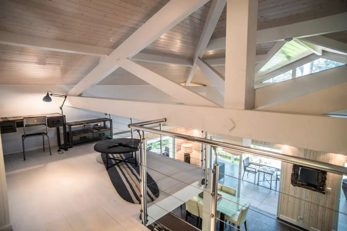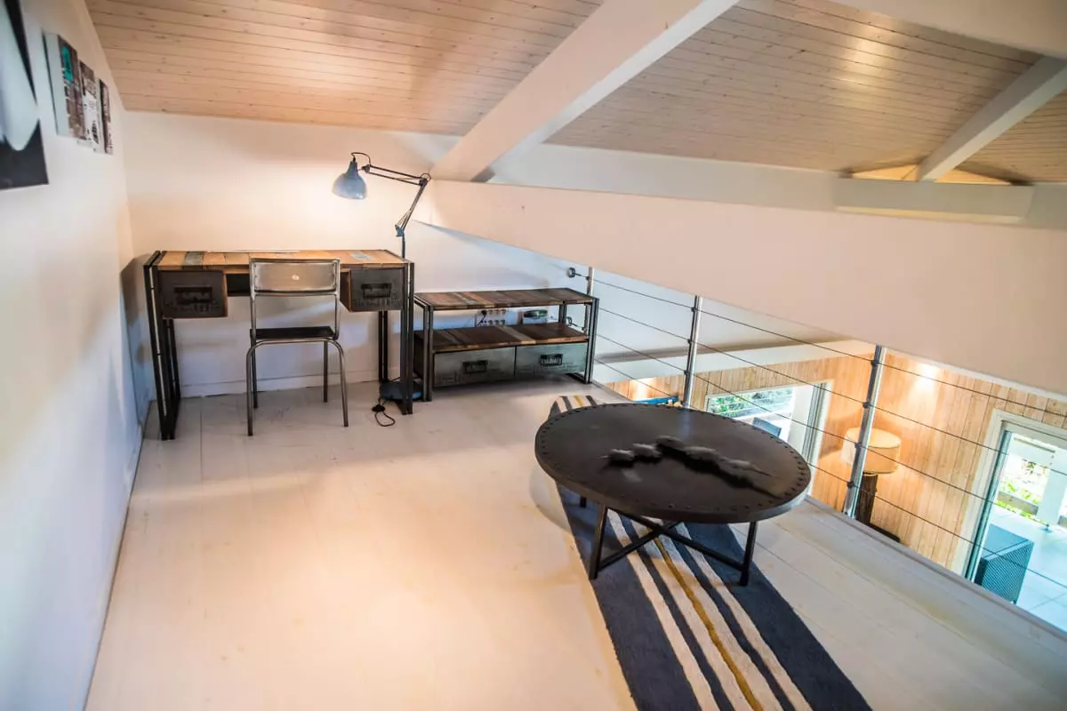 On the mezzanine, two bedrooms with two single beds each share a bathroom with shower and WC, as well as an office area.