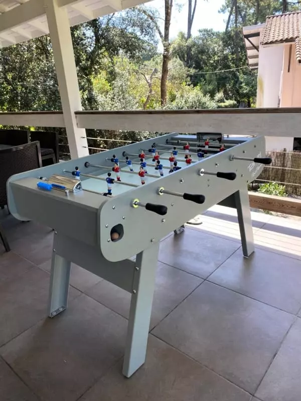 Two large, comfortable sofas invite you to relax. This room opens onto a large, sunny terrace featuring a shaded dining area with a large table for 10 people, an electric grill, and a table football table. On the other side, two sofas invite you to nap near a garden furniture set and the swimming pool.