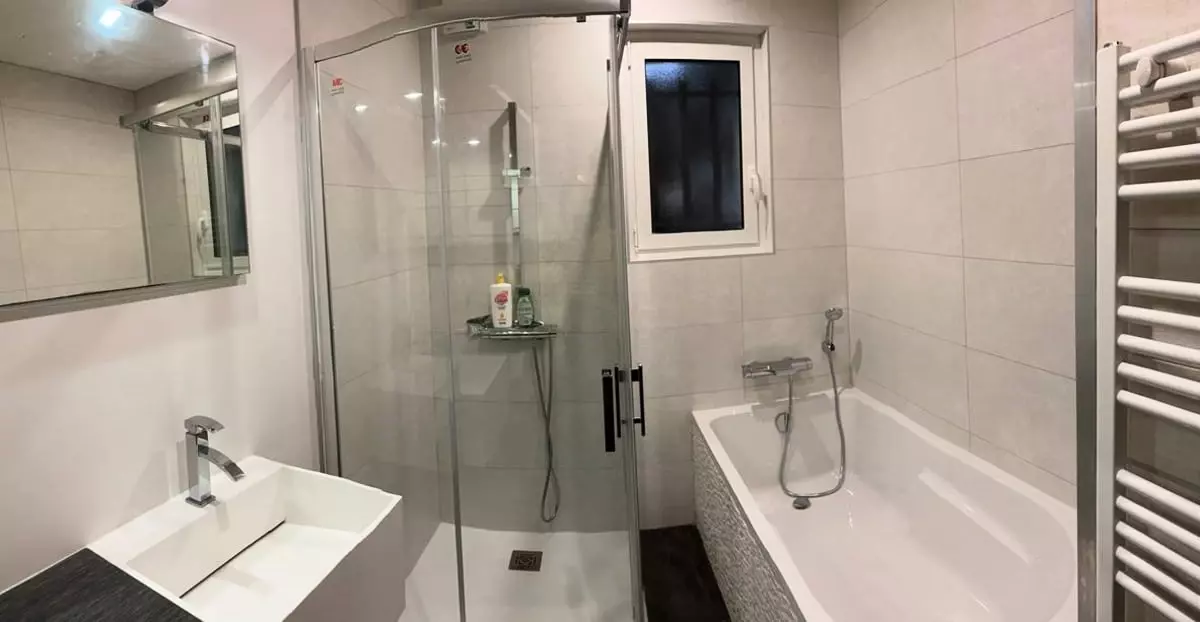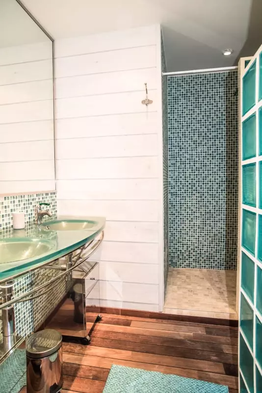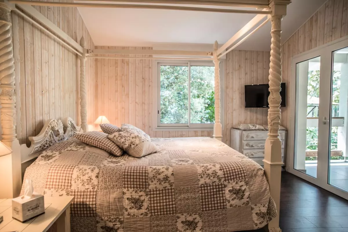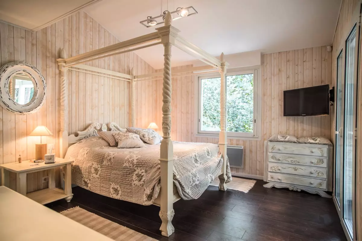 On the main level, to the left you will find a bedroom with a large double bed, a bathroom with a shower and a bathtub, and a separate guest toilet. To the right you will discover the master bedroom with its four-poster bed and a bathroom equipped with a shower, a double sink, and a toilet.