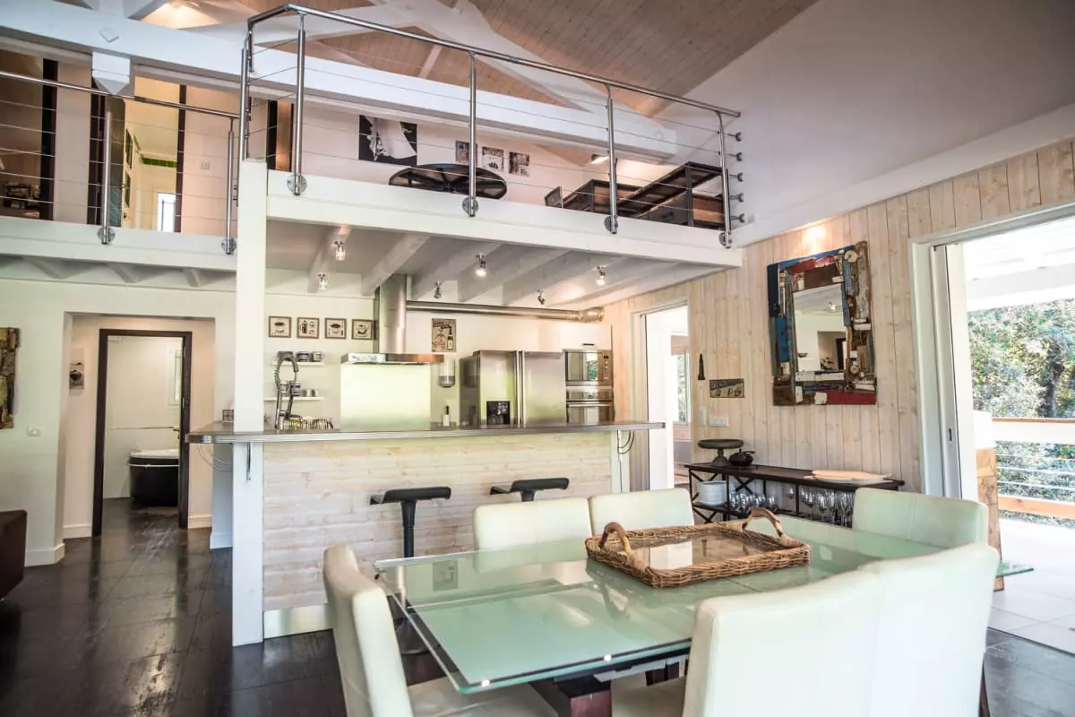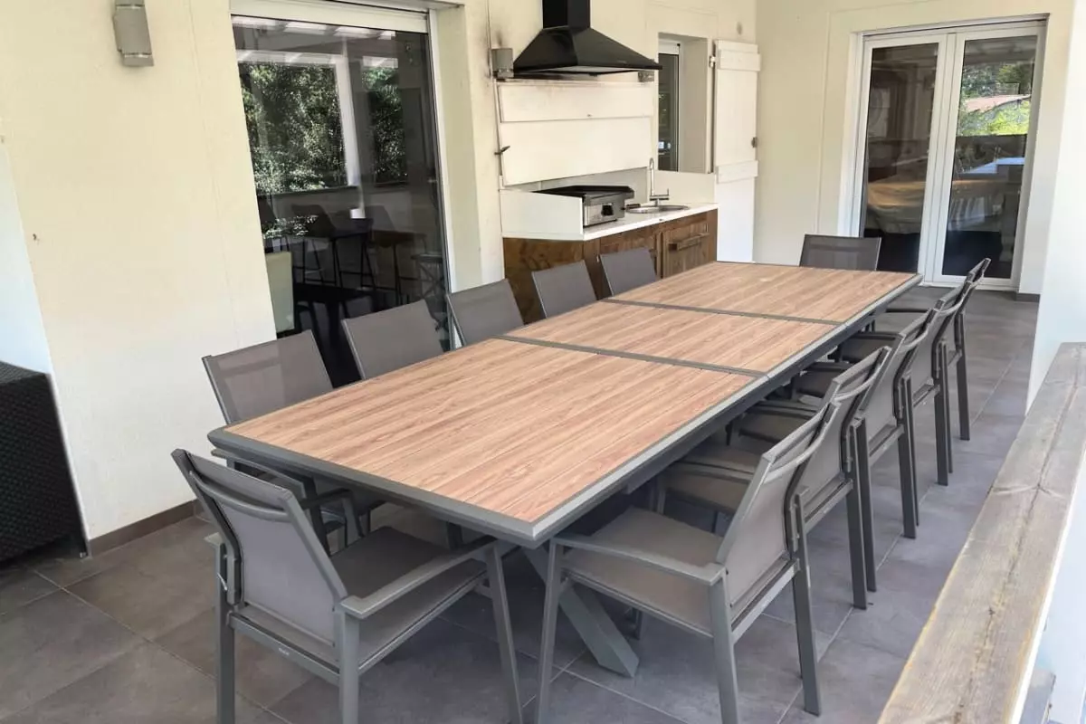 On the terrace surrounding the house, chairs and a dining table for 12 people are arranged, perfect for dining in the shade while enjoying the outdoors and the fresh air. A separate unit is installed on the terrace, with a sink, griddle and extractor fan, so you can cook directly outside.