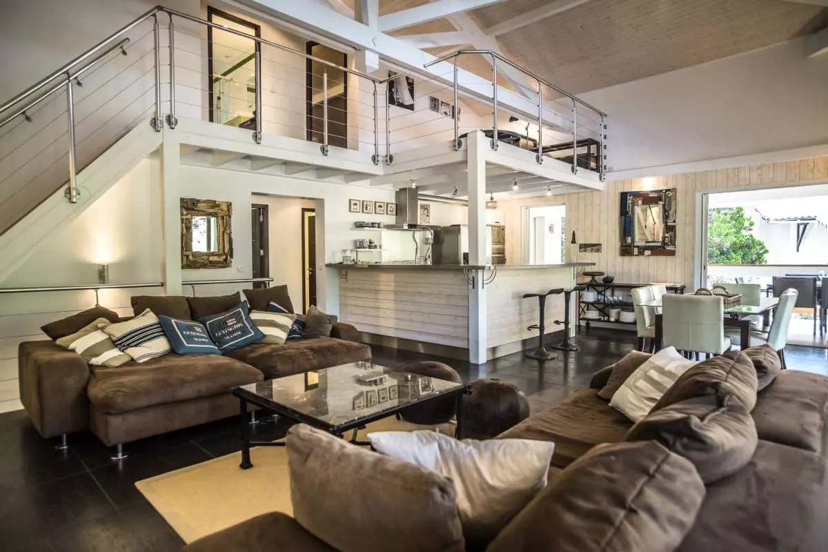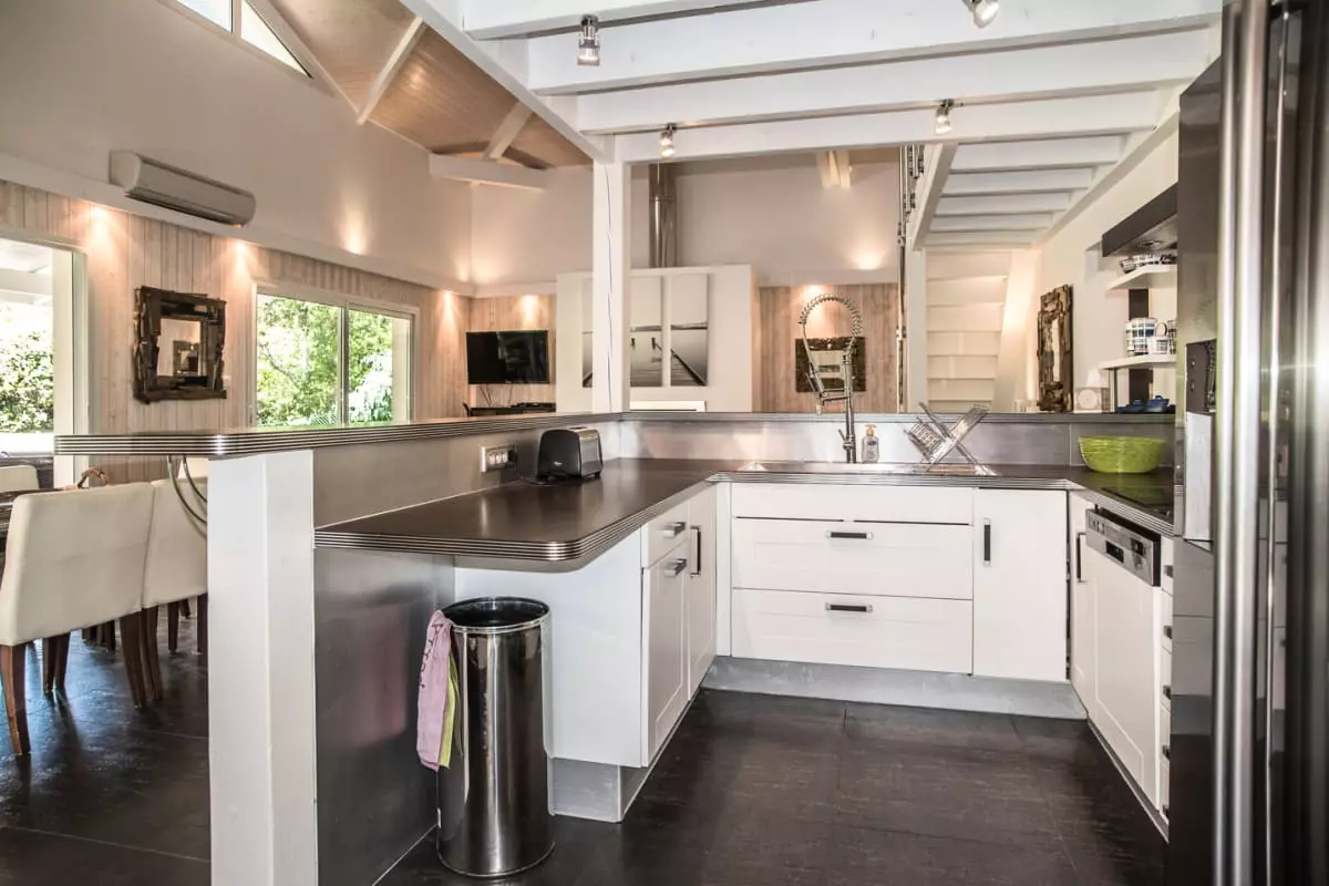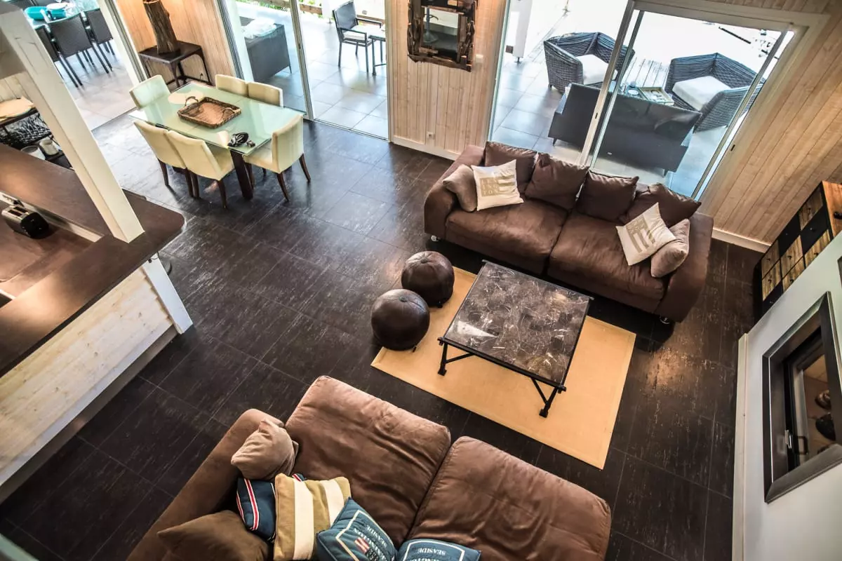 In the living/dining area bathed in light thanks to its high ceilings, the centerpiece of the villa, you will discover an open kitchen, a bar counter, a dining area with a table for 6 people (with extension) and a lounge area equipped with a flat-screen television and a Sonos audio system.