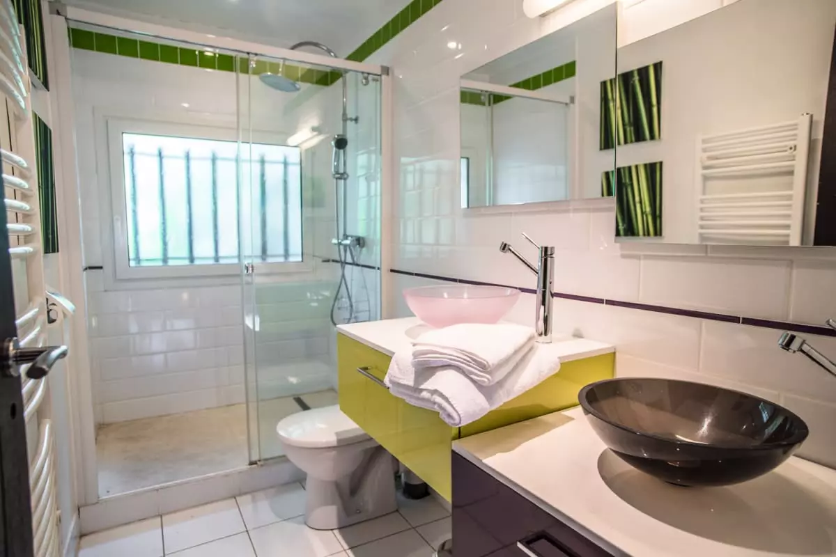 On the garden level, you will find the last bedroom with its own bathroom including a shower and a toilet, as well as the laundry room (washing machine + dryer) and a games room equipped with a billiards table and a television.