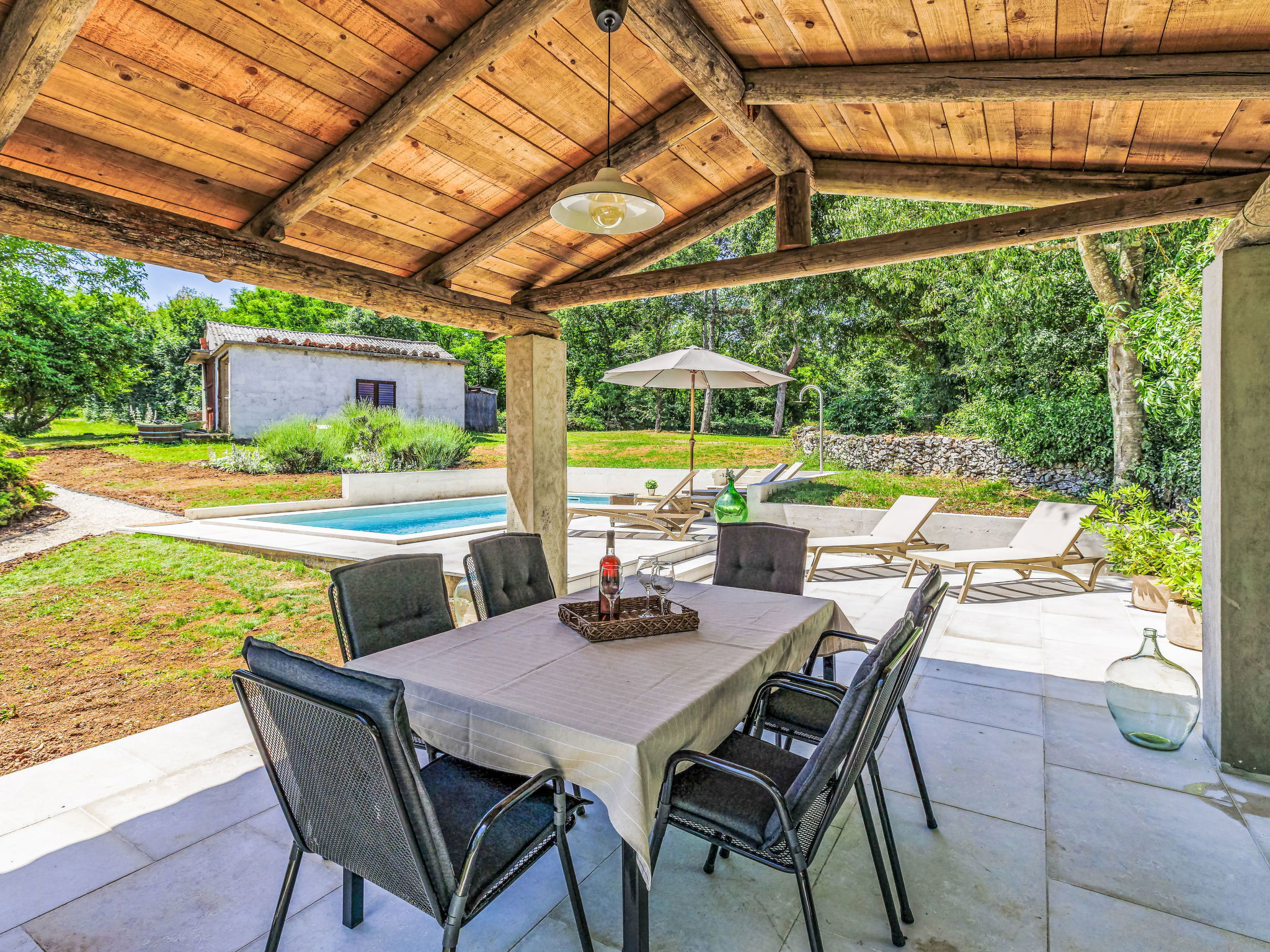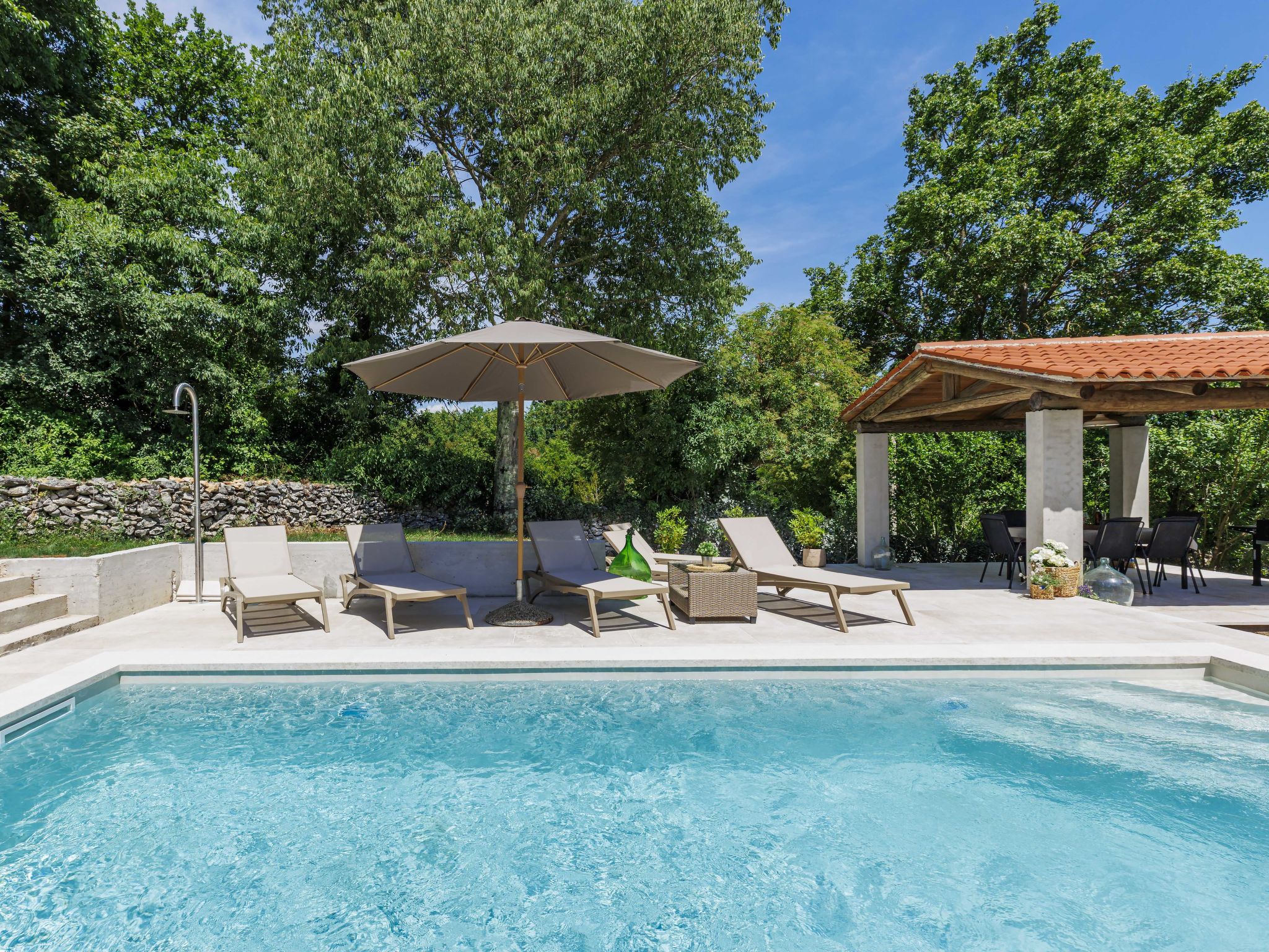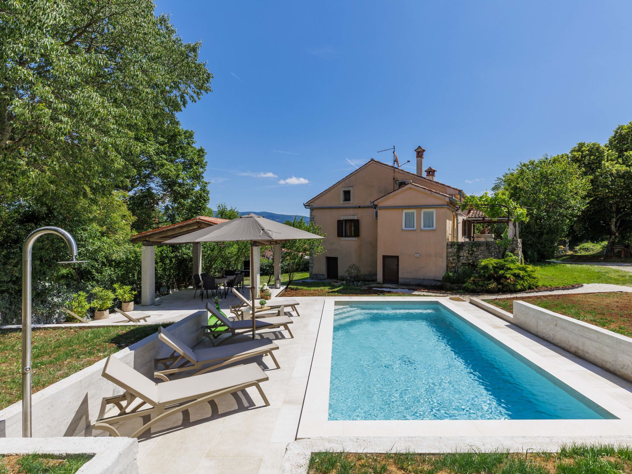 Single-family house "Nino", 2 storeys. In the district of Veljaki 1 km from the centre of Kršan, 12 km from the centre of Labin, 15 km from the centre of Rabac, 15 km from the sea. Private: property 1'200 m2 with lawn and trees, swimming pool angular (25 m2, depth 140 cm, seasonal availability: 01.May. - 04.Oct.). Outdoor shower (swing). In the house: internet access, trampoline, washing machine. Parking at the house on the premises. Shop 1 km, bus stop 5.2 km, pebble beach 15 km. Marina 15 km. Part of the house is closed and unoccupied.
