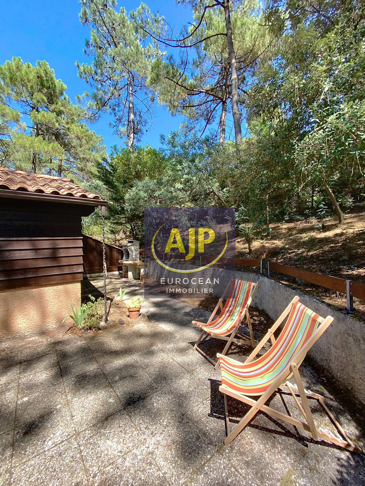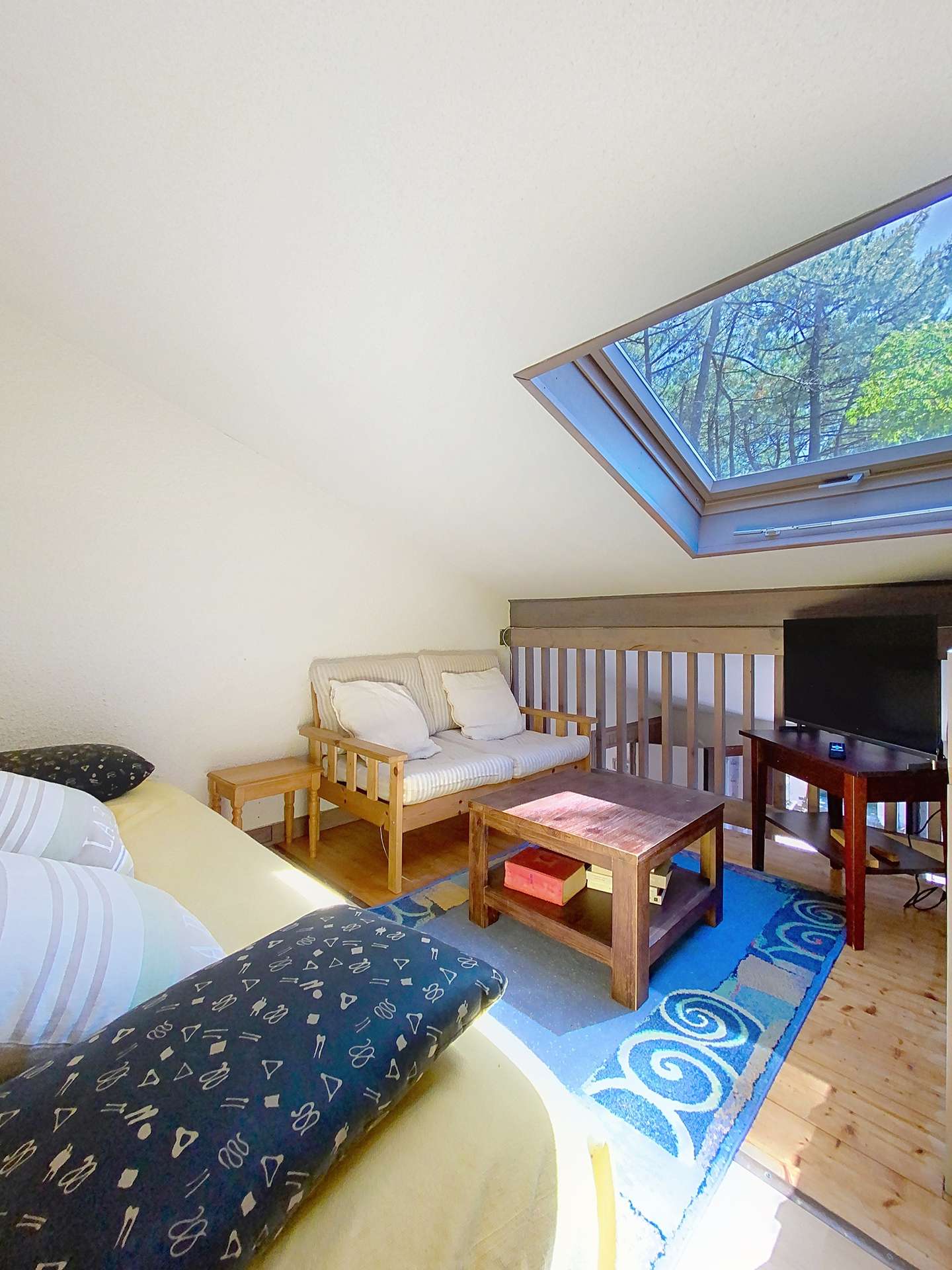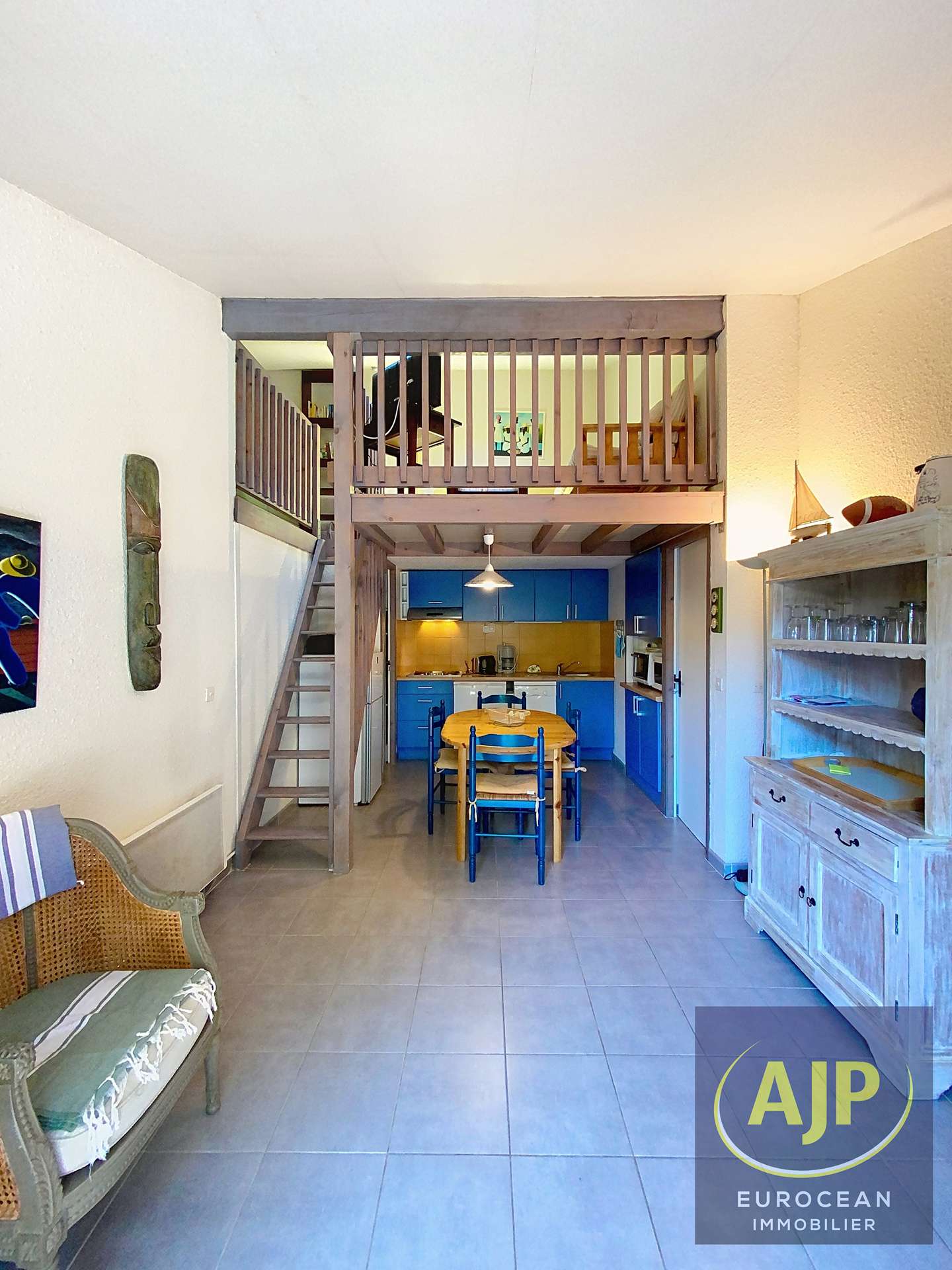 "Les Coulemelles", a pedestrian residence located at the foot of the Aubarède dune, on the edge of the forest enjoys easy access to cycling trails and hiking trails allowing you to reach beaches and the center. This pretty semi detached house with a neat decoration, about 45m² is ideal for four/six people. The living room with equipped kitchenette opens, by window door on a south facing terrace, equipped with garden furniture. Two bedrooms each with a double bed (sleeping 140cm) and a mezzanine with a single bed and a sofa bed(120cm). Shower room includes a shower cabin, sink, washing machine and toilet. Your pet is welcome in this accommodation. There is a numberedcar park at the entrance of the residence. Join the beach and shops at 1,2 km, golf at 2 km and the lake at about 5 km (REF 02335M)