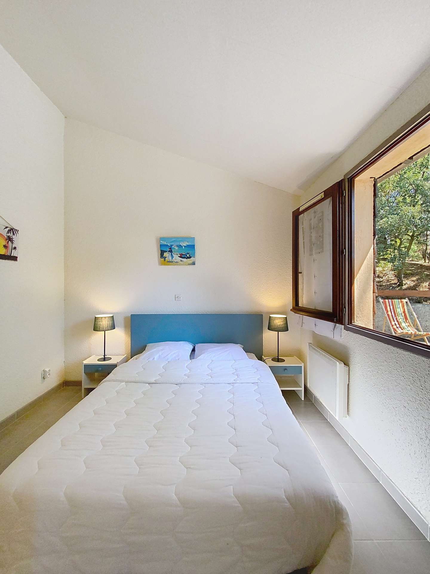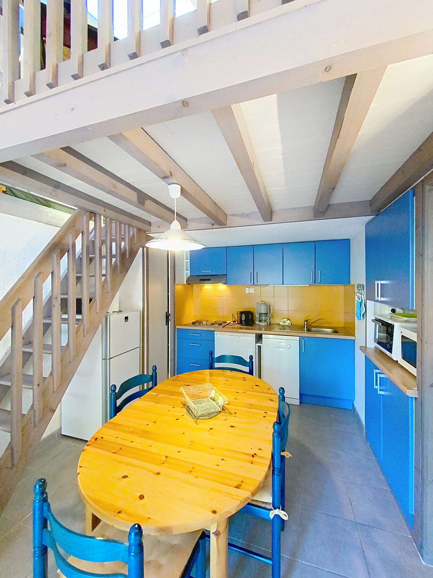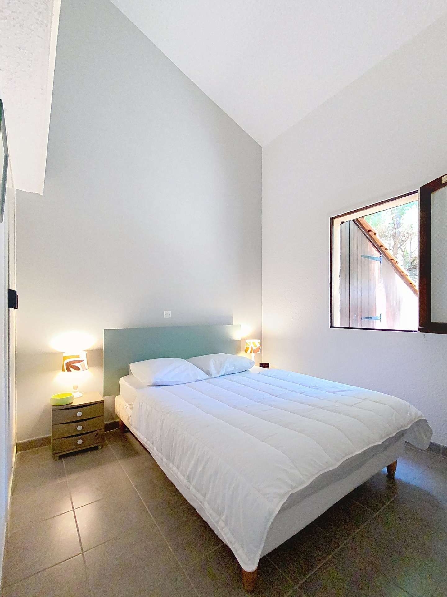 "Les Coulemelles", a pedestrian residence located at the foot of the Aubarède dune, on the edge of the forest enjoys easy access to cycling trails and hiking trails allowing you to reach beaches and the center. This pretty semi detached house with a neat decoration, about 45m² is ideal for four/six people. The living room with equipped kitchenette opens, by window door on a south facing terrace, equipped with garden furniture. Two bedrooms each with a double bed (sleeping 140cm) and a mezzanine with a single bed and a sofa bed(120cm). Shower room includes a shower cabin, sink, washing machine and toilet. Your pet is welcome in this accommodation. There is a numberedcar park at the entrance of the residence. Join the beach and shops at 1,2 km, golf at 2 km and the lake at about 5 km (REF 02335M)