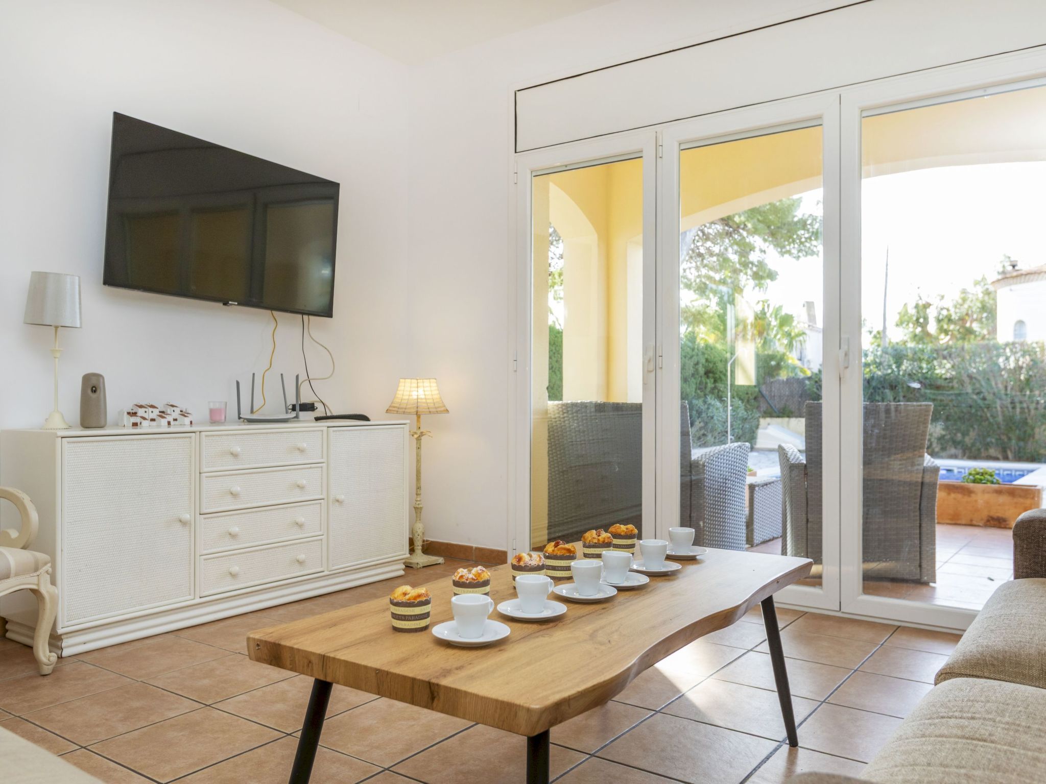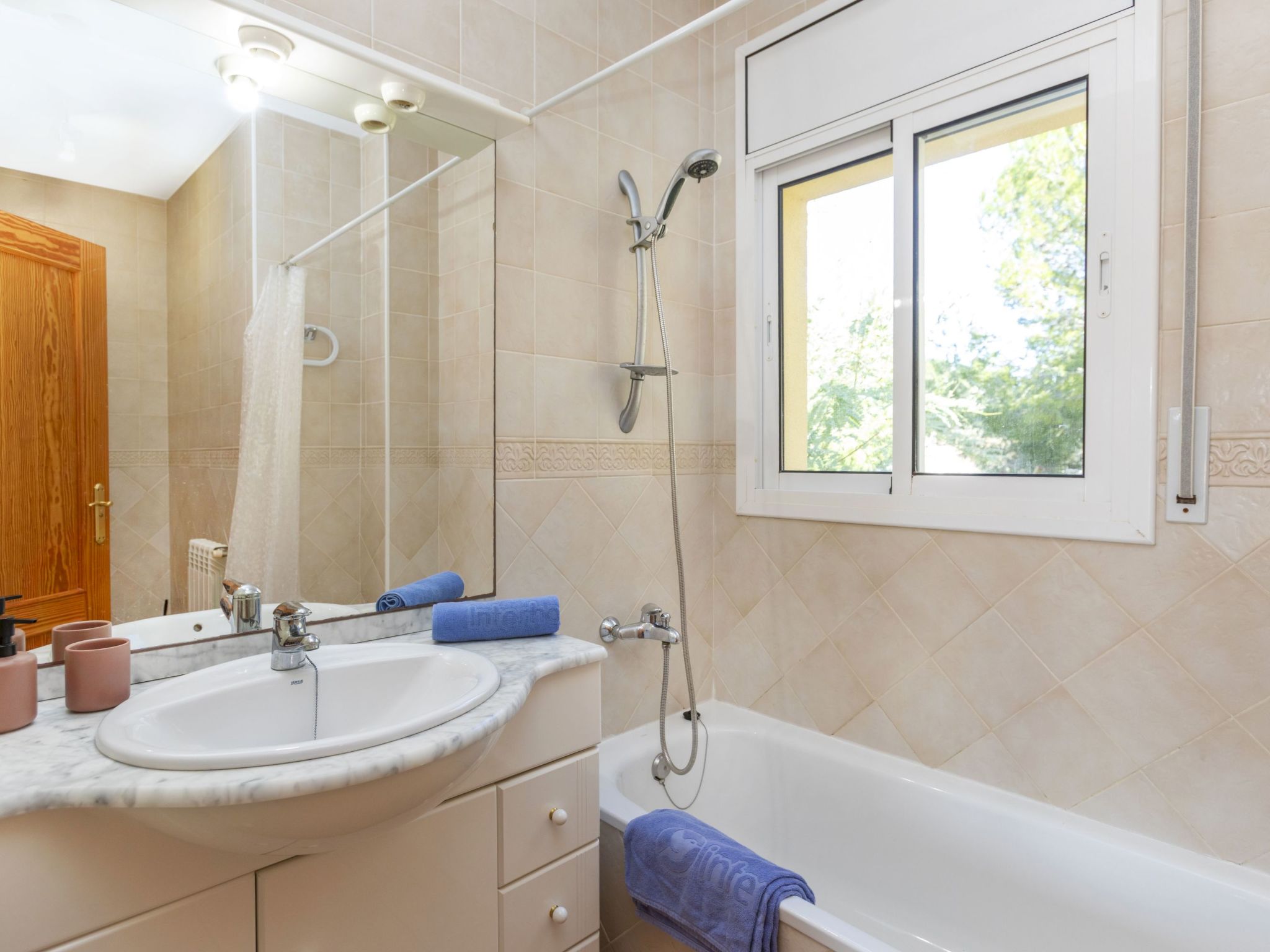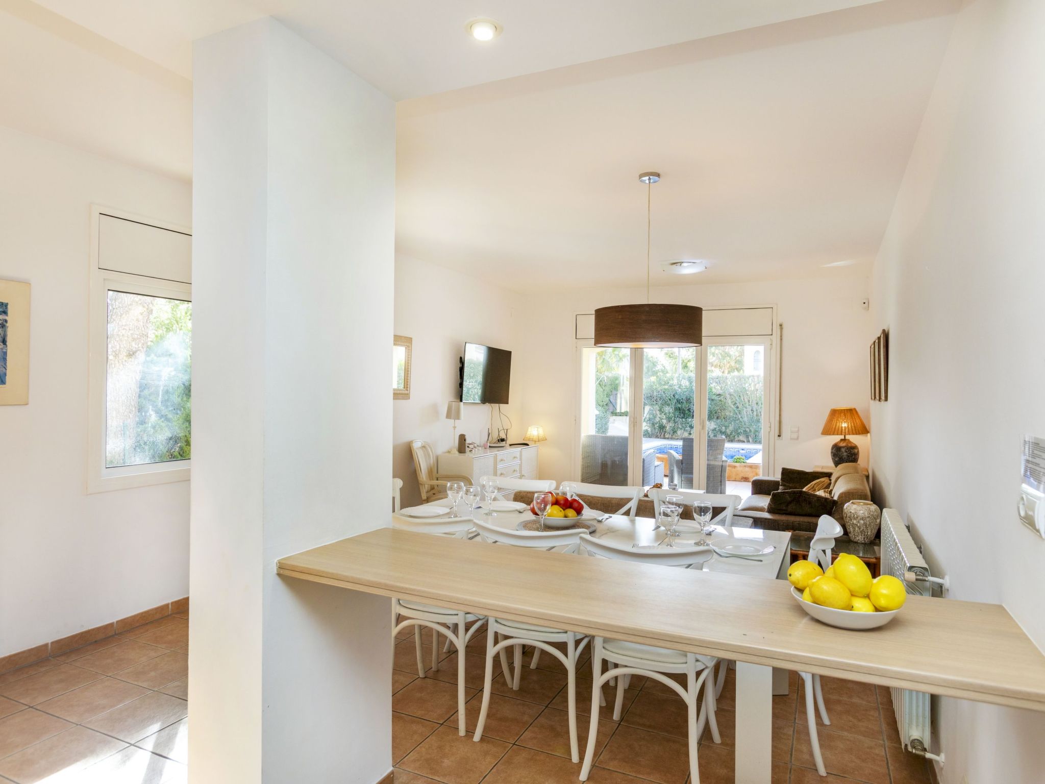 "Bonita", 5-room house 134 m2. Practical and cosy furnishings: living/dining room with satellite TV. Exit to the patio, to the swimming pool. 1 room with 1 french bed (150 cm, length 190 cm) with bathroom. Kitchen (oven, dishwasher, 4 ceramic glass hob hotplates, toaster, kettle, microwave, electric coffee machine). Bath/bidet/WC. Air-conditioning, forced-air heating. On the lower ground floor: 1 room with 1 french bed (150 cm, length 190 cm), shower/WC. 1 room with 2 beds (90 cm, length 190 cm). 1 room with 3 beds (90 cm). Terrace furniture, barbecue, deck chairs. View of the resort. Facilities: washing machine, iron, hair dryer. Internet (WiFi, free). Parking at the house. Please note: non-smoking house. Maximum 1 pet/ dog allowed. HUTT-008793 // Reg. Nr.: ESFCTU0000430200008818310000000000000000HUTTE-0008793