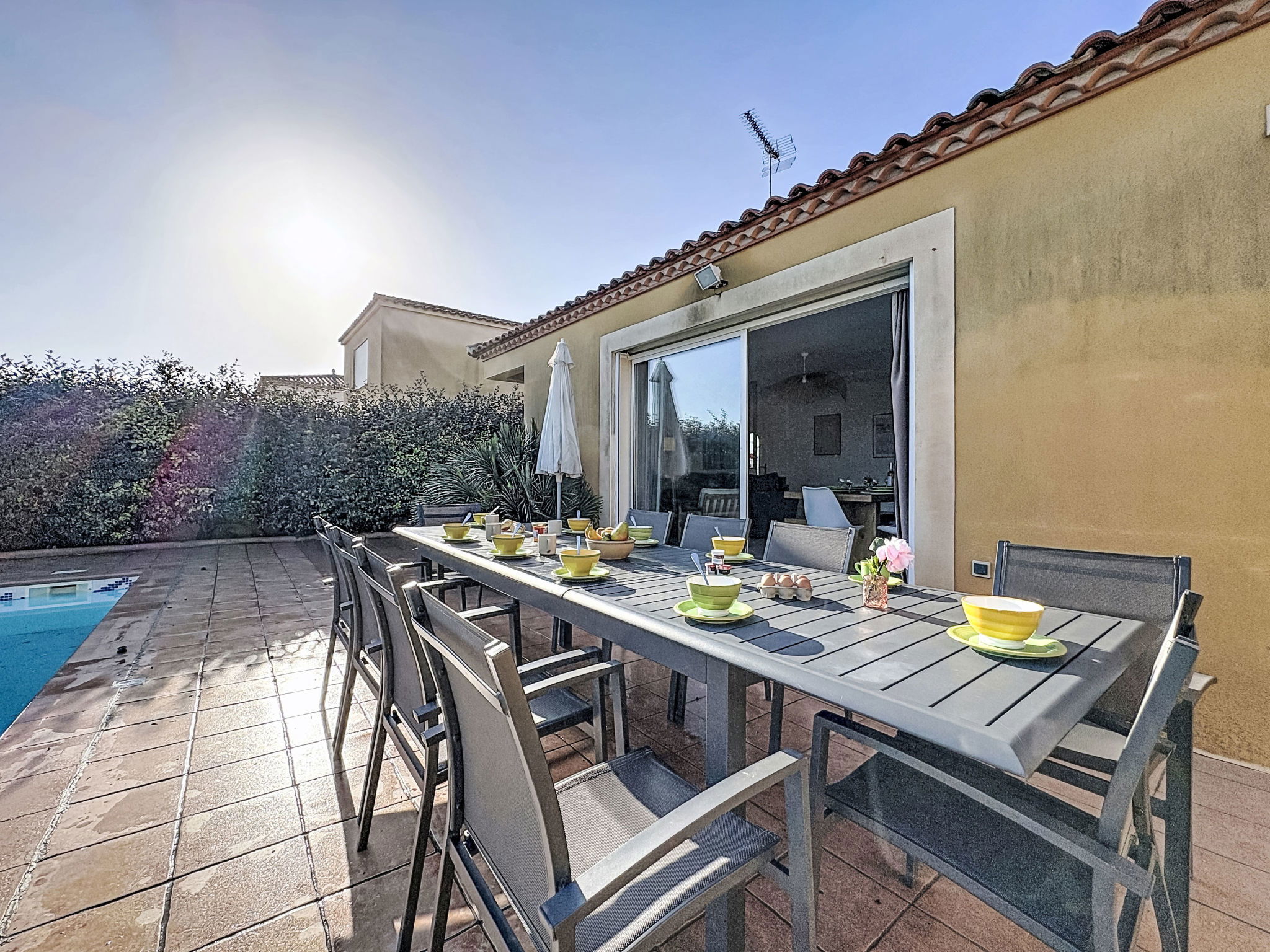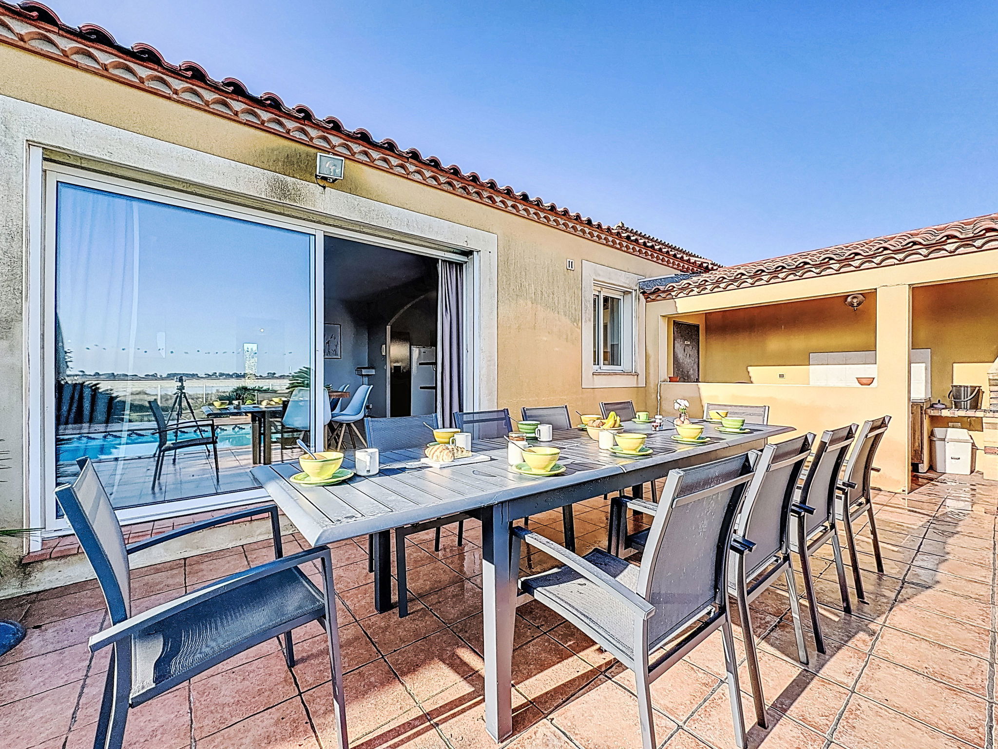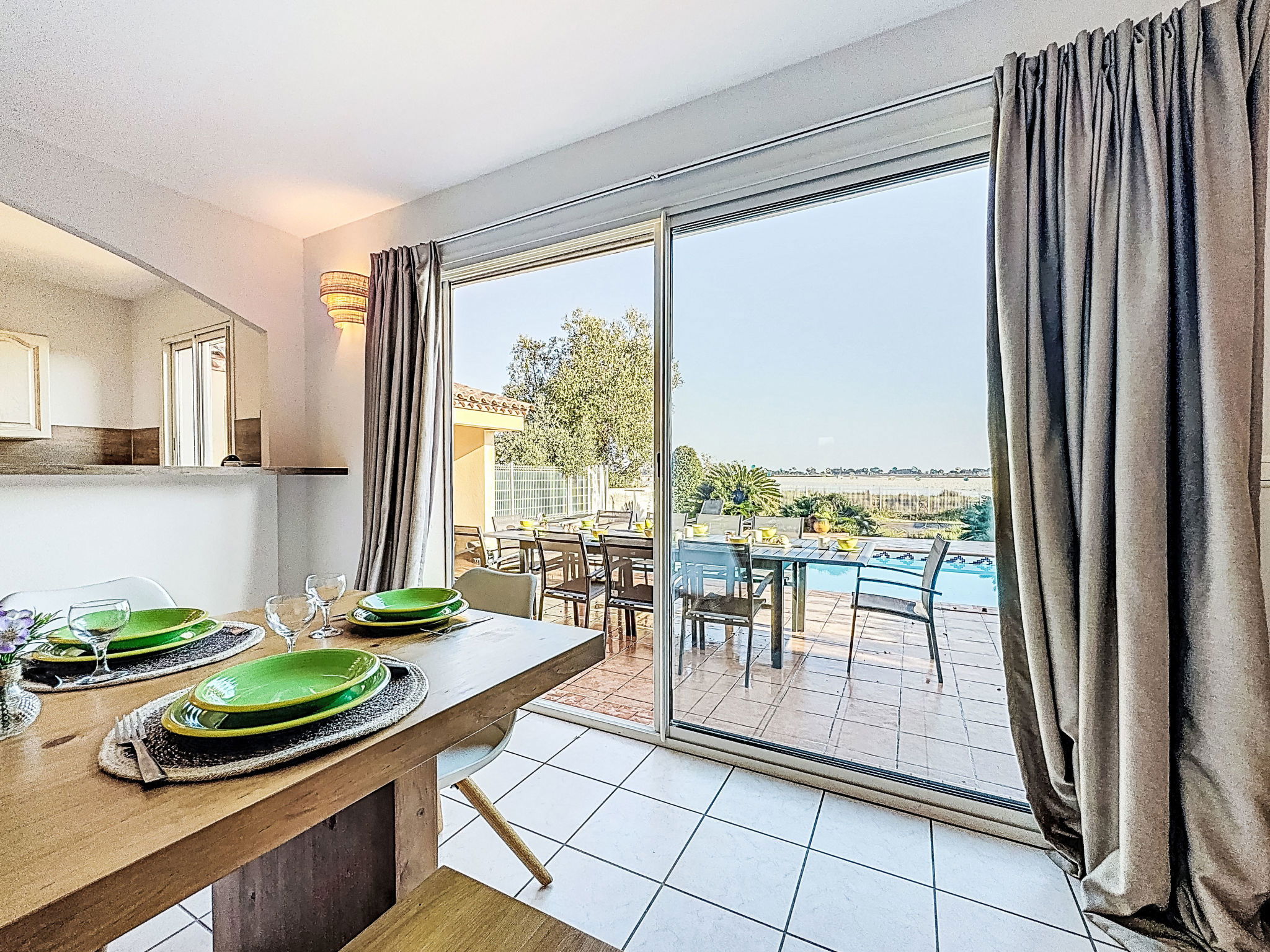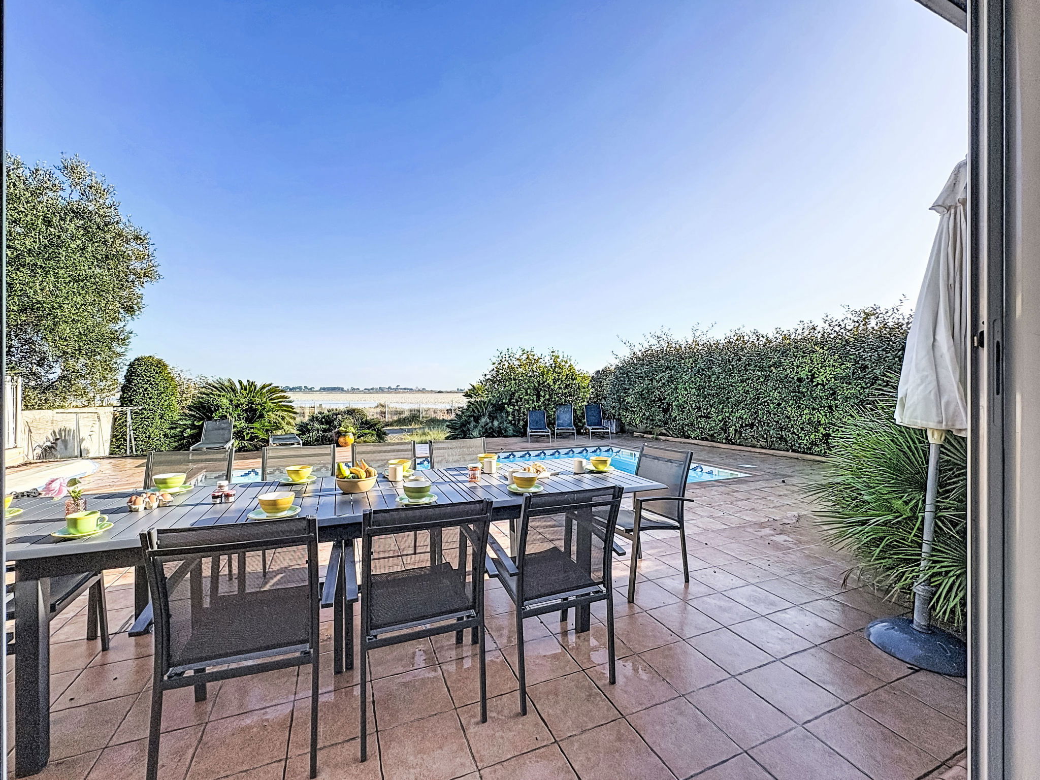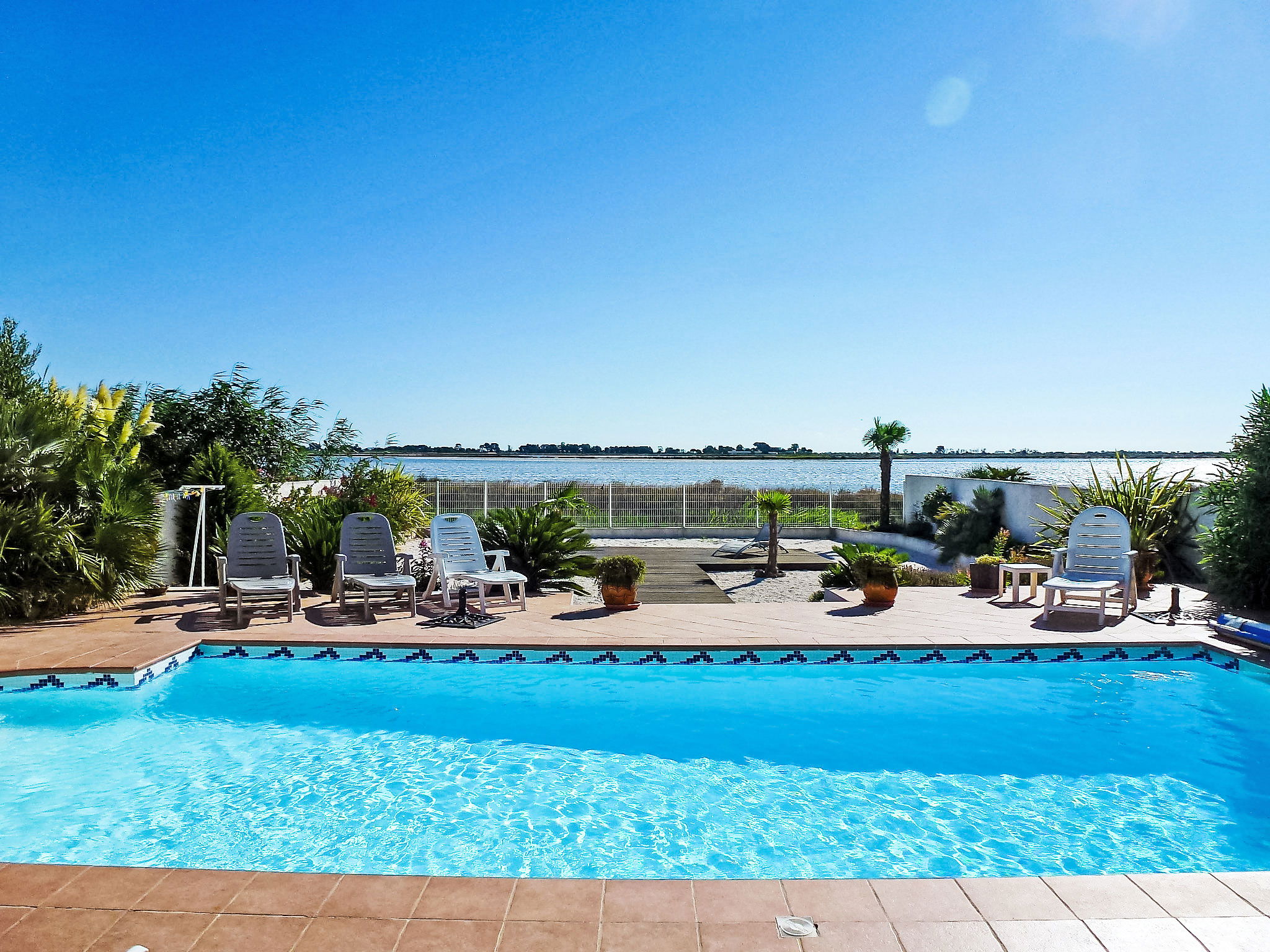 By the side of a small natural canal and the salt marshes. Comfortable villa "Orée des Salines". On the outskirts, in the residential district, 1.9 km from the sea. Private: property 550 m2 (fenced), swimming pool (8 x 4 m, depth 100 - 170 cm, seasonal availability: 15.May. - 15.Oct.) with internal staircase and salt-electrolysis pool-cleaning system. Outdoor shower, pool house with fridge, terrace (100 m2), barbecue. Shop 1 km, supermarket 1 km, bus stop "HLM" 1.2 km, railway station 2.4 km, sandy beach "Nord" 1.9 km, outdoor swimming pool 2 km, thermal baths "Thalazur Port Camargue" 4.7 km. Golf course (42 hole) 10 km, riding stable 1.4 km. Nearby attractions: Casino Flamingo 550 m, Seacquarium 1.9 km, Arènes Grau du Roi 3.1 km, Aigues Mortes 6 km, Grande Motte 12 km, Nîmes 49 km. Hiking paths: P13. Please note: the keys‘ handover takes place by the agency in Port Camargue, 2 km. Airfield 24 km from the property. . Landscape garden, 250 m2, below the house, access via 5 steps. Lovely view of the salt marshes and the Camargue.