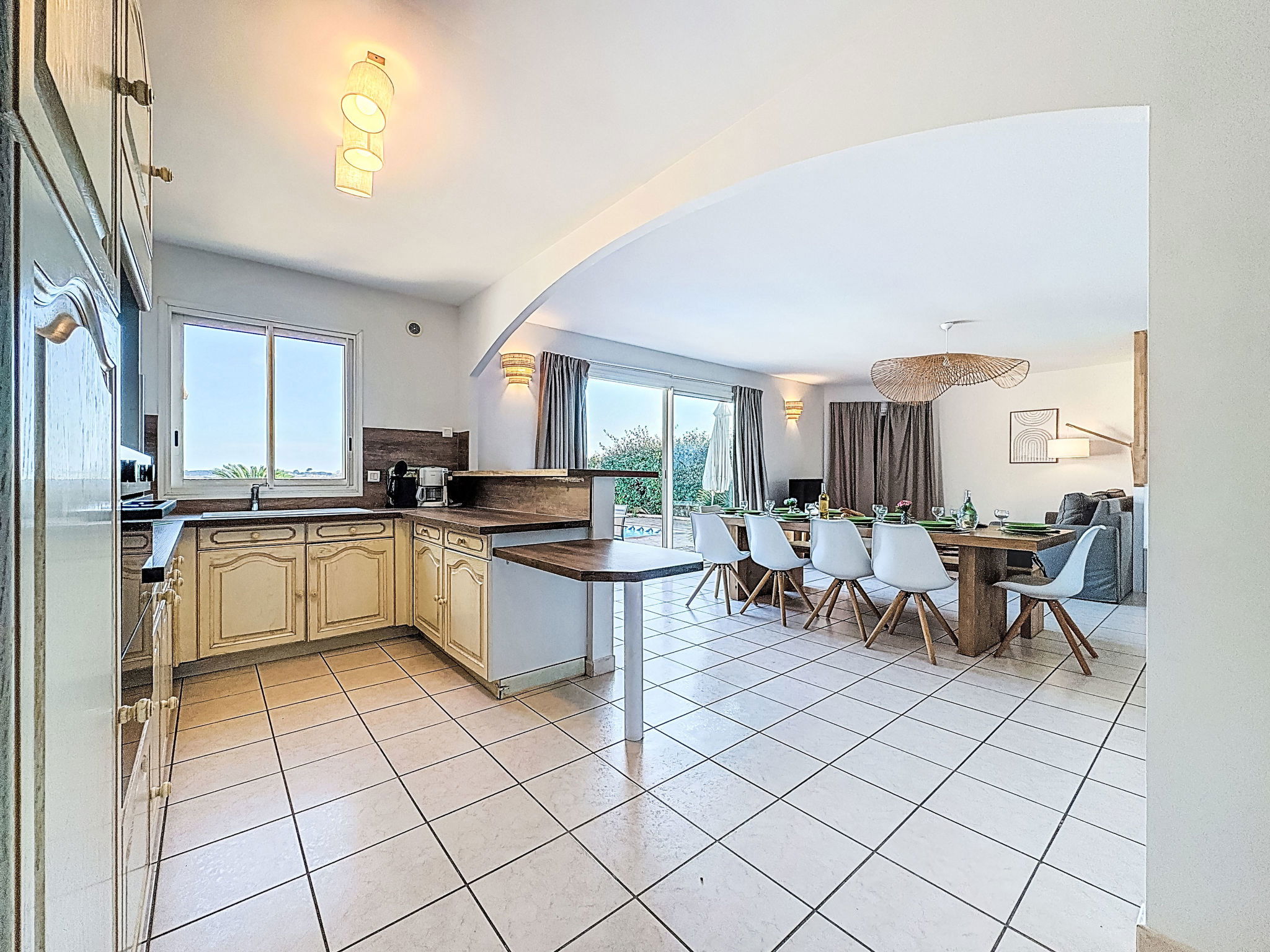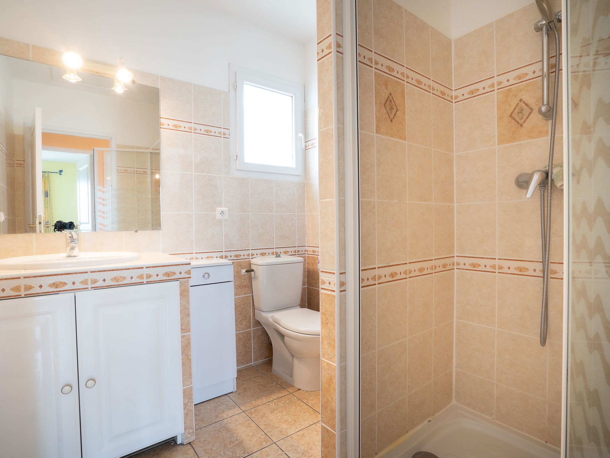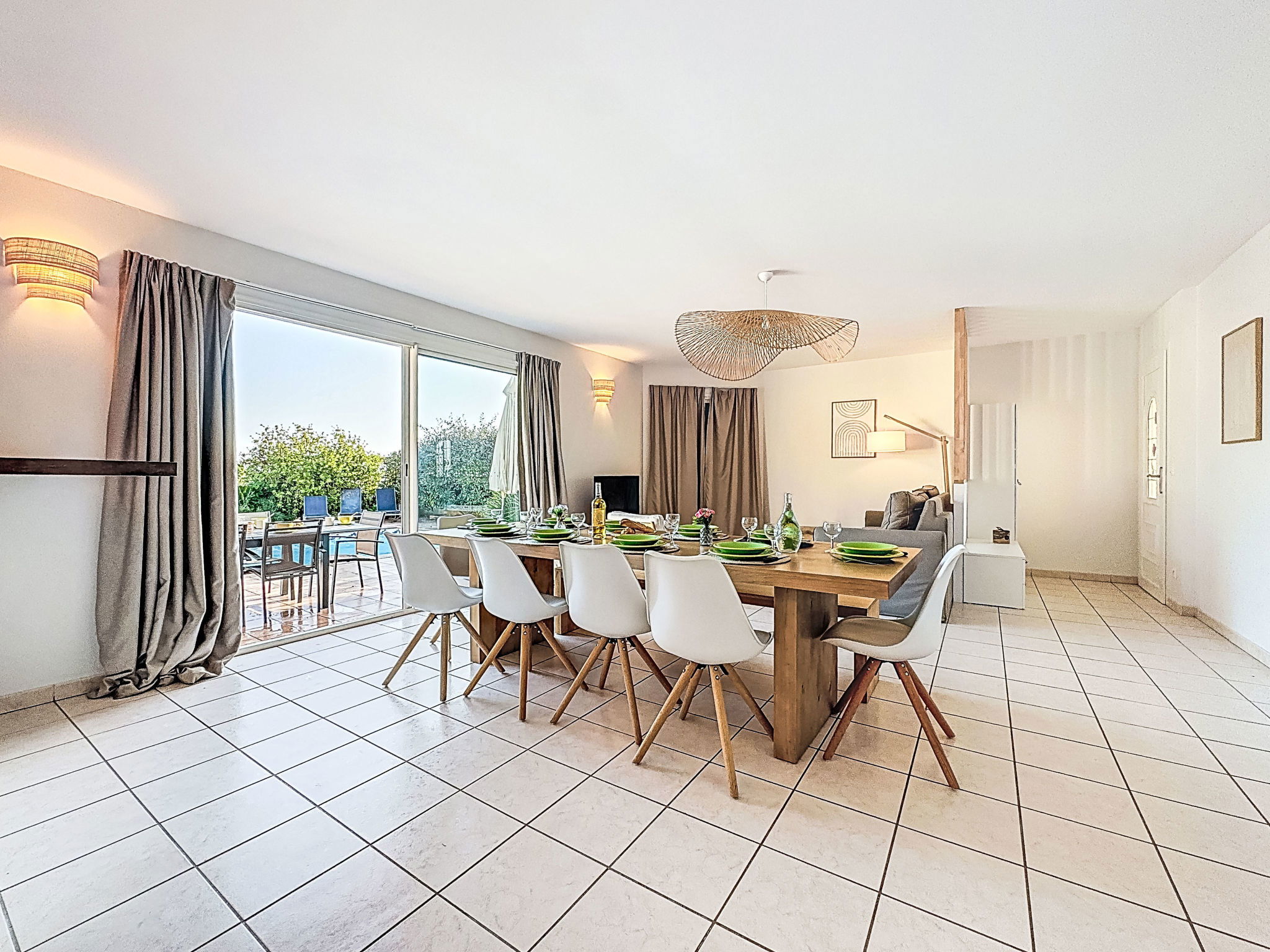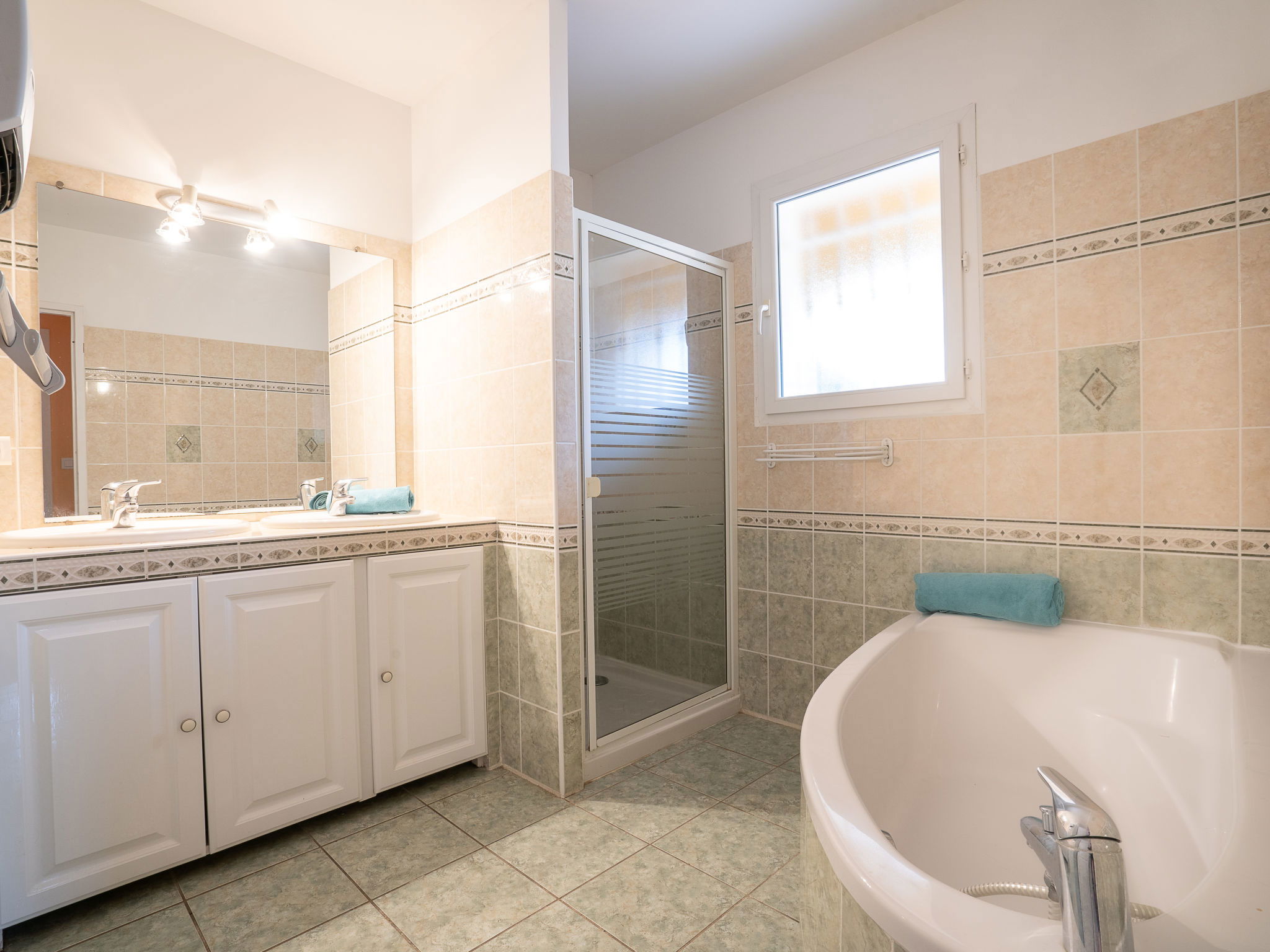 6-room villa 142 m2 on 2 levels. Beautiful furnishings: living/dining room 40 m2 with TV and DVD. 1 room with 1 french bed (160 cm, length 200 cm). 1 room with 2 beds (90 cm, length 190 cm). Open kitchen (4 hot plates, oven, dishwasher, microwave, freezer) with hatch. Bath/shower, sep. WC. Upper floor: 2 rooms, each room with 1 french bed (160 cm, length 200 cm). 1 room with 1 x 2 bunk beds (90 cm, length 190 cm). Shower/WC. Heating. Terrace 100 m2, south-east facing position. Terrace furniture, deck chairs (8). Beautiful view. Facilities: washing machine. Internet (WiFi, free). Parking, garage. Please note: maximum 1 pet/ dog allowed. Smoke alarm.