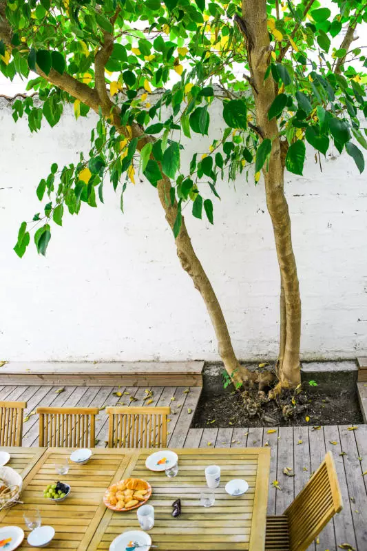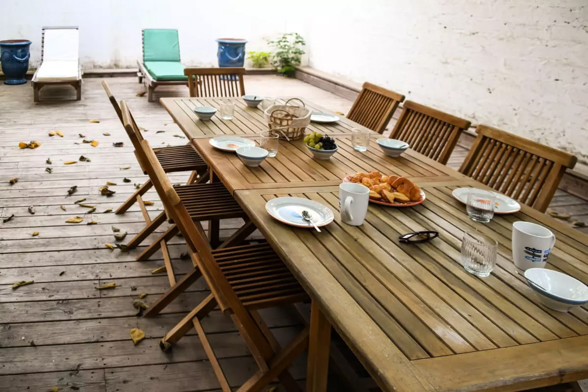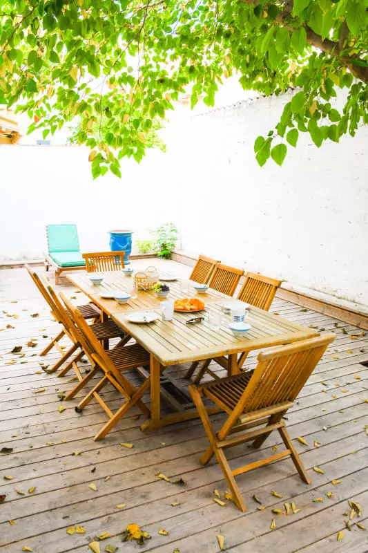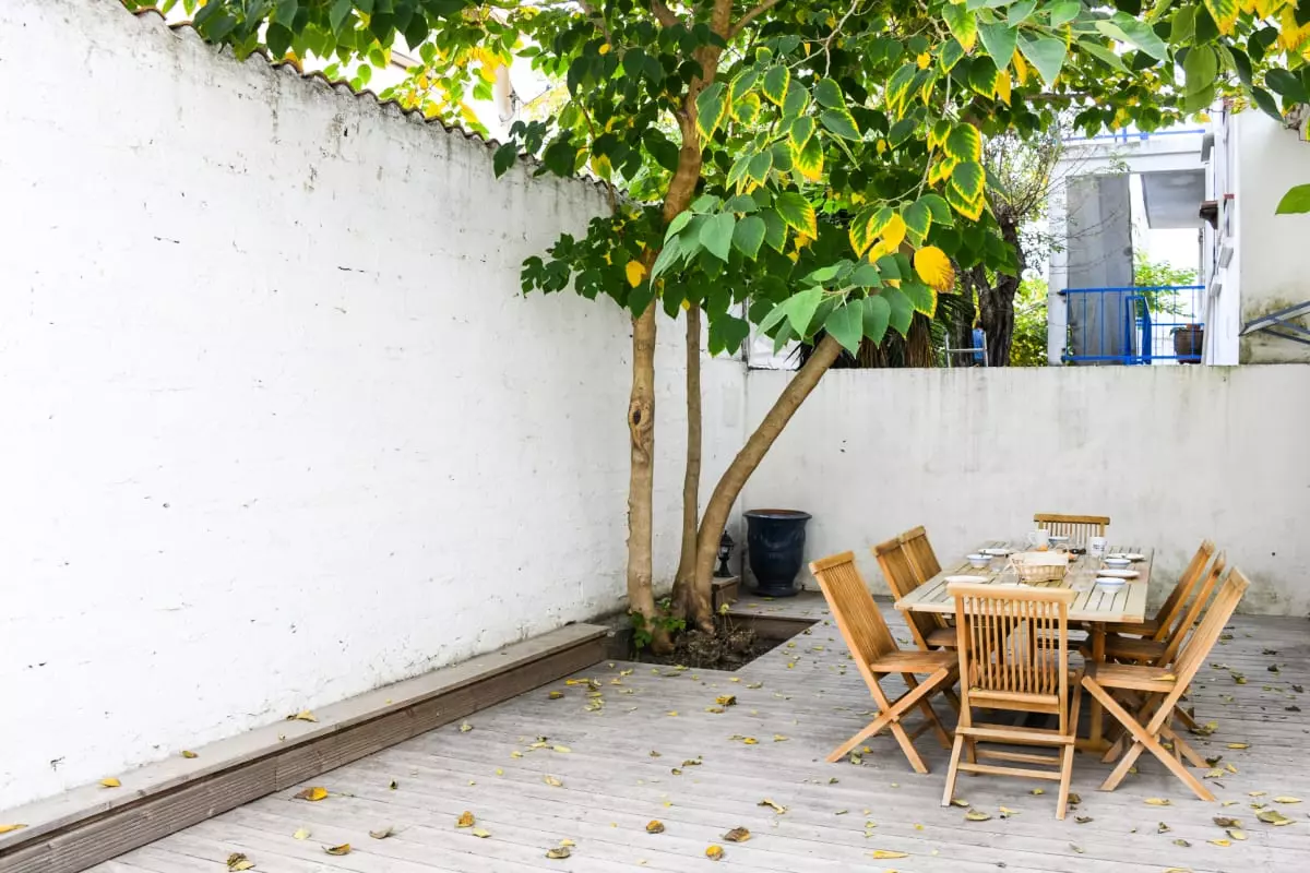 Main room side: The living room with large bay windows opens onto a terrace with a small garden furniture set.