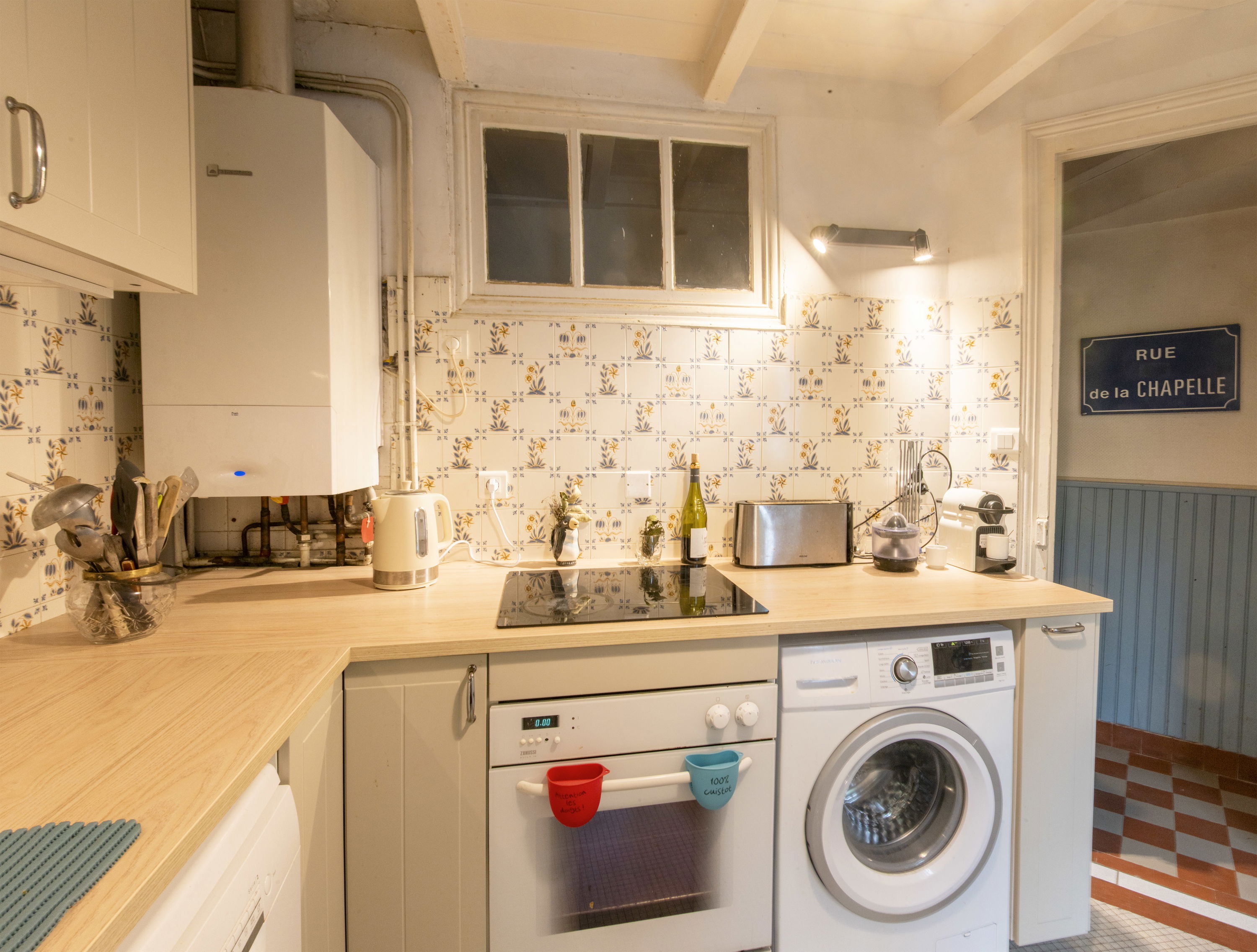 This rental includes: Living room with sofa, TV, Wifi, rectangular dining table with 6 chairs - Independent equipped kitchen (fridge, ceramic hob, oven, dishwasher, washing machine, microwave, filter coffee maker and espresso) opening onto a terrace-patio not overlooked facing south-west (garden furniture: deckchairs, Grill-plancha...) - Bedroom n°1 (bed 140/190 and wardrobe) with adjoining bathroom - WC