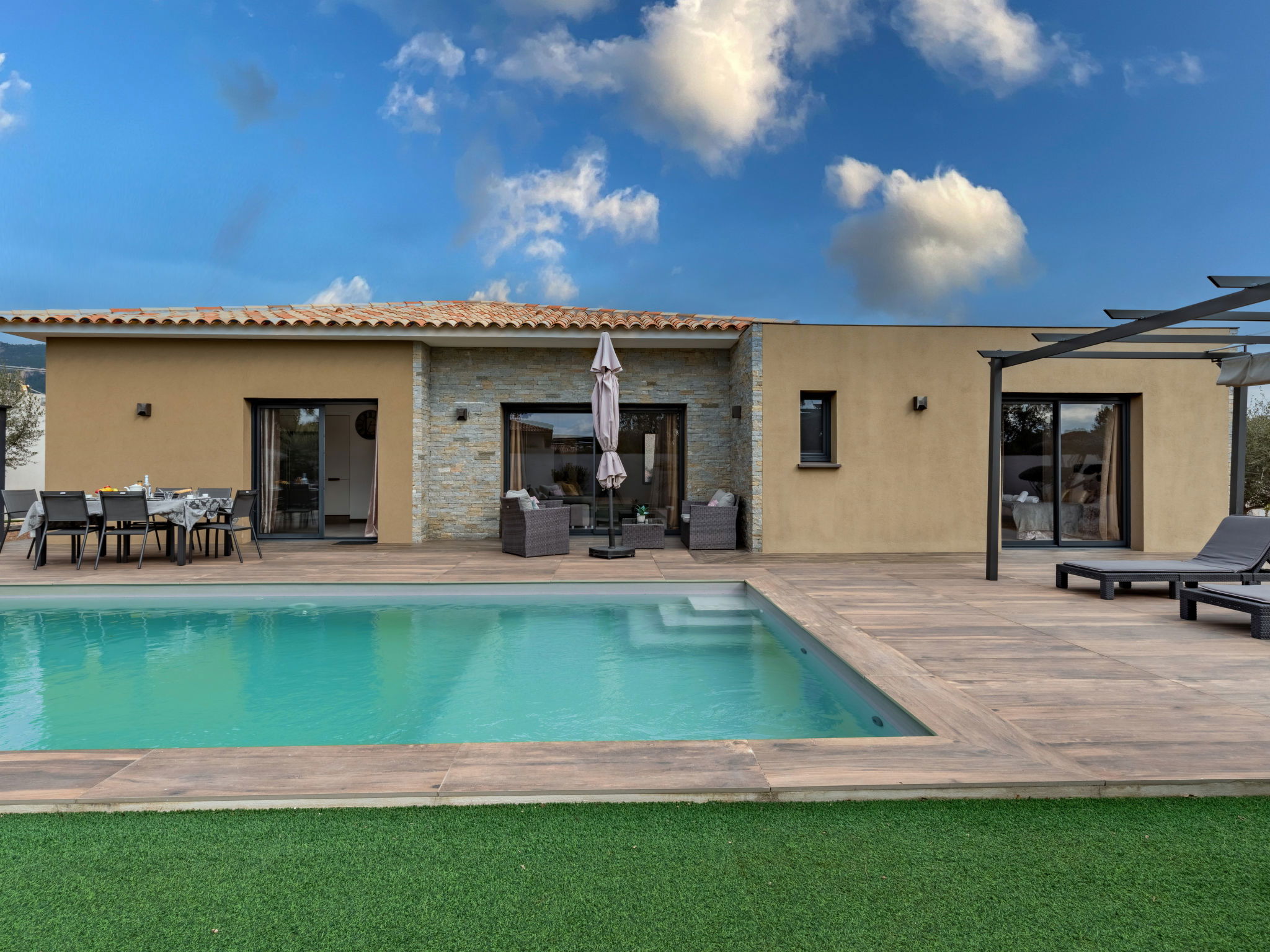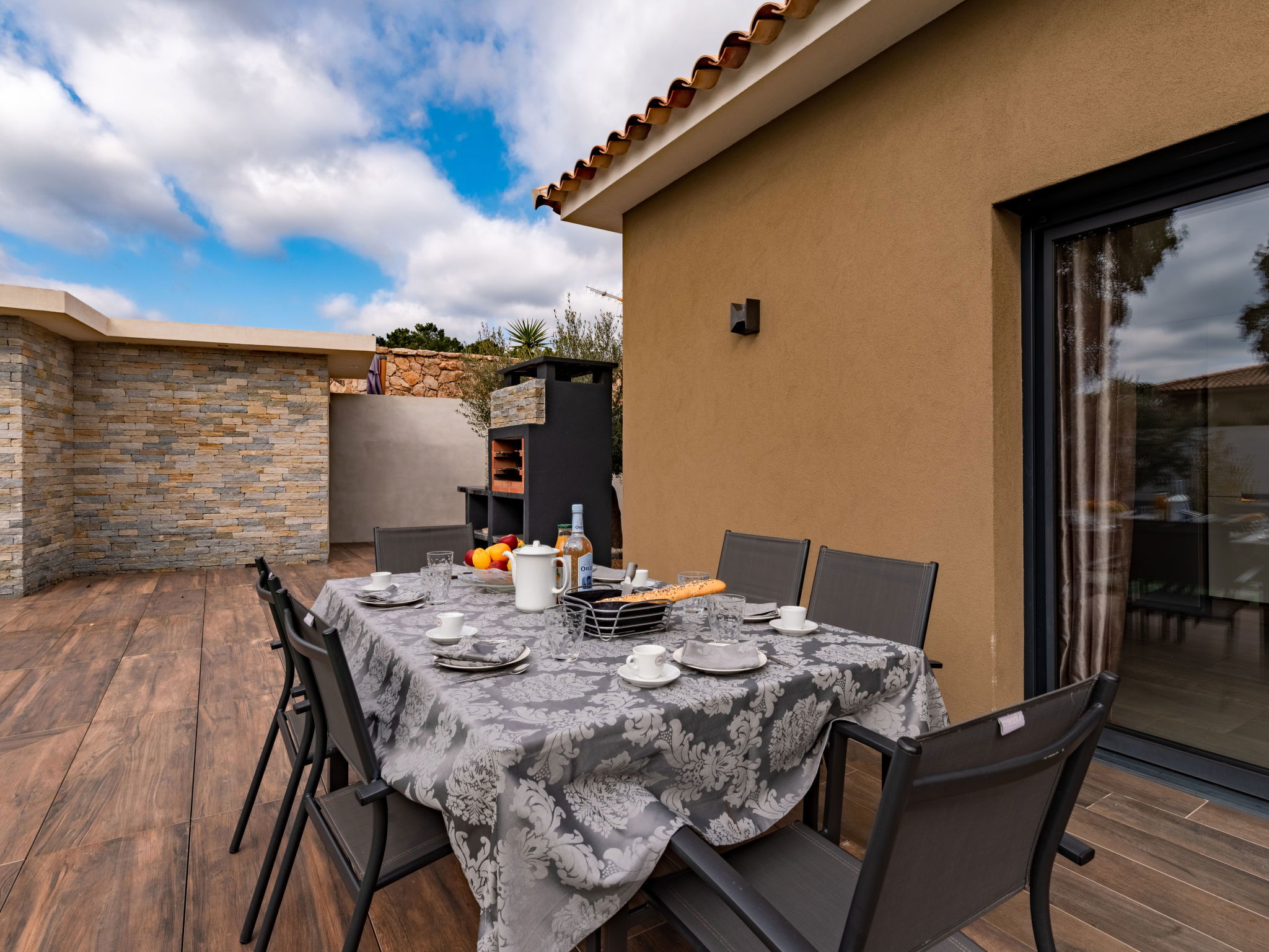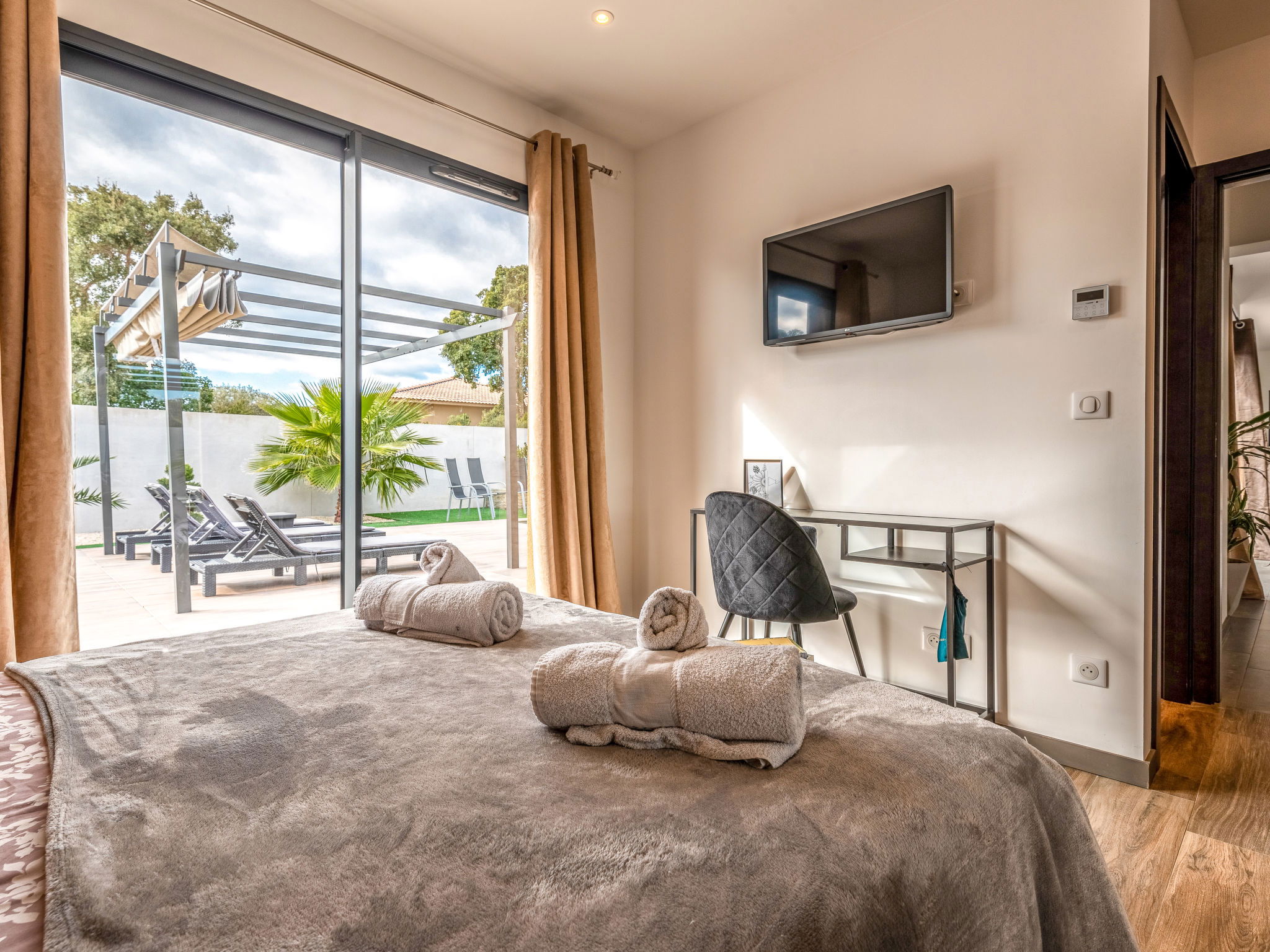 "Villa les lieges", 5-room villa 150 m2. Comfortable and modern furnishings: living/dining room with TV (flat screen), air conditioning. Exit to the terrace. 1 room with Dressing room with 1 french bed (160 cm, length 190 cm), shower/WC and TV (flat screen). 1 room with 1 french bed (140 cm, length 190 cm), shower/WC and TV (flat screen). 1 room with 1 french bed (140 cm, length 190 cm), shower/WC and TV (flat screen). 1 room with 1 french bed (160 cm, length 190 cm), bath/WC and TV (flat screen). Exit to the terrace. Open kitchen (oven, dishwasher, 1 induction hot plates, 3 gas rings, toaster, kettle, microwave, electric coffee machine) with dining table. Exit to the terrace. Sep. WC. Electric heating, air-conditioning. Large terrace 100 m2. Terrace furniture, barbecue, deck chairs (4). Facilities: washing machine. Internet (WiFi, free). Reserved parking (3 cars). Please note: non-smokers only. Smoke alarm. Offer by a private individual according to Art. 155, IV of CGI.