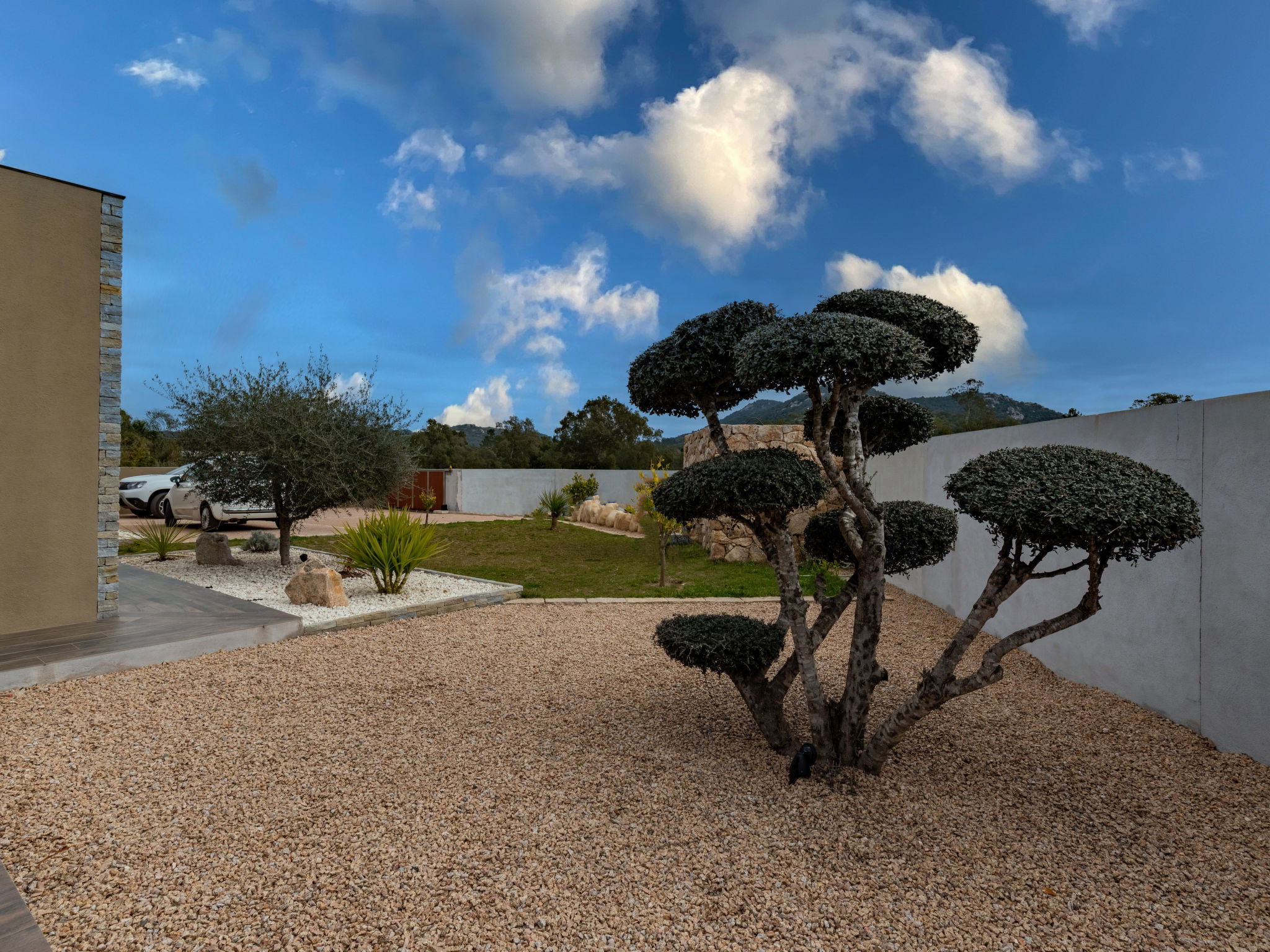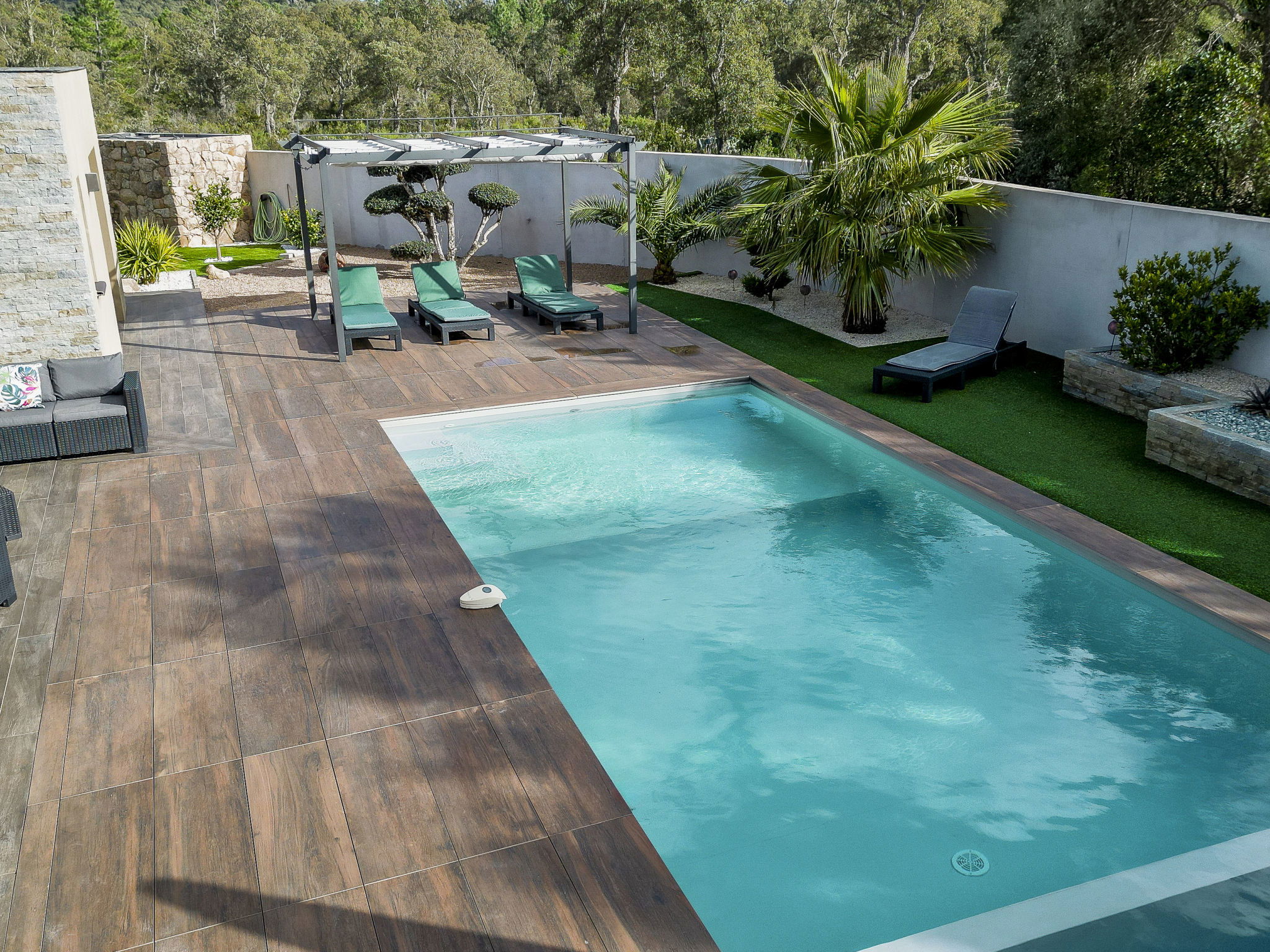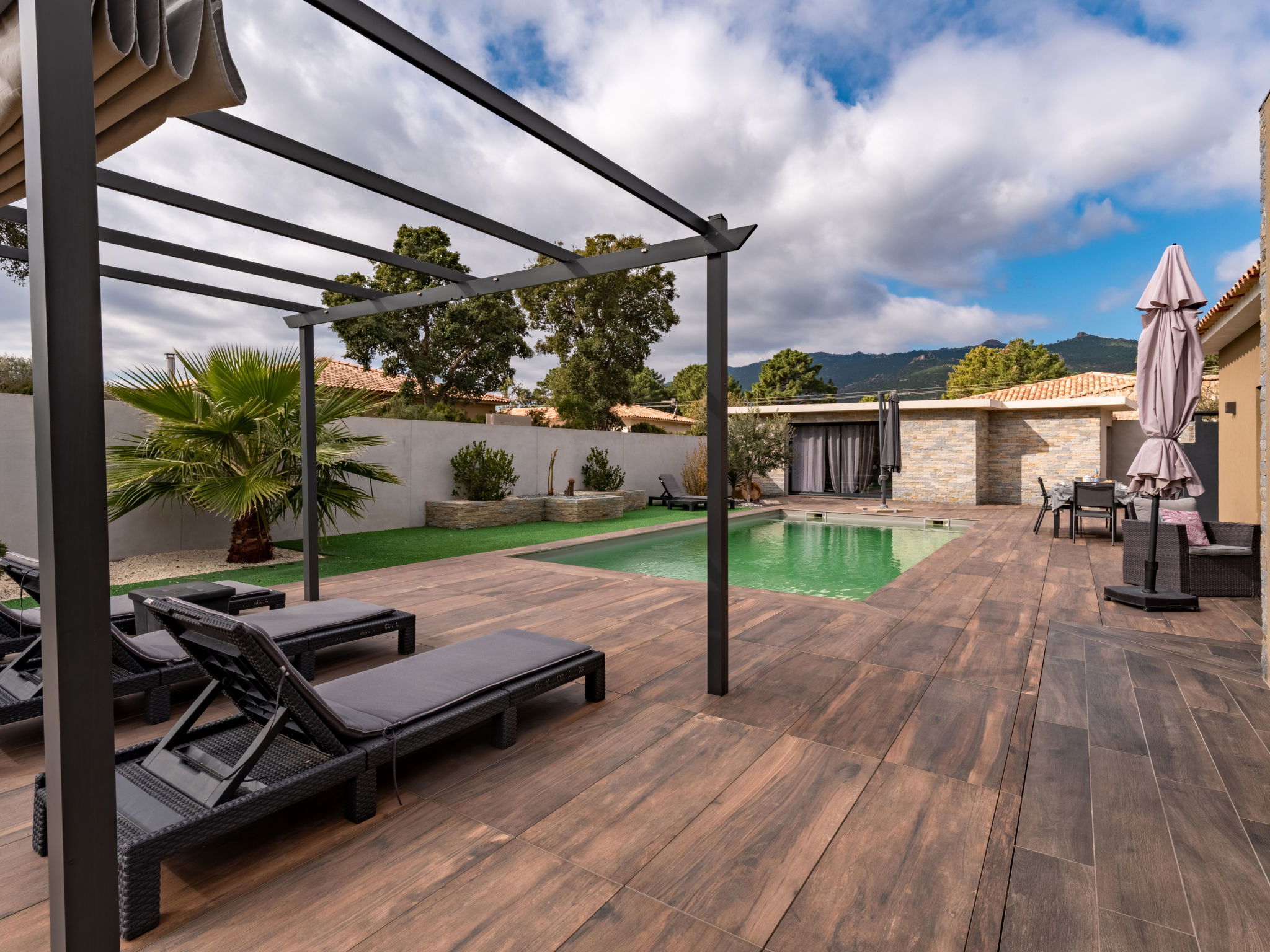 Single-family house. On the outskirts, 1 km from the centre of Lecci, in the residential district, 5 km from the beach, in a cul-de-sac. Private: property 800 m2 (fenced), well-kept garden, swimming pool angular (7 x 4 m, depth 100 - 200 cm, seasonal availability: 01.Jul. - 15.Sep.) with salt-electrolysis pool-cleaning system. In the house: air conditioning. Grocery 400 m, supermarket 4 km, restaurant 4 km, sandy beach "plage de Saint Cyprien" 5 km. Nearby attractions: Centre ville Porto-Vecchio 10 km, Plage de Santa Giulia 18 km, Plage de Palombaggia 20 km, Bonifacio 36 km. Well-known lakes can easily be reached: Lac de l'Ospédale 24 km. Hiking paths: Aiguilles de Bavella 51 km. Please note: car recommended.