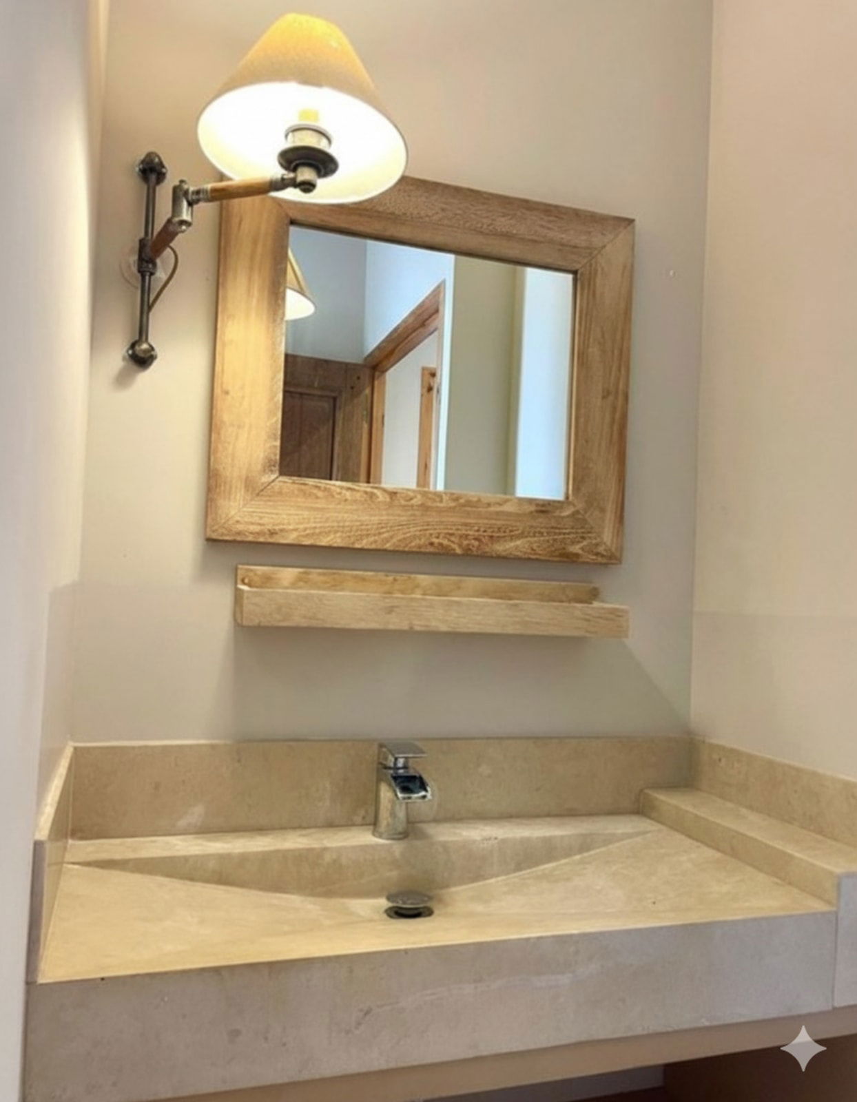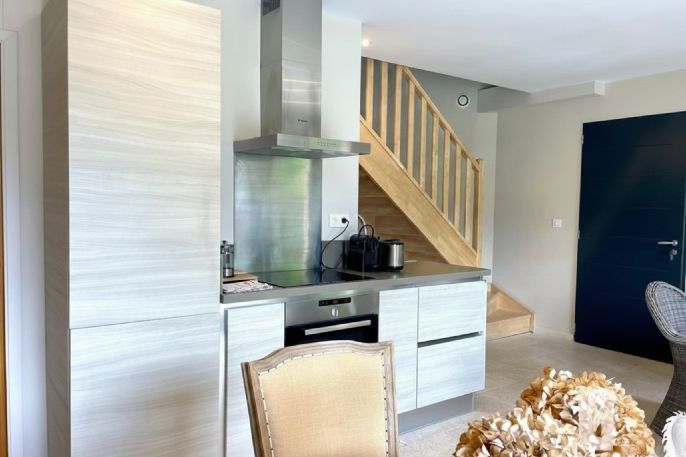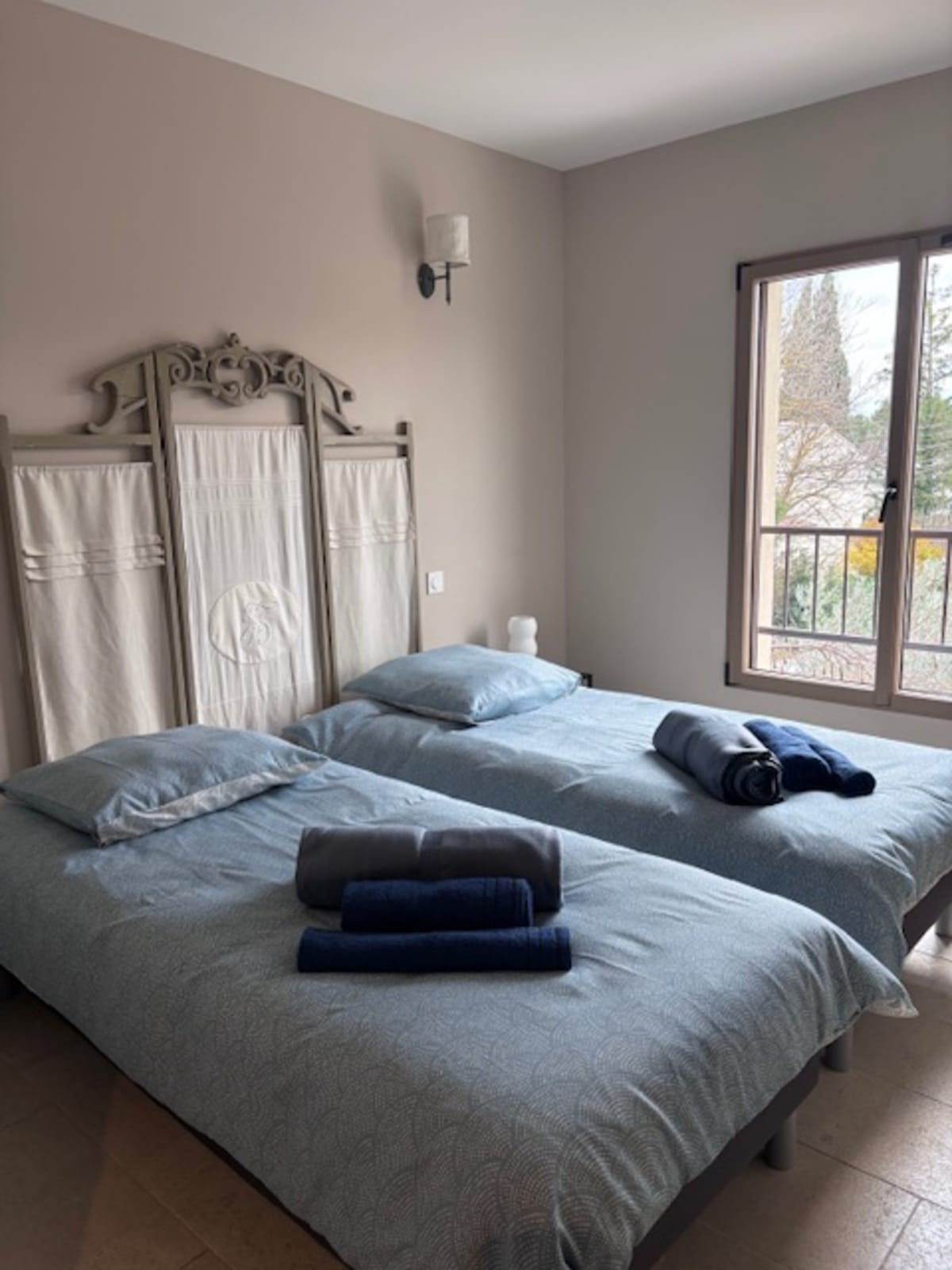 Upstairs, two elegant bedrooms provide a soft and restful atmosphere: one with a double bed and the other with two single beds, both offering convenient storage.