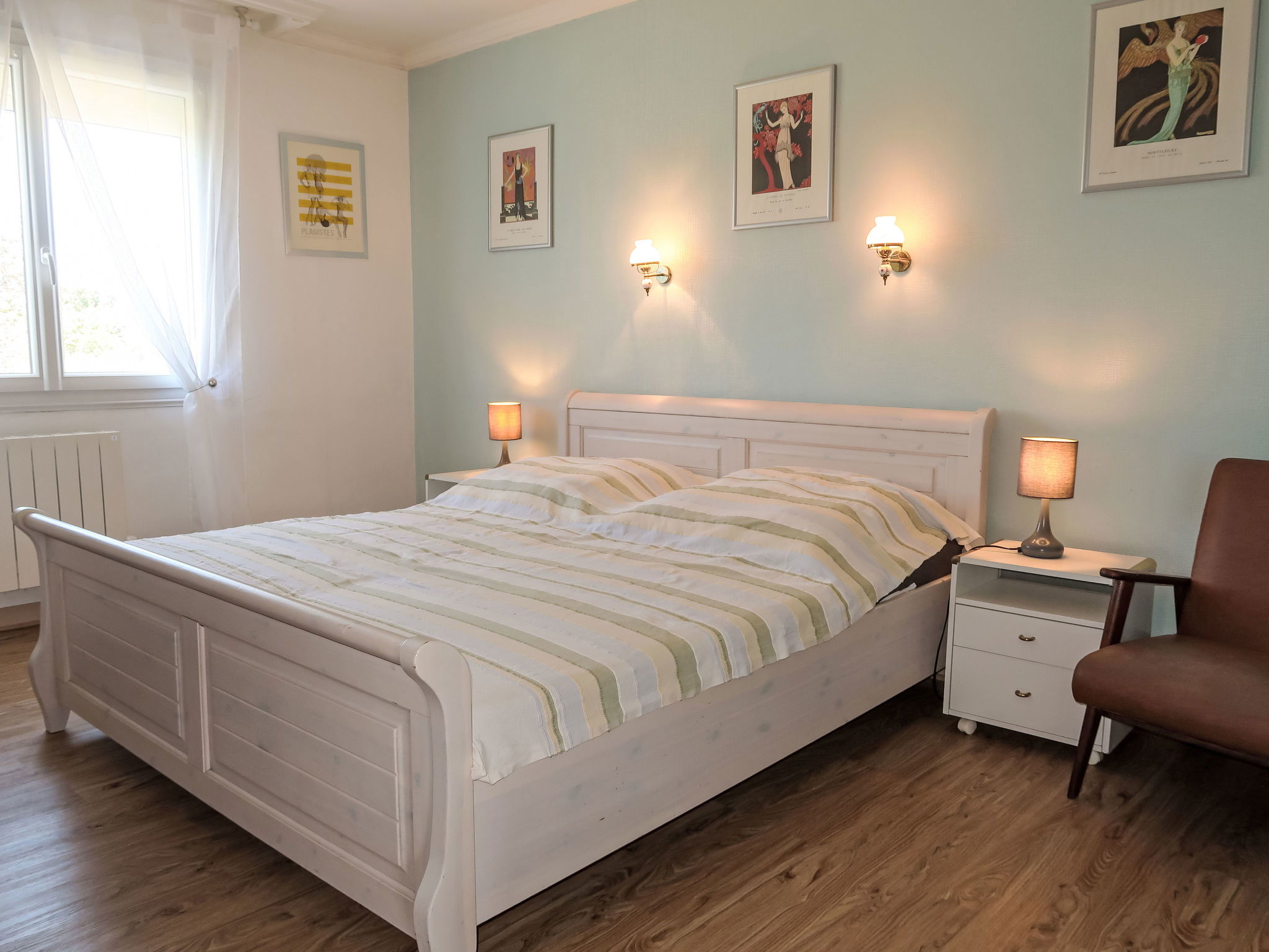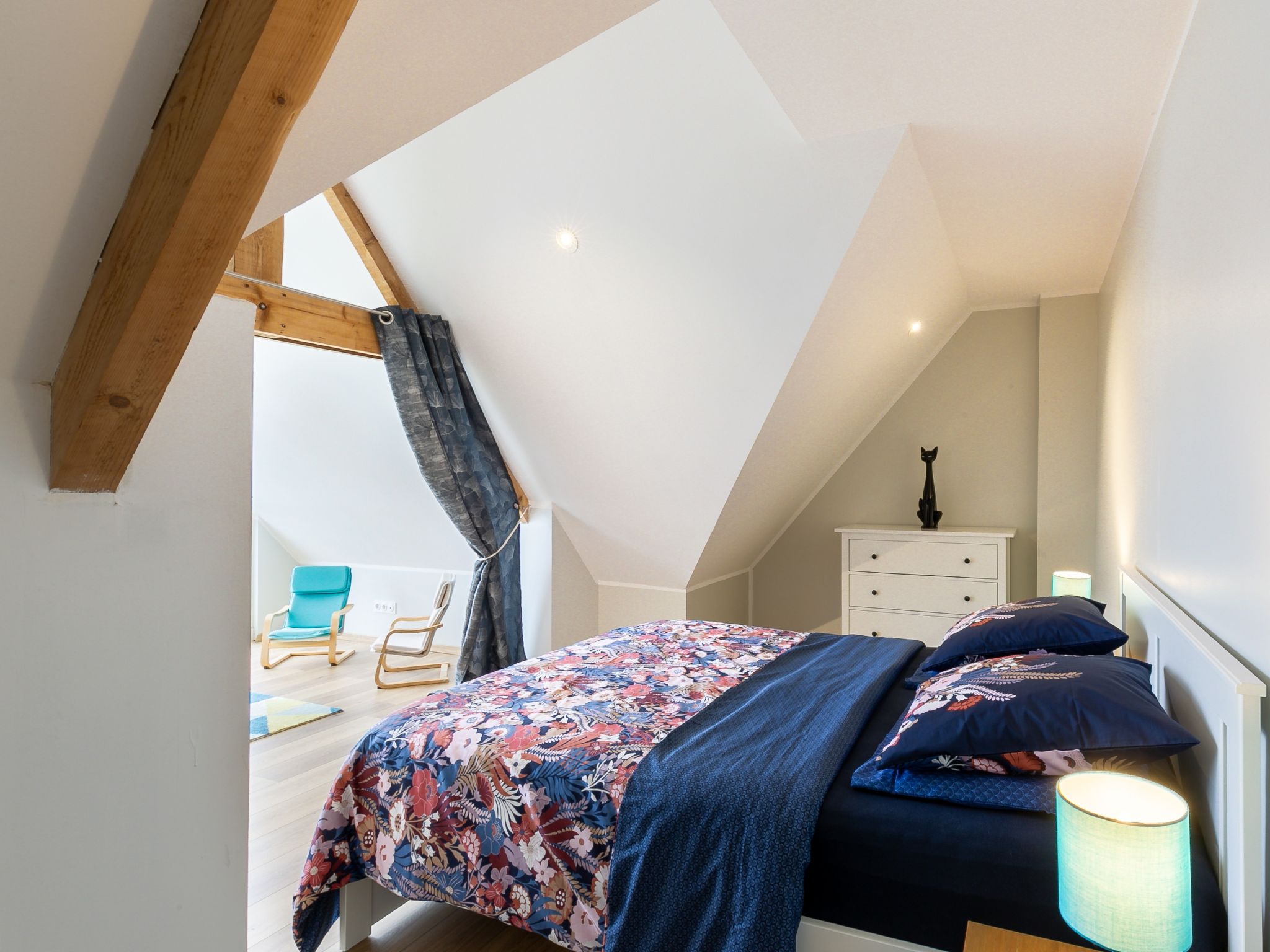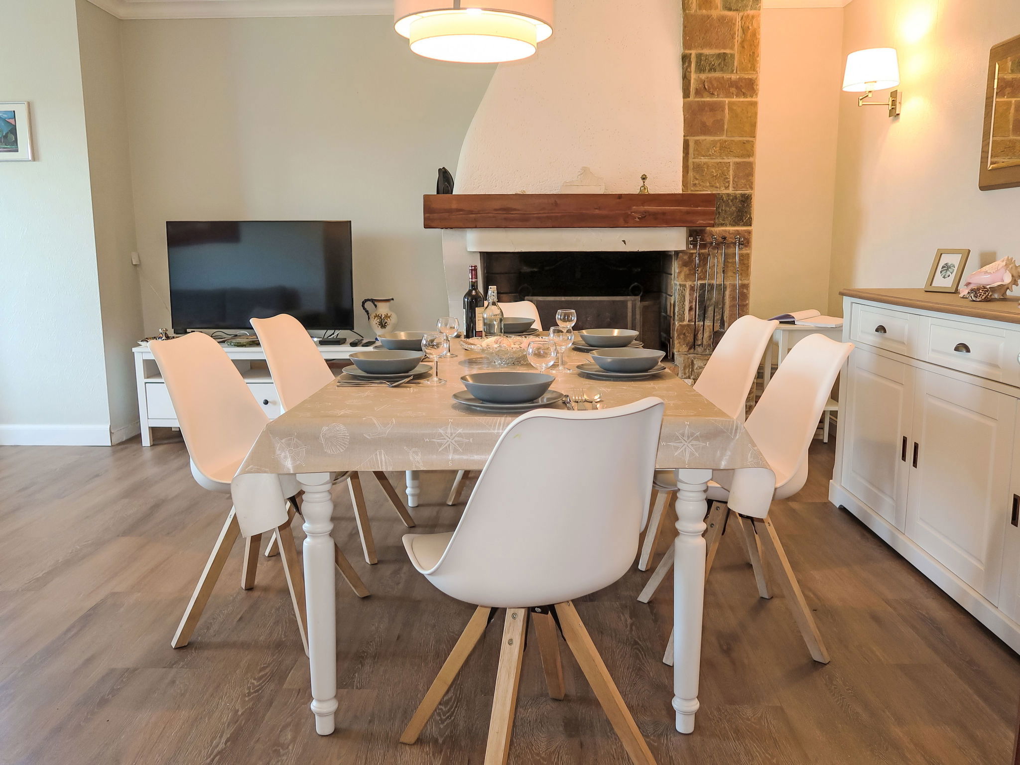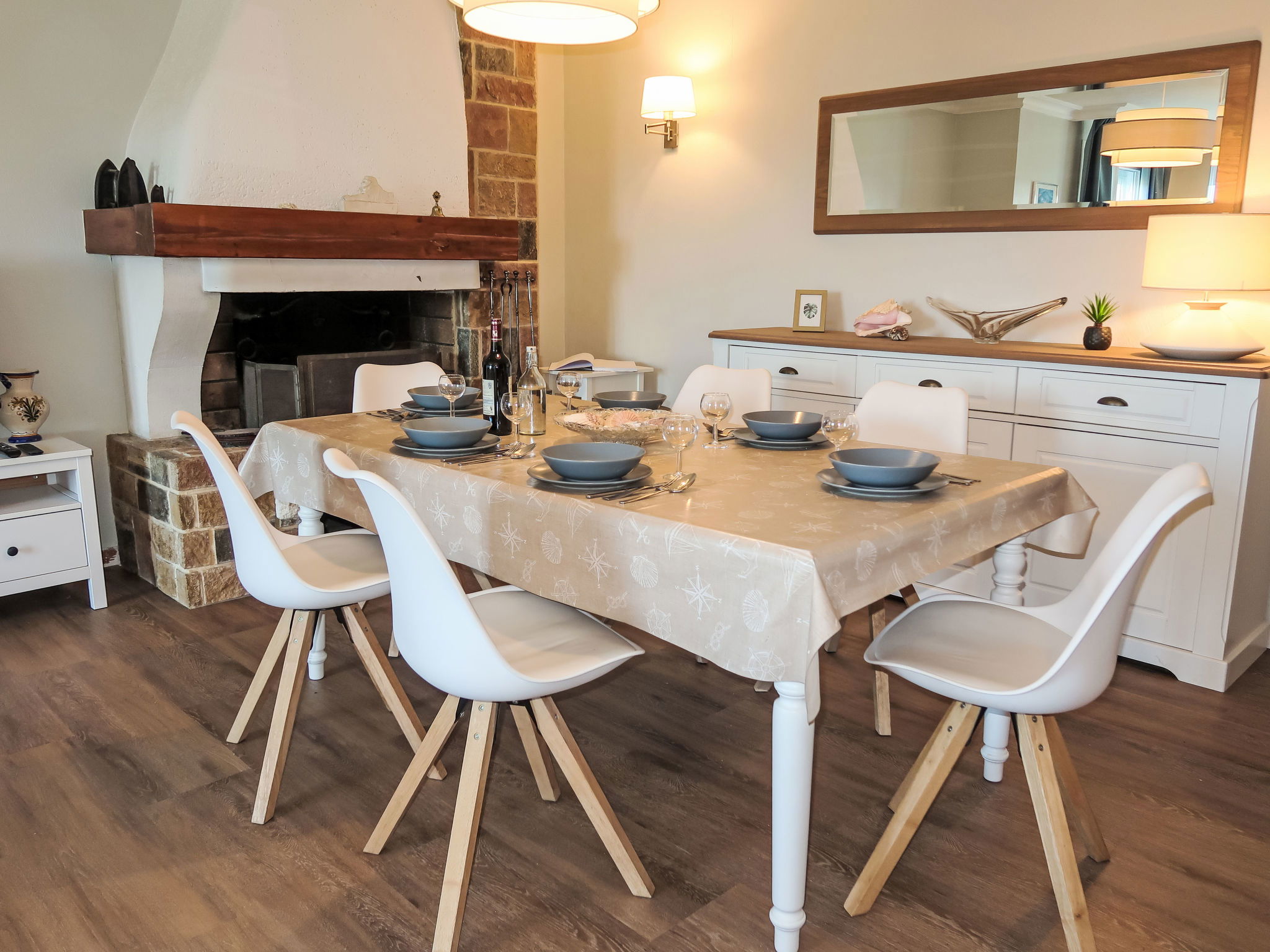"Reve de Mer", 4-room house 140 m2 on 2 levels. Bright, tasteful furnishings: living/dining room with open-hearth fireplace, dining table and satellite TV. 1 room with 2 beds. Kitchen (oven, dishwasher, 3 ceramic glass hob hotplates, toaster, kettle, microwave, electric coffee machine) with small dining table. Shower, sep. WC. Upper floor: 1 large room with sloping ceilings with panoramic window with 1 french bed (160 cm, length 200 cm). 1 room with sloping ceilings with 1 french bed (140 cm, length 190 cm). Bath/WC. Electric heating. Parquet floors. Terrace, south-west facing position. Terrace furniture, barbecue (portable), deck chairs (2). Facilities: washing machine, children's high chair, baby cot. Internet (WiFi, free). Please note: non-smoking house. Maximum 1 pet/ dog allowed. Smoke alarm.