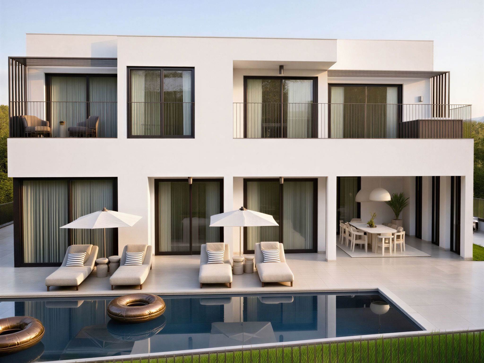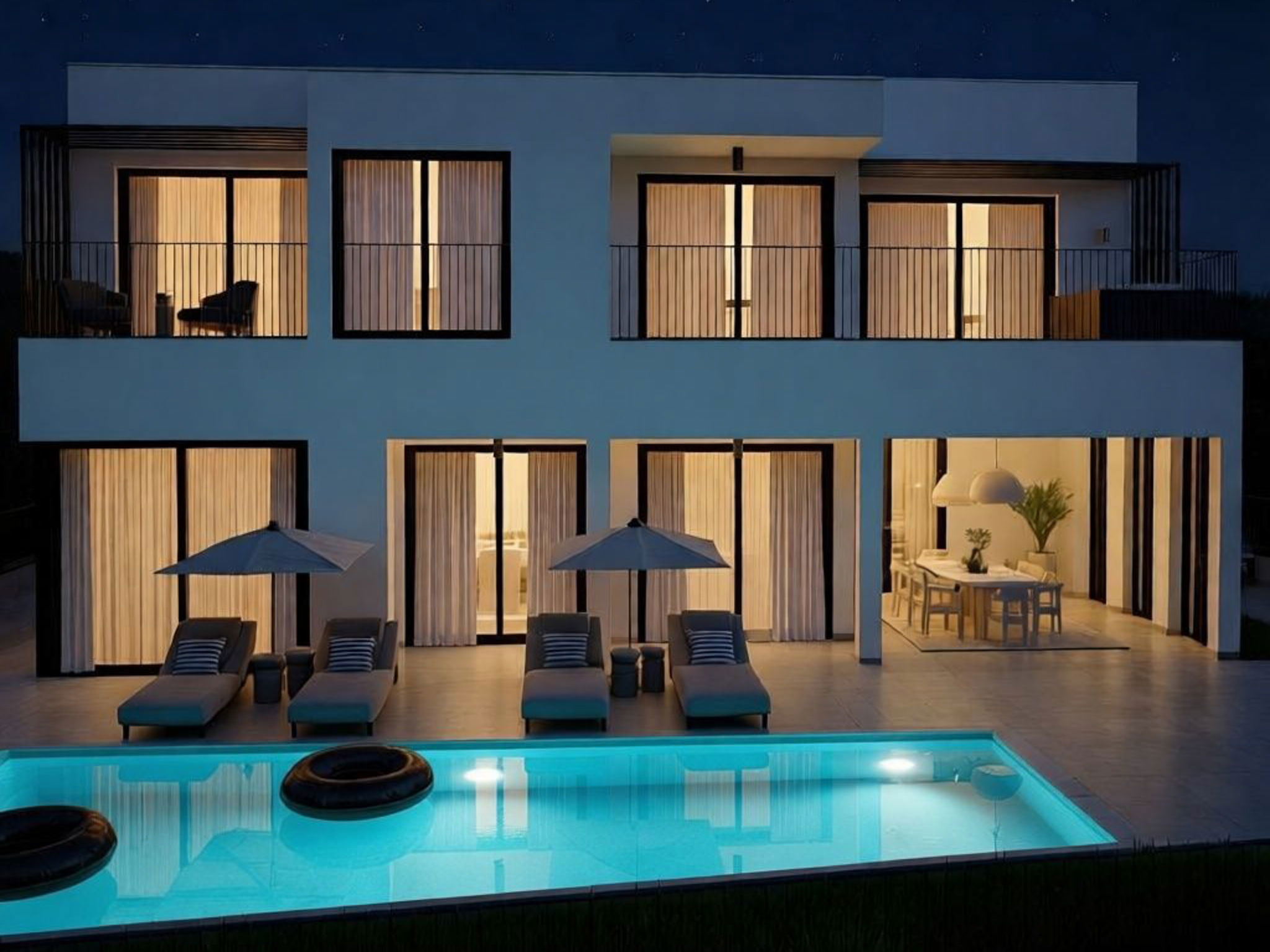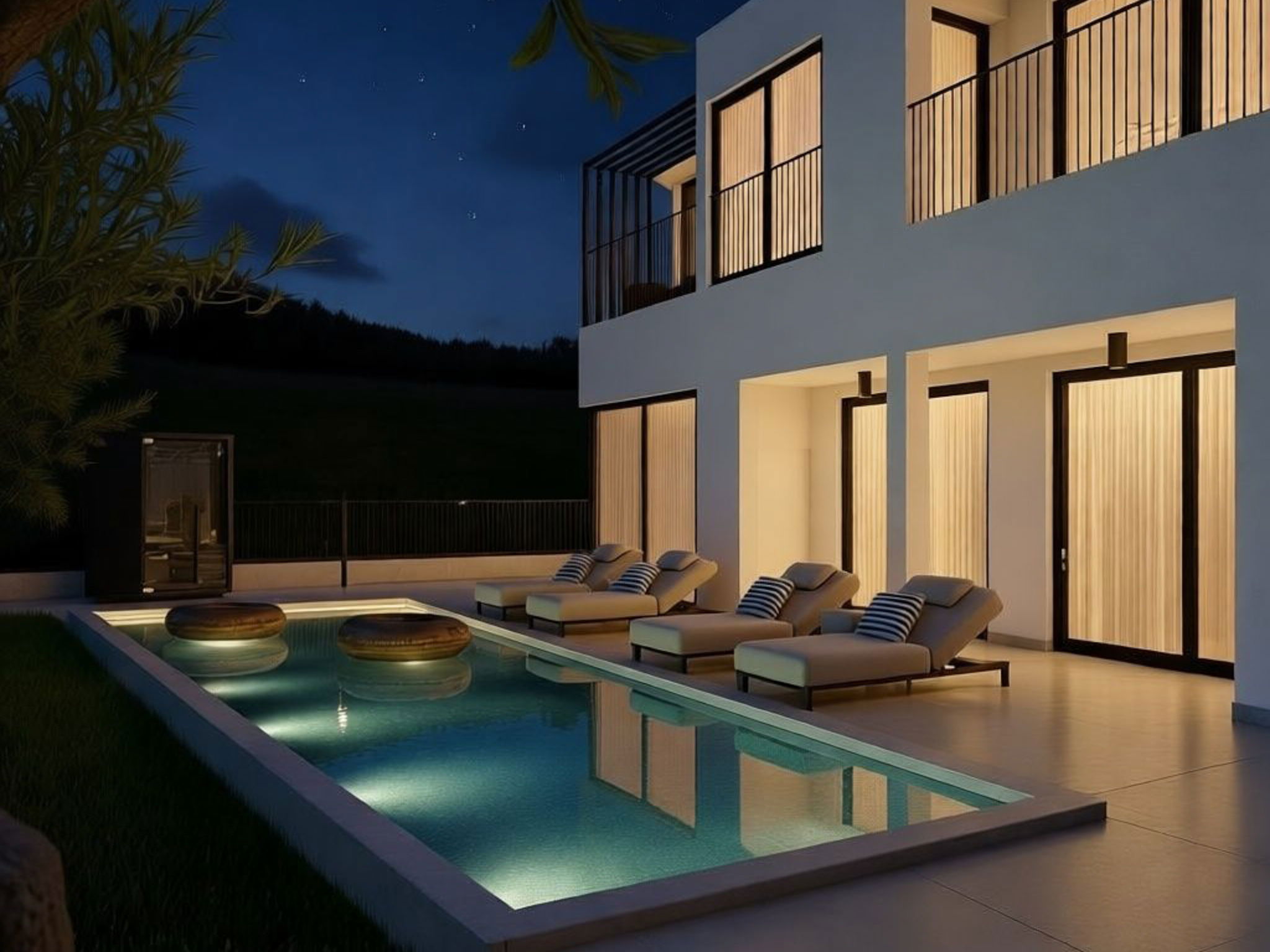 Modern villa "Loparia", 2 storeys, built in 2026. 700 m from the centre of Lopar, 13 km from the centre of Rab, 750 m from the sea, 750 m from the beach. Private: property 585 m2 with lawn 50 m2 flowers, swimming pool heated (10 x 3 m, depth 145 cm, seasonal availability: 01.Apr. - 15.Oct.) with internal staircase and salt-electrolysis pool-cleaning system. Unconventional pool shape. WC in the pool area, outdoor shower, hot tub, barbecue, children's playground (slide, swing), pool maintenance by the owner/gardener. In the house: internet access, sauna, washing machine, tumble dryer. Cook on request (extra). Parking (for 5 cars) at the house on the premises. E-charging station. Shop 700 m, supermarket 750 m, restaurant, bus stop 700 m, ferry 900 m, sandy beach 750 m. Please note: suitable for families. Private mooring (extra) on request. Swimming pool heated (extra).