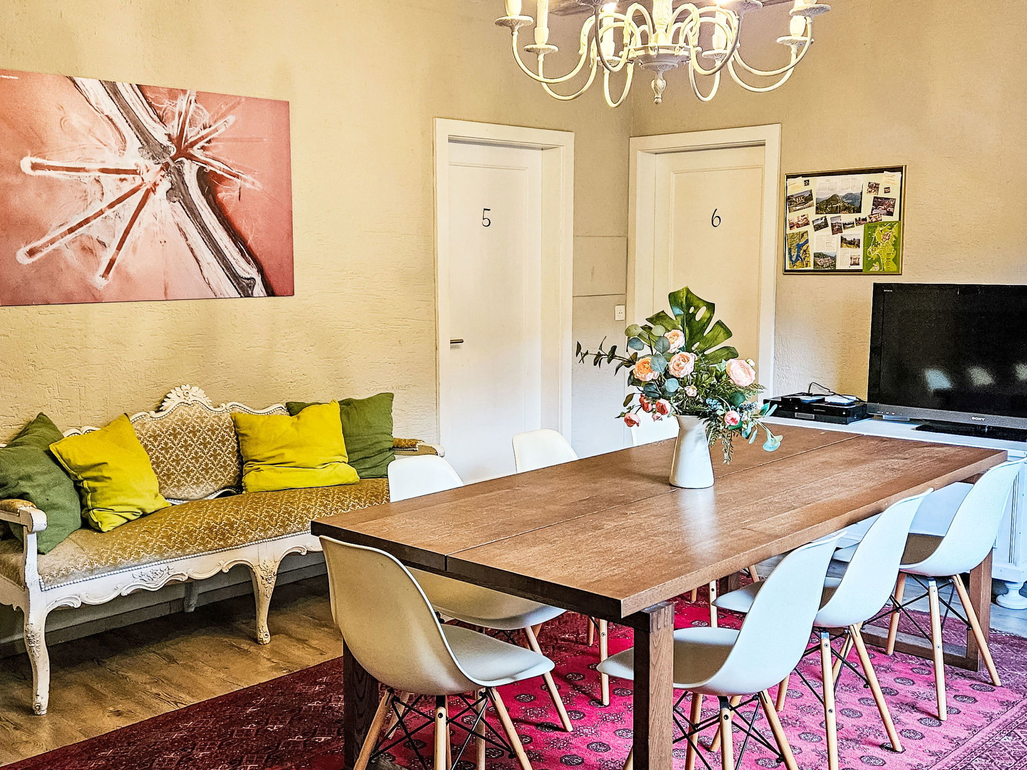 Calina is a cozy retreat with the charm of a guest house and the flexibility of a holiday home. Set in a peaceful location, it offers spectacular views of Lake Lugano and Monte San Salvatore, surrounded by a spacious Mediterranean garden. In summer, cool off in the large garden pool and soak up the beauty of the Swiss countryside. Large, beautiful house "Calina", built in 1965, renovated in 2024, surrounded by trees. On the outskirts, 25 km from the lake, in a cul-de-sac. For shared use: table tennis, terrace (200 m2), garden furniture, barbecue. Private: property 600 m2, beautiful, well-kept garden, swimming pool (above ground) round (4 m diameter, depth 120 cm, seasonal availability: 01.Jun. and 01.Sep.). Barbecue, children's playground. In the house: central heating system. Parking (for 5 cars) at the house, public parking on the road. Bus stop 800 m.