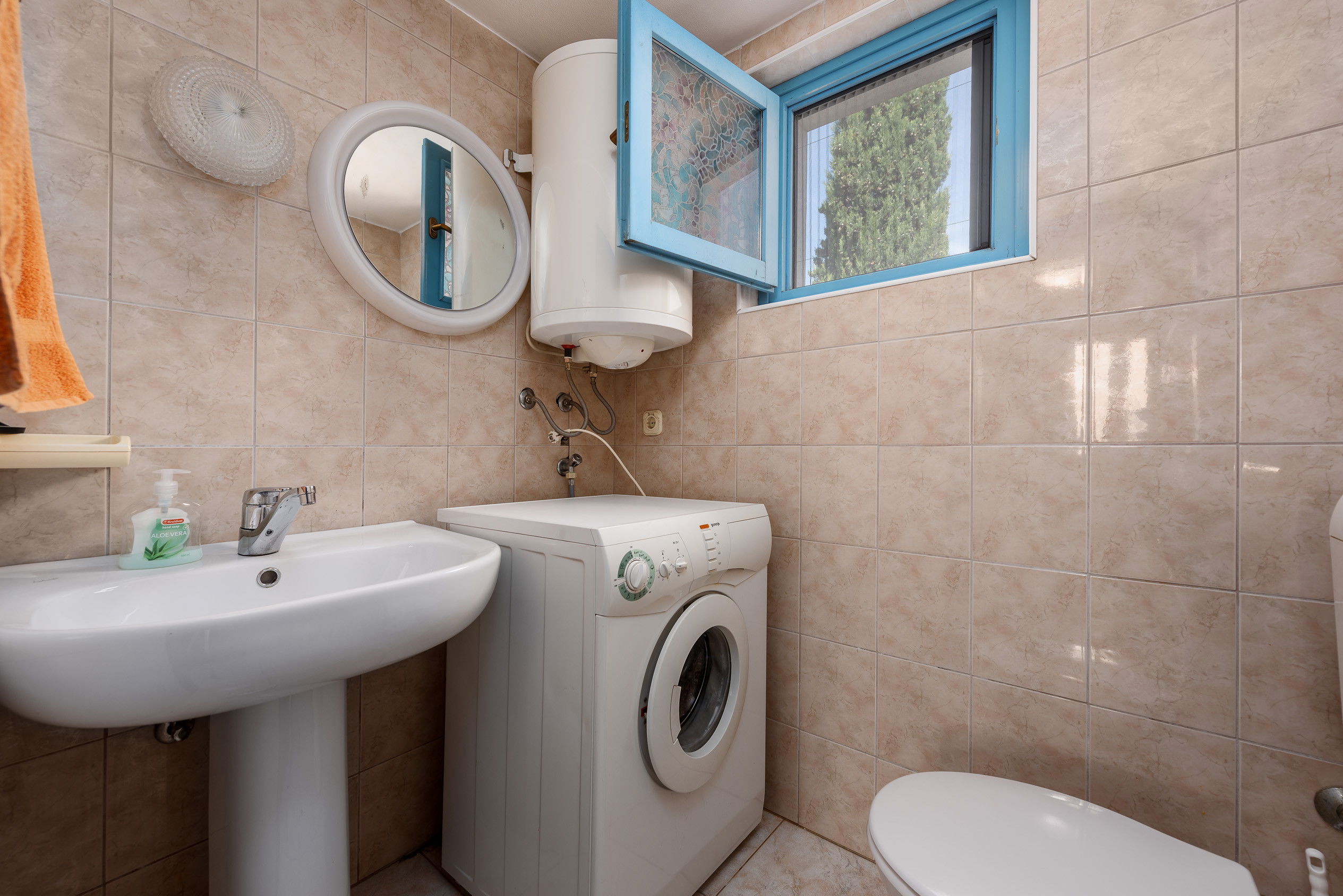 The house consists of a living and dining area, kitchen and small toilet with washing machine downstairs and twe bedrooms, one large with double bed and the other, smaller with twin beds.