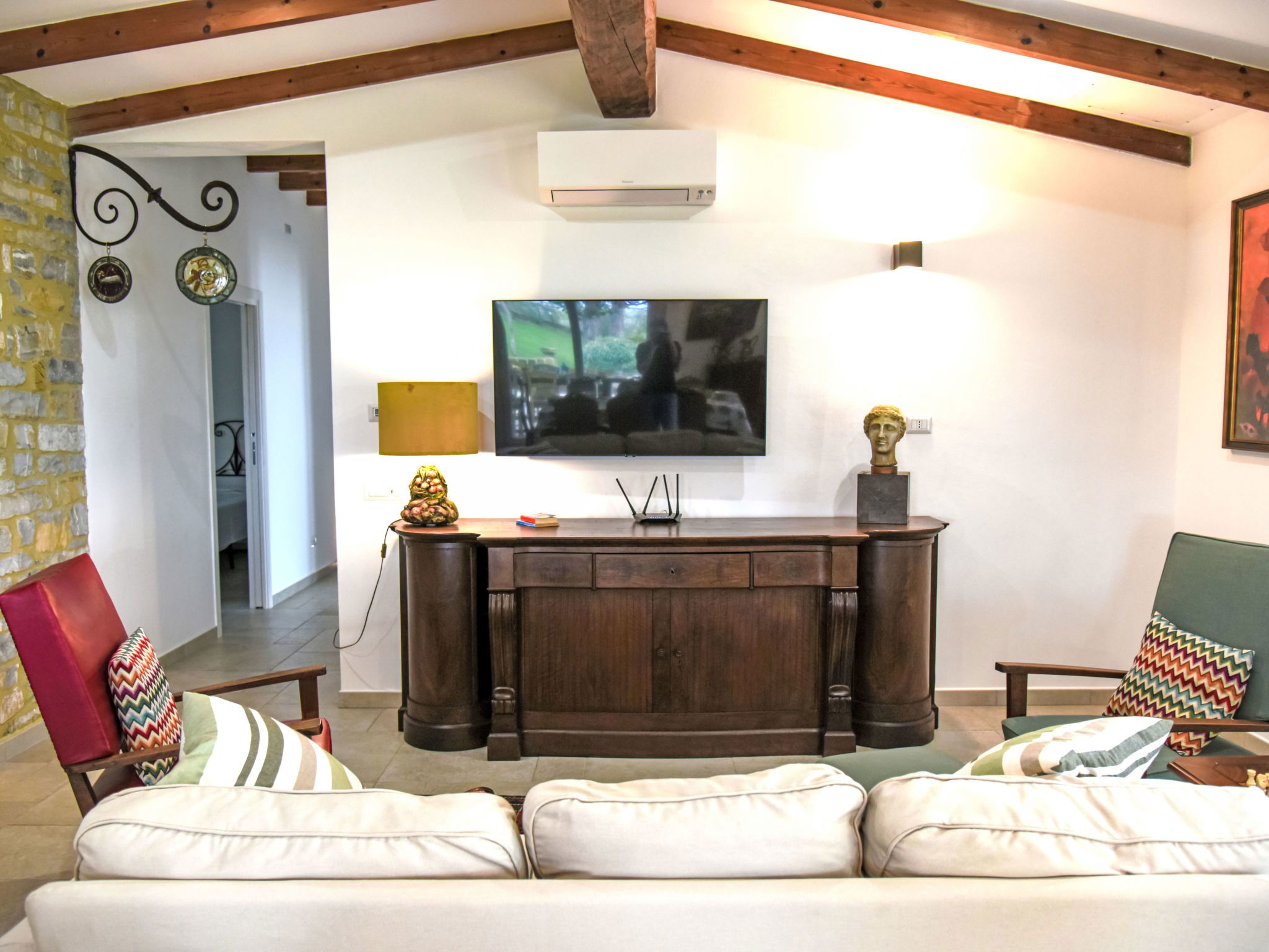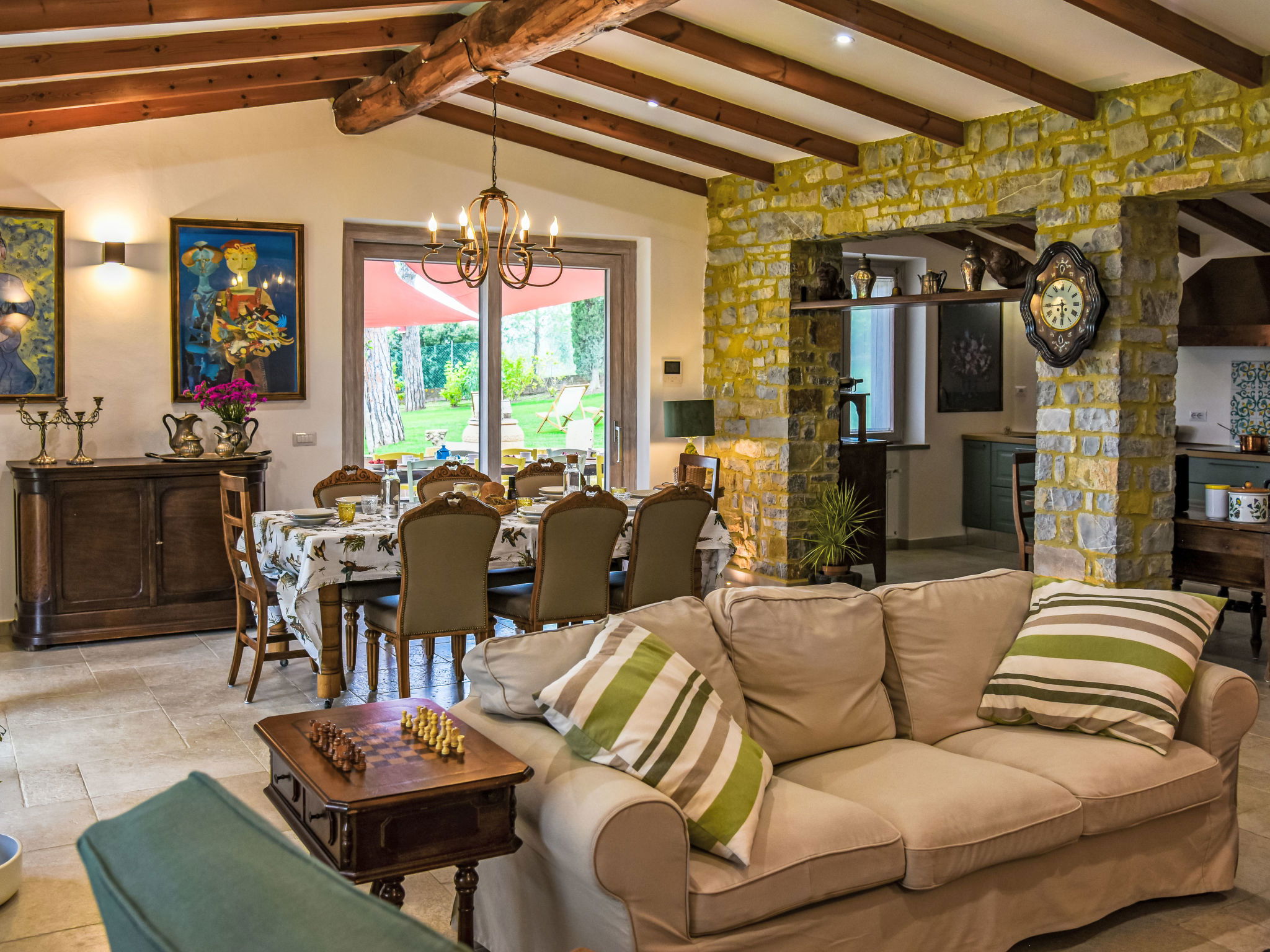 7-room villa 280 m2, on the ground floor. Spacious and bright, modern and tasteful furnishings: large living/dining room with sliding door with dining table and TV. Exit to the garden, to the terrace. 1 large double bedroom with shower/bidet/WC, hydro massage bath and TV. Exit to the garden. 3 double bedrooms, each room with shower/bidet/WC and TV. 1 room with 2 beds. Exit to the garden. Kitchen (oven, dishwasher, 4 induction hot plates, toaster, kettle, microwave, freezer, electric coffee machine). Exit to the garden, to the terrace. Bath/bidet/WC. Large terrace partly roofed. Terrace furniture, barbecue, deck chairs. Beautiful panoramic view of the countryside. Facilities: washing machine, mosquito net, children's high chair, baby cot for up to 2 year olds, hair dryer. Internet (WiFi, free). Parking (roofed, fenced). E-charging station. Please note: non-smokers only. Maximum 2 pets/ dogs allowed. Private entrance, smoke alarm, fire extinguisher. IT053013C2ZMPQAV6R