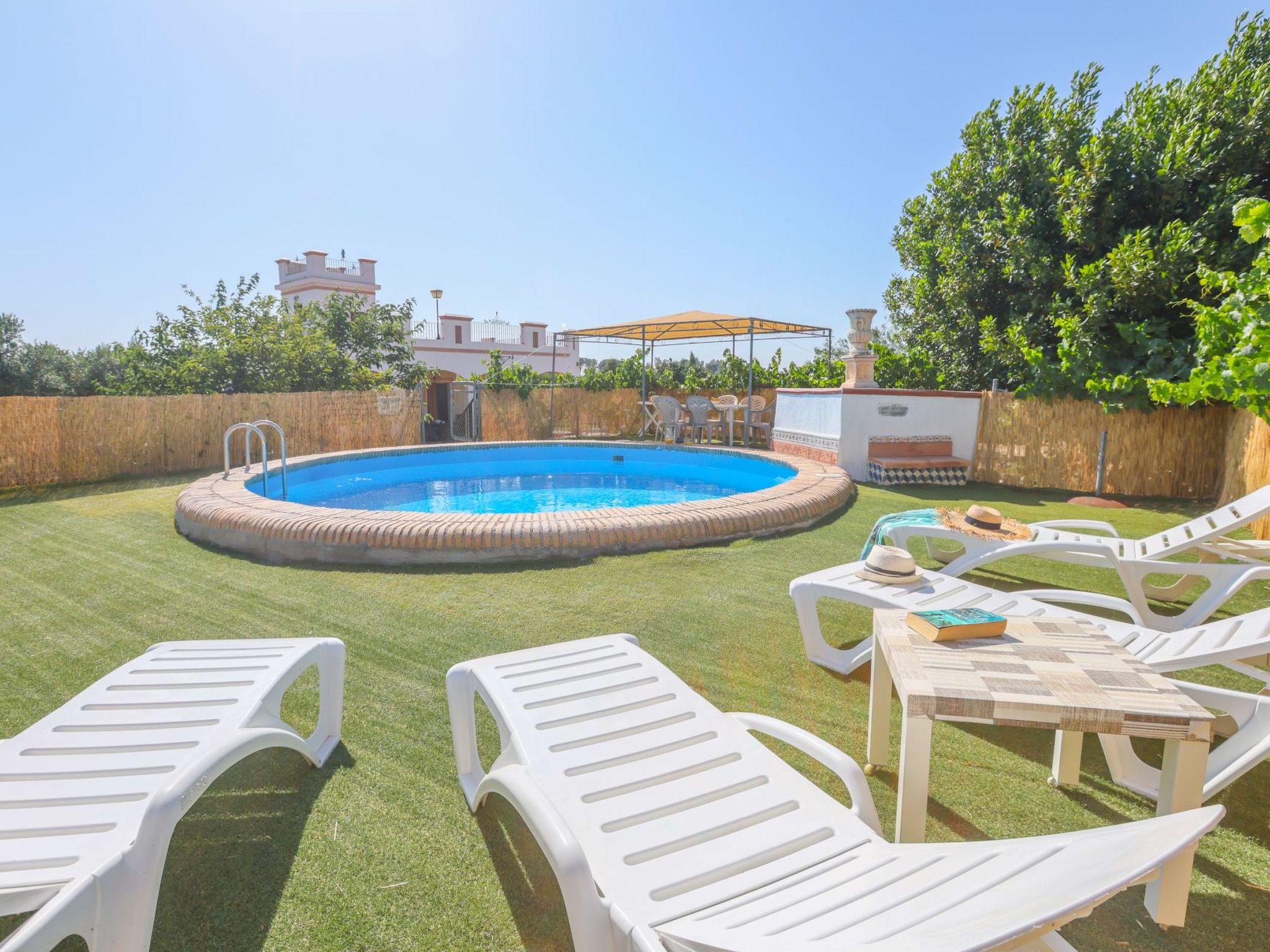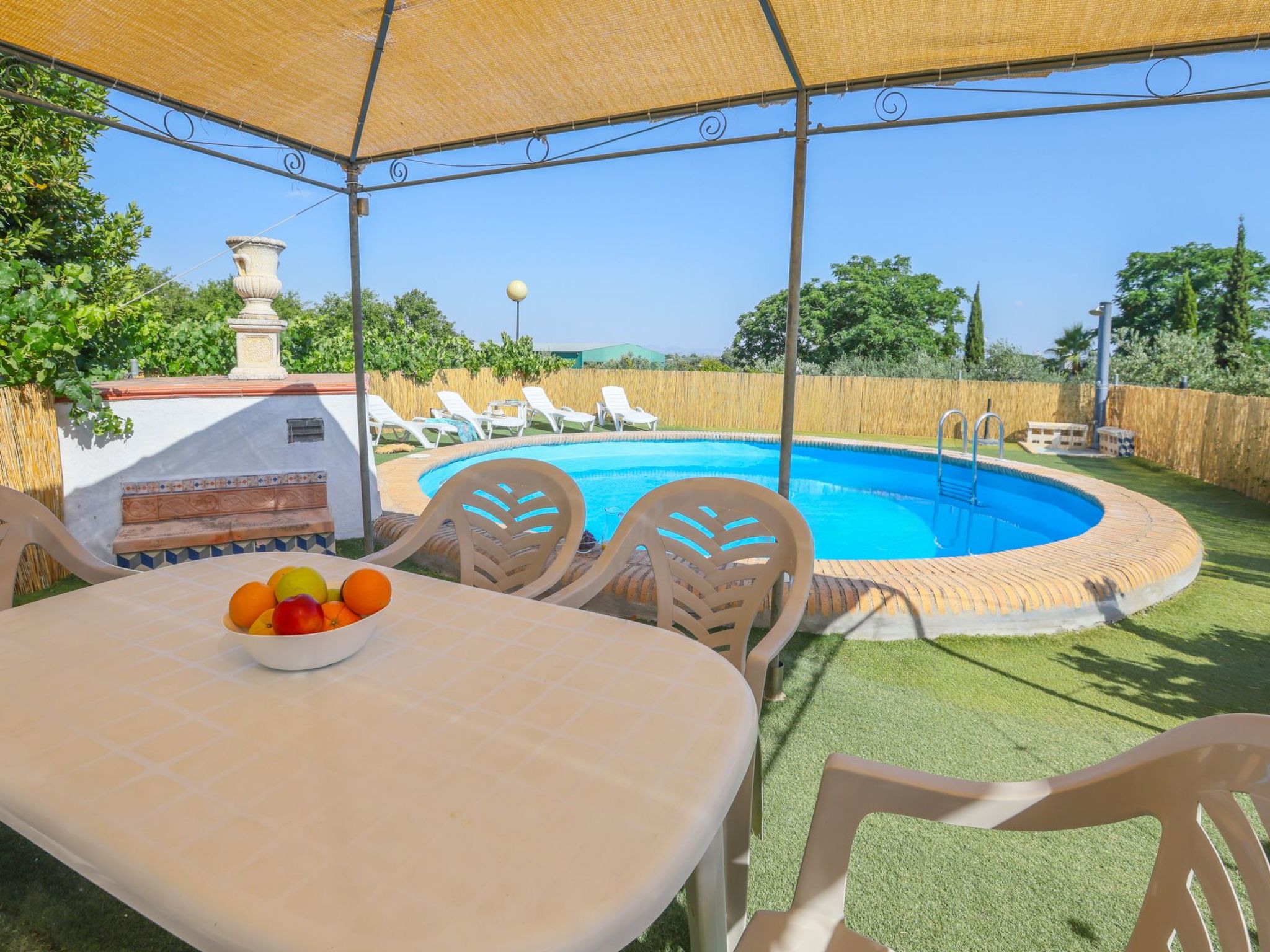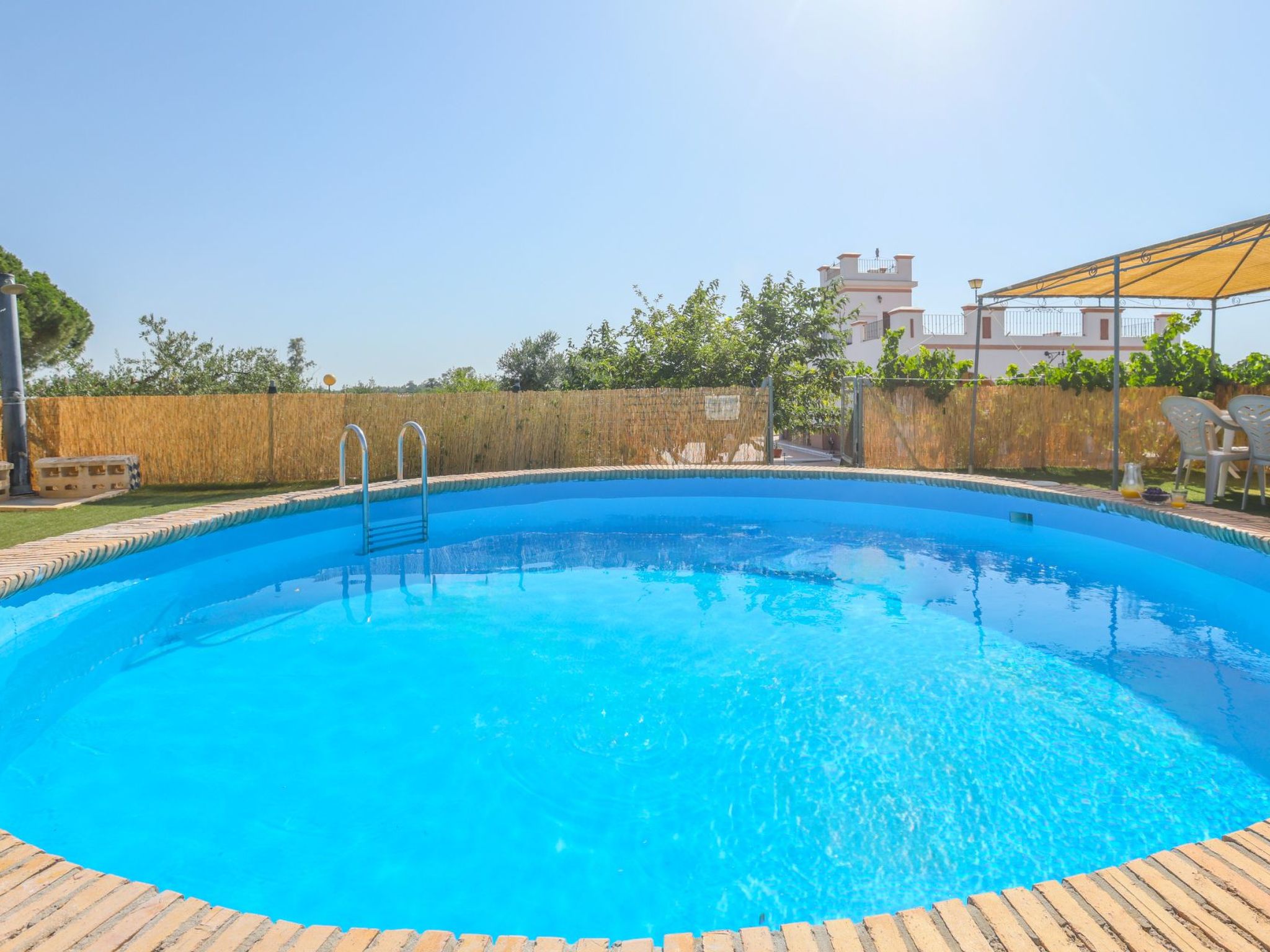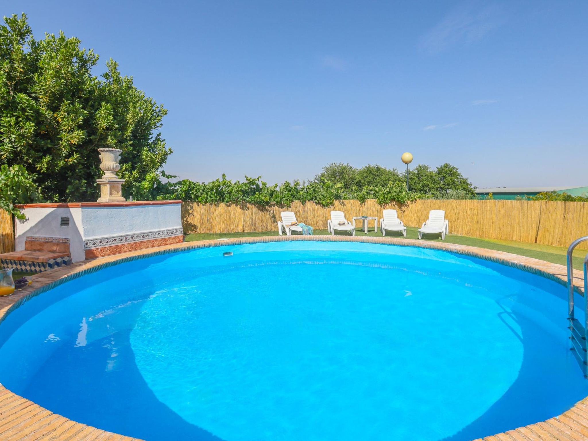 Swimming pool with a diameter of 3.5m and a depth of 1.5m in elevation. Stairs leading up to the pool. Table and sun loungers in the pool area.