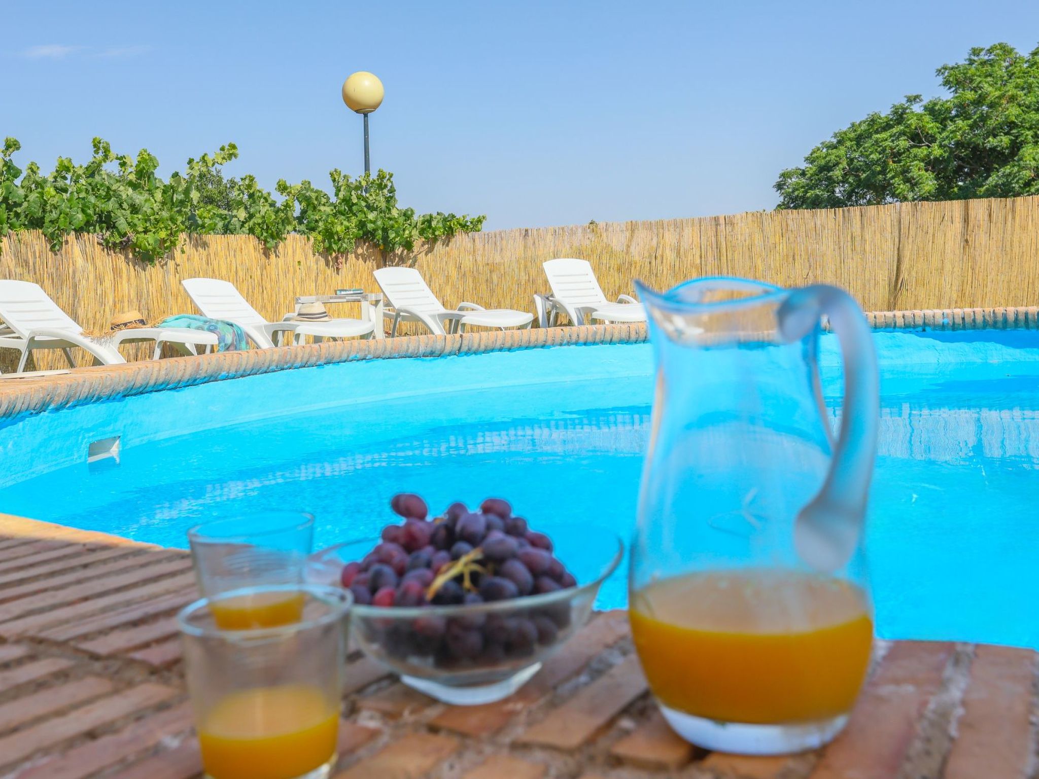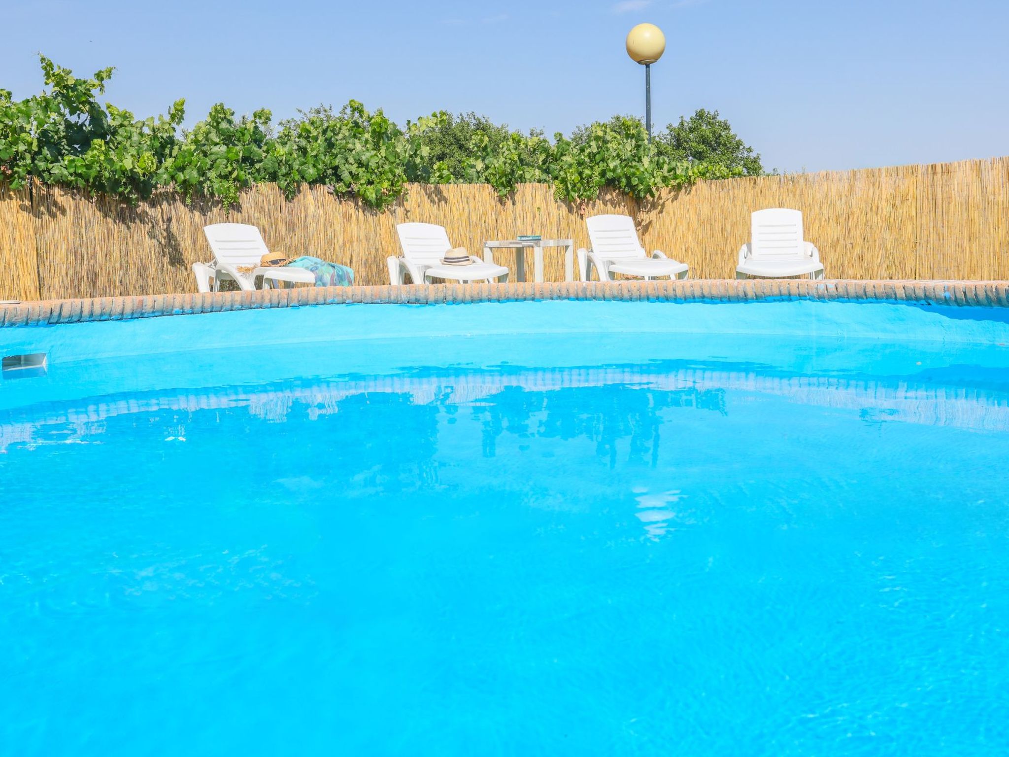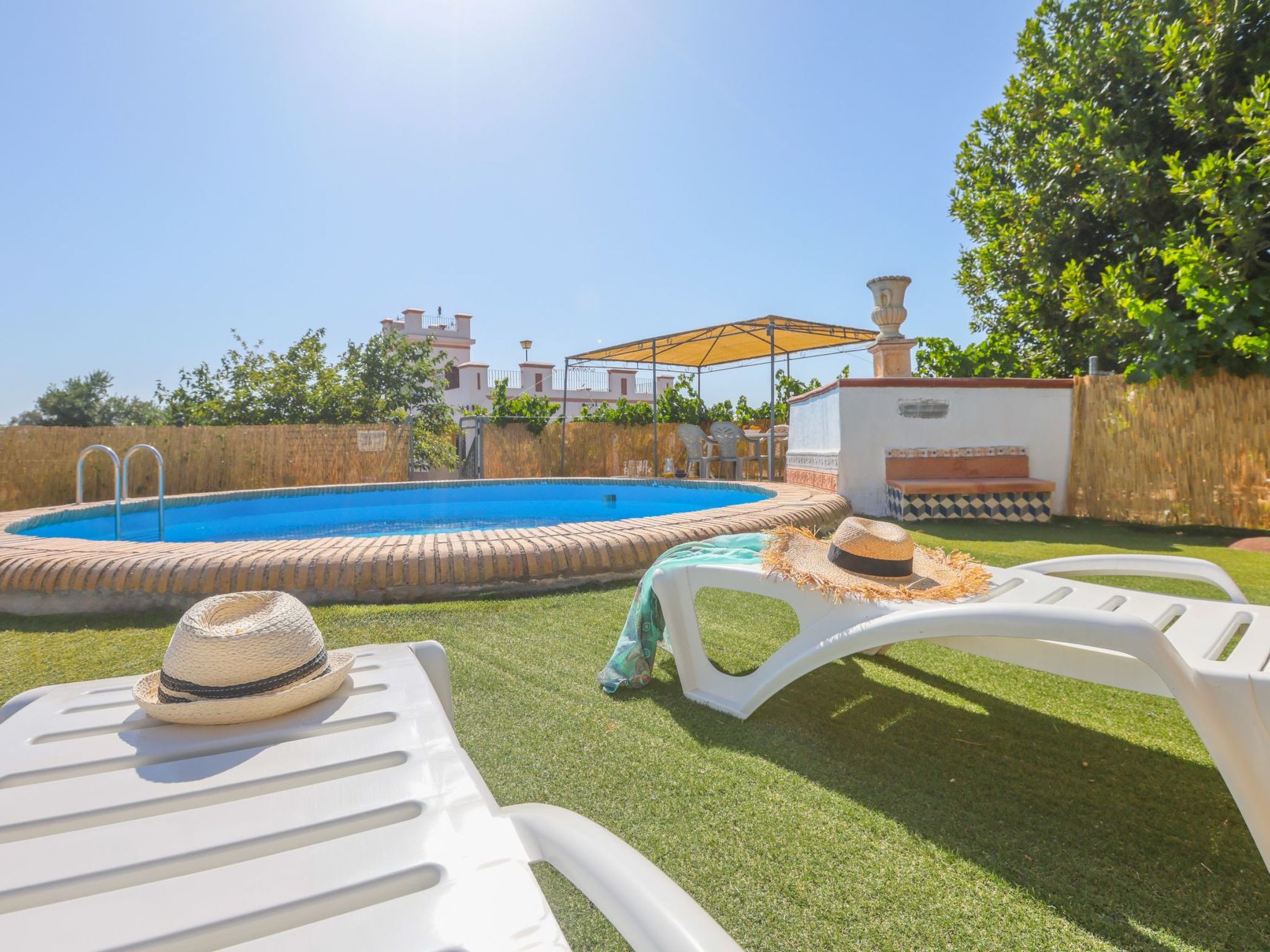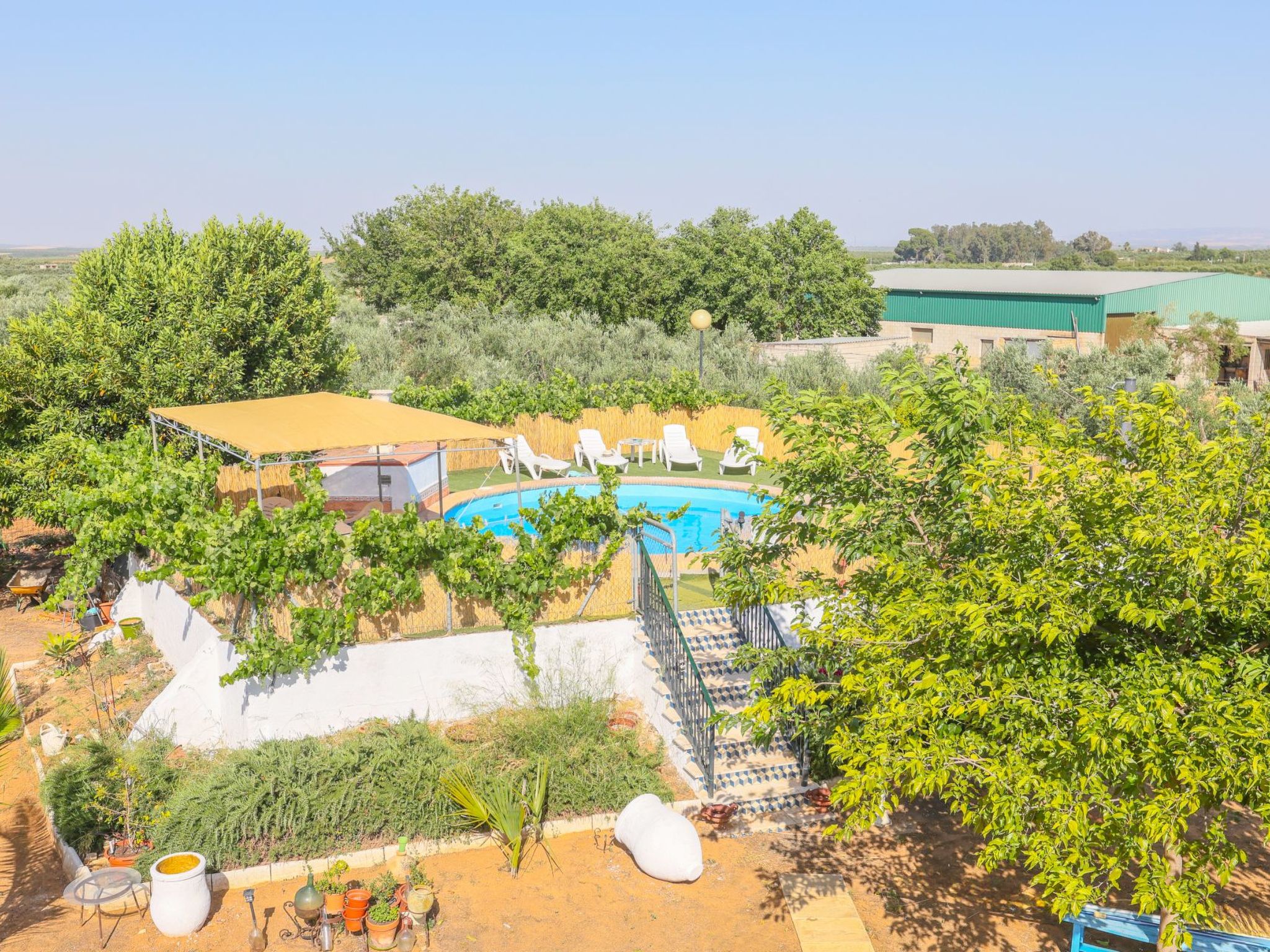 Swimming pool with a diameter of 3.5m and a depth of 1.5m in elevation. Stairs leading up to the pool. Table and sun loungers in the pool area.