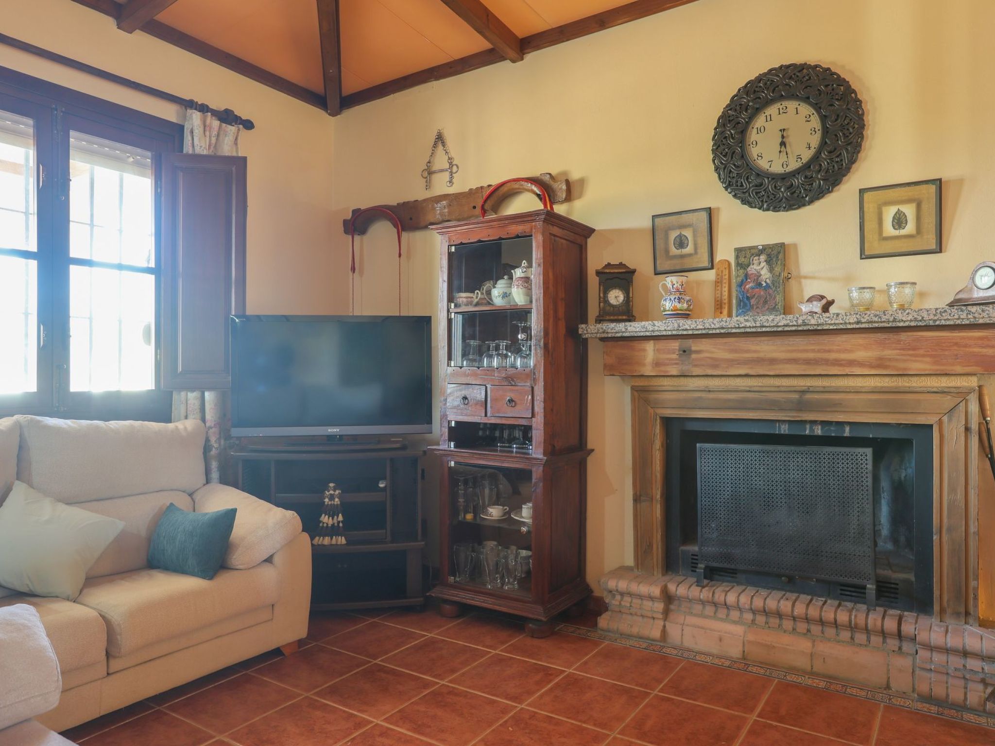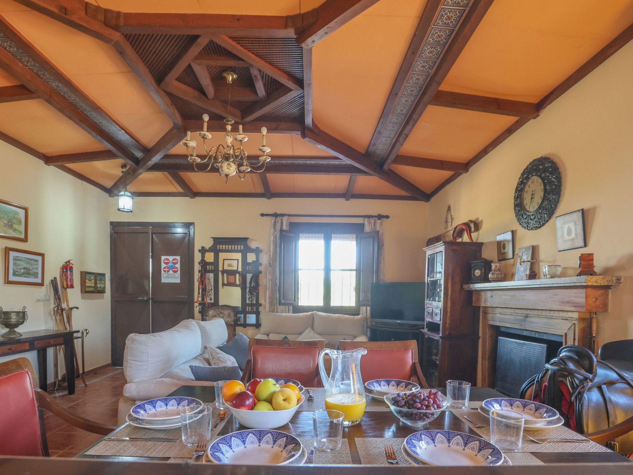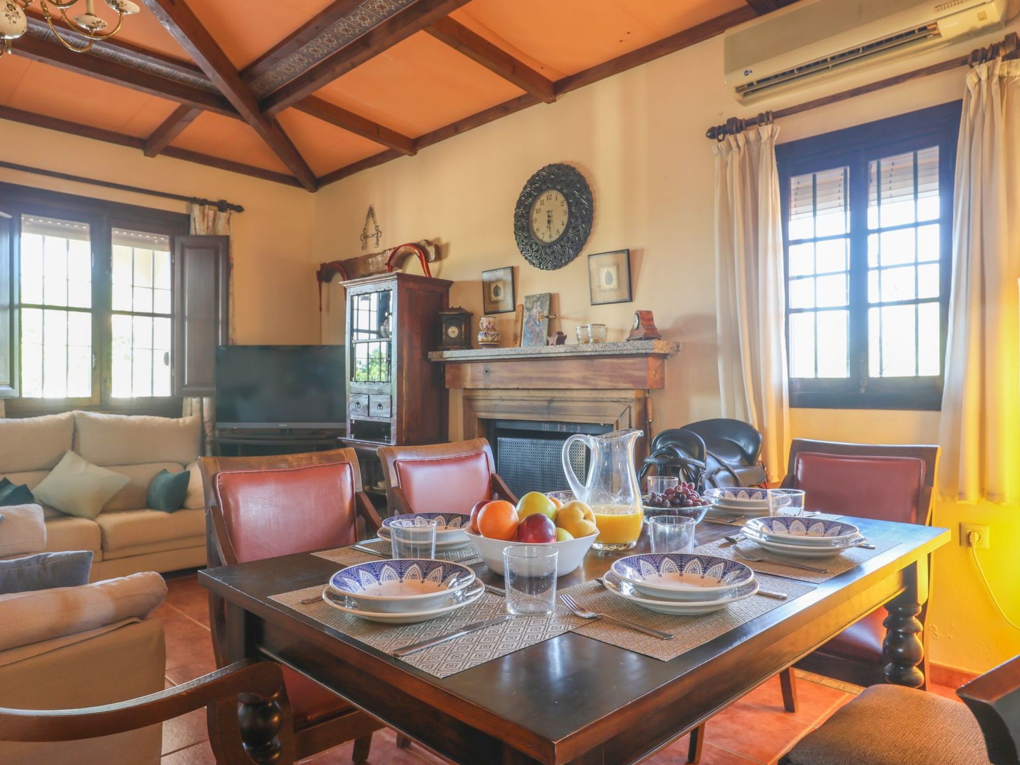 Living room with fireplace and beautiful coffered ceilings. Air conditioning, wifi.