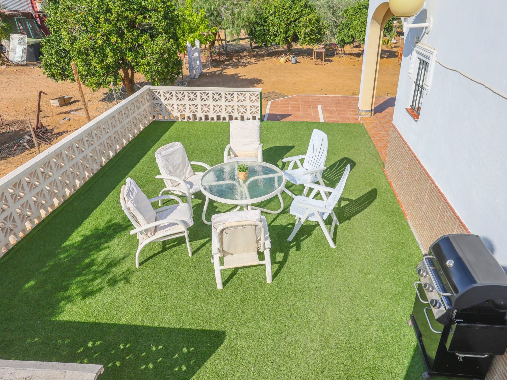Terrace with artificial grass and garden table